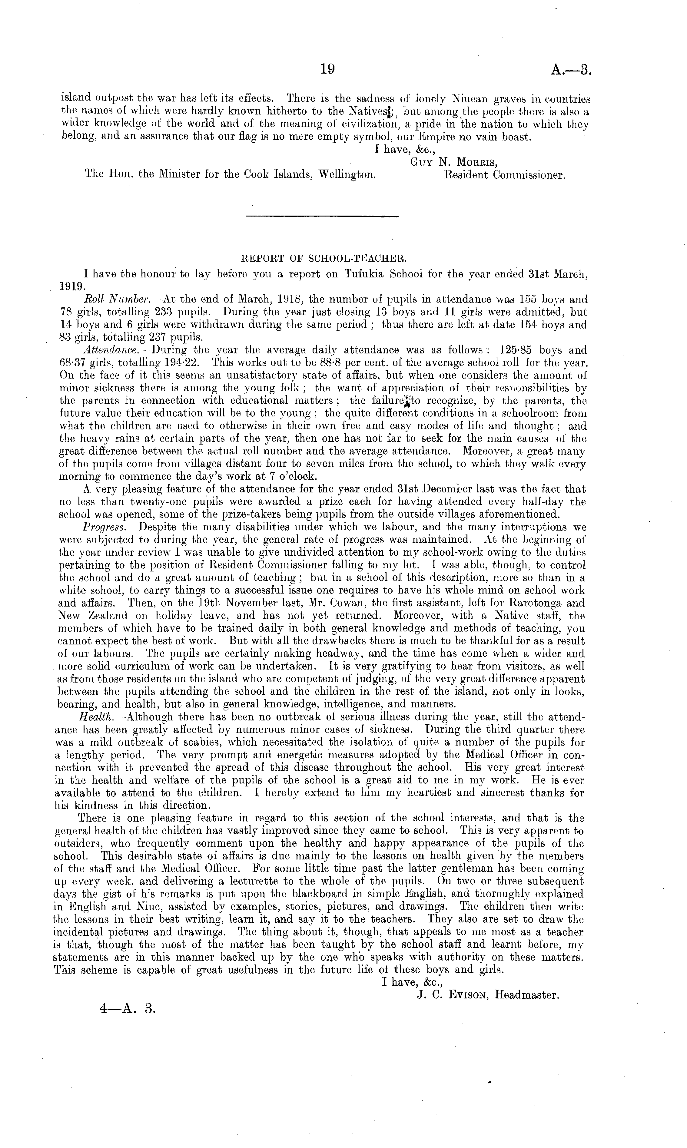 REPORT OP SCHOOL-TEACHER. I have the honour to lay before you a report on Tufukia School for the year ended 31st March, 1919. Roll Number, —At the end of March, 1918, the number of pupils in attendance was 155 boys and 78 girls, totalling 233 pupils. During the year just closing 13 boys and 11 girls were admitted, but 14 boys and 6 girls were withdrawn during the same period ; thus there are left at date 1.54 boys and 83 girls, totalling 237 pupils. Attendance— During the year the average daily attendance was as follows: 125-85 boys and 68-37 girls, totalling 194-22. This works out to be 88-8 per cent, of the average school roll for the year. On the face of it this seems an unsatisfactory state of affairs, but when one considers the amount of minor sickness there is among the young folk ; the want of appreciation of their responsibilities by the parents in connection with educational matters ; the failure||to recognize, by the parents, the future value their education will be to the young ; the quite different conditions in a schoolroom from what the children are used to otherwise in their own free and easy modes of life and thought; and the heavy rains at certain parts of the year, then one has not far to seek for the main causes of the great difference between the actual roll number and the average attendance. Moreover, a great many of the pupils come from, villages distant four to seven miles from the school, to which they walk every morning to commence the day's work at 7 o'clock. A very pleasing feature of the attendance for the year ended 31st December last was the fact that no less than twenty-one pupils were awarded a prize each for having attended every half-day the school was opened, some of the prize-takers being pupils from the outside villages aforementioned. Progress. —Despite the many disabilities under which we labour, and the many interruptions we were subjected to during the year, the general rate of progress was maintained. At the beginning of the year under review I was unable to give undivided attention to my school-work owing to the duties pertaining to the position of Resident Commissioner falling to my lot. I was able, though, to control the school and do a great amount of teaching ; but in a school of this description, more so than in a white school, to carry things to a successful issue one requires to have his whole mind on school work and affairs. Then, on the 19th November last, Mr. Cowan, the first assistant, left for Rarotonga and New Zealand on holiday leave, arid has not yet returned. Moreover, with a Native staff, the members of which have to be trained daily in both general knowledge and methods of teaching, you cannot expect the best of work. But with all the drawbacks there is much to be thankful for as a result of our labours- The pupils are certainly making headway, and the time has come when a wider and more solid curriculum of work can be undertaken. It is very gratifying to hear from visitors, as well as from those residents on the island who are competent of judging, of the very great difference apparent between the pupils attending the school and the children in the rest of the island, not only in looks, bearing, and health, but also in general knowledge, intelligence, and manners. Health. —Although there has been no outbreak of serious illness during the year, still the attendance has been greatly affected by numerous minor cases of sickness. During the third quarter there was a mild outbreak of scabies, which necessitated the isolation of quite a number of the pupils for a Lengthy period. The very prompt and energetic measures adopted by the Medical Officer in connection with it prevented the spread of this disease throughout the school. His very groat interest in the health and welfare of the pupils of the school is a great aid to me in my work. He is ever available to attend to the children. I hereby extend to him my heartiest and sincerest thanks for his kindness in this direction. There is one pleasing feature in regard to this section of the school interests, and that is the general health of the children has vastly improved since they came to school. This is very apparent to outsiders, who frequently comment upon the healthy and happy appearance of the pupils of the school. This desirable state of affairs is due mainly to the lessons on health given by the members of the staff and the Medical Officer. For some little time past the latter gentleman has been coming up every week, and delivering a lecturette to the whole of the pupils. On two or three subsequent days the gist of his remarks is put upon the blackboard, in simple English, and thoroughly explained in English and Niue, assisted by examples, stories, pictures, and drawings. The children then write the lessons in their best writing, learn it, and say it to the teachers. They also are set to draw the incidental pictures and drawings. The thing about it, though, that appeals to me most as a teacher is that, though the most of the matter has been taught by the school staff and learnt before, my statements are in this manner backed up by the one who speaks with authority on these matters. This scheme is capable of great usefulness in the future life of these boys and girls. I have, &c, J. C. Evison, Headmaster.