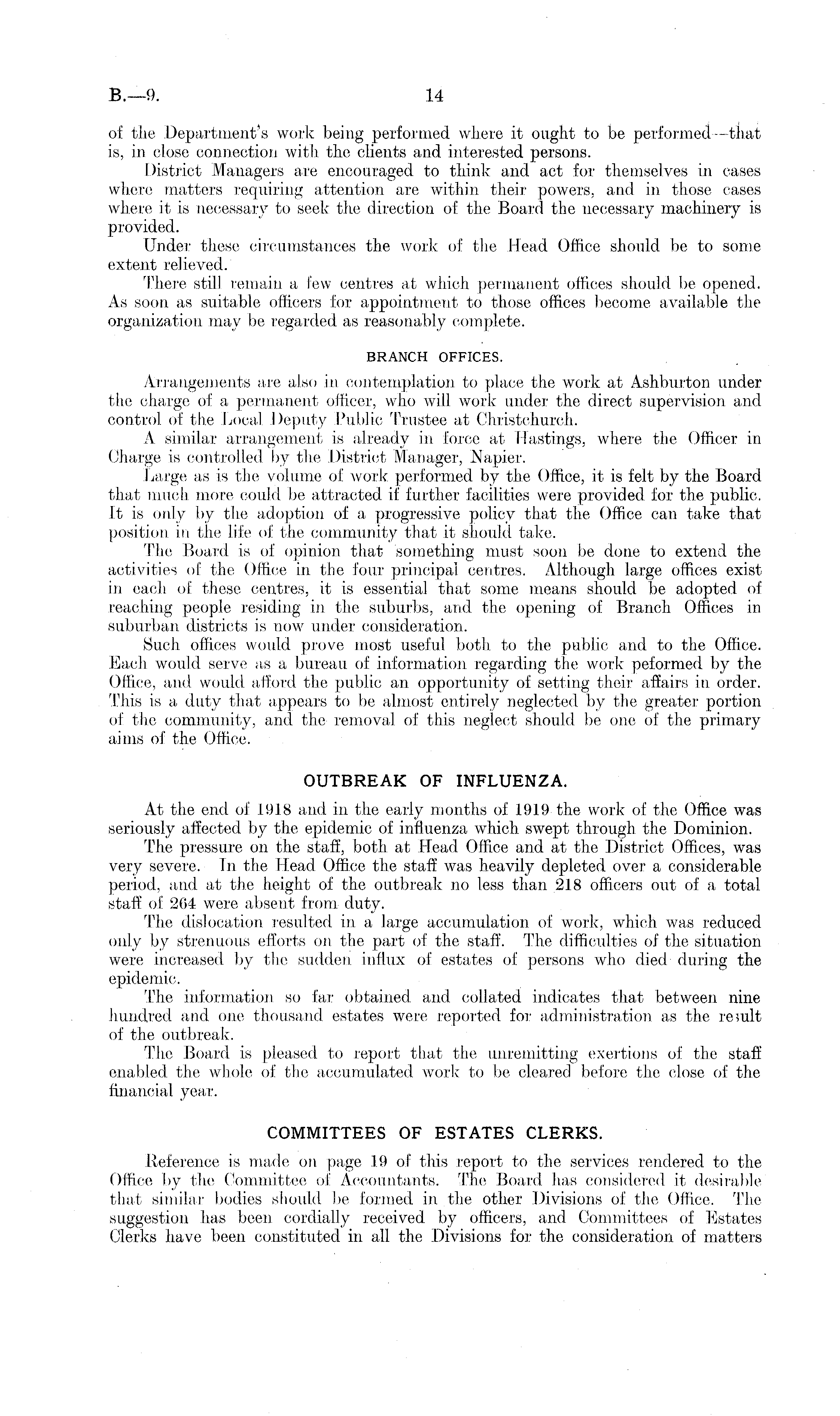 of the Department's work being performed where it ought to be performed---that is, in close connection with the clients and interested persons. District Managers are encouraged to think and act for themselves in cases where matters requiring attention are within their powers, and in those cases where it is necessary to seek the direction of the Board the necessary machinery is provided. Under these circumstances the work of the Head Office should be to some extent relieved. There still remain a lew centres at which permanent offices should be opened. As soon as suitable officers for appointment to those offices become available the organization may be regarded as reasonably complete. BRANCH OFFICES. Arrangements are also in contemplation to place the work at Ashburton under the charge of a permanent officer, who will work under the direct supervision and control of the Local. Deputy Public Trustee at Christehurch. A similar arrangement is already in force at Hastings, where the Officer in Charge is controlled by the District Manager, Napier. Large as is the volume of work performed by the Office, it is felt by the Board that much more could be attracted, if further facilities were provided, for the public. It is only by the adoption of a progressive policy that the Office can take that position, in the life of the community that it should take. The Board is of opinion that something must soon be done to extend the activities of the Office in the four principal centres. Although large offices exist in each of these centres, it is essential that some means should be adopted of reaching people residing in the suburbs, and the opening of Branch Offices in suburban districts is now under consideration. Such offices would prove most useful both to the public and to the Office. Each would serve as a bureau of information, regarding the work peformed by the Office, and would afford the public an opportunity of setting their affairs in order. This is a duty that appears to be almost entirely neglected by the greater portion of the community, and the removal of this neglect should be one of the primary aims of the Office. OUTBREAK OF INFLUENZA. At the end of 1918 and in the early months of 1919 the work of the Office was seriously affected by the epidemic of influenza which swept through the Dominion. The pressure on the staff, both at Head Office and at the District Offices, was very severe. In the Head Office the staff was heavily depleted over a considerable period, and at the height of the outbreak no less than 218 officers out of a total staff of 264 were absent from duty. The dislocation resulted in a large accumulation of work, which was reduced only by strenuous efforts on the part of the staff. The difficulties of the situation were increased by the sudden, influx of estates of persons who died during the epidemic. The information so far obtained and collated, indicates that between nine hundred and one thousand, estates were reported for administration as the remit of the outbreak. The Board is pleased to report that the unremitting exertions of the staff enabled the whole of the accumulated work to be cleared before the close of the financial year. COMMITTEES OF ESTATES CLERKS. Reference is made on page 19 of this report to the services rendered to the Office by the Committee of Accountants. The Board has considered it desirable that similar bodies should be formed in the other Divisions of the Office. The suggestion has been cordially received by officers, and Committees of Estates Clerks have been constituted in all the Divisions for the consideration, of matters