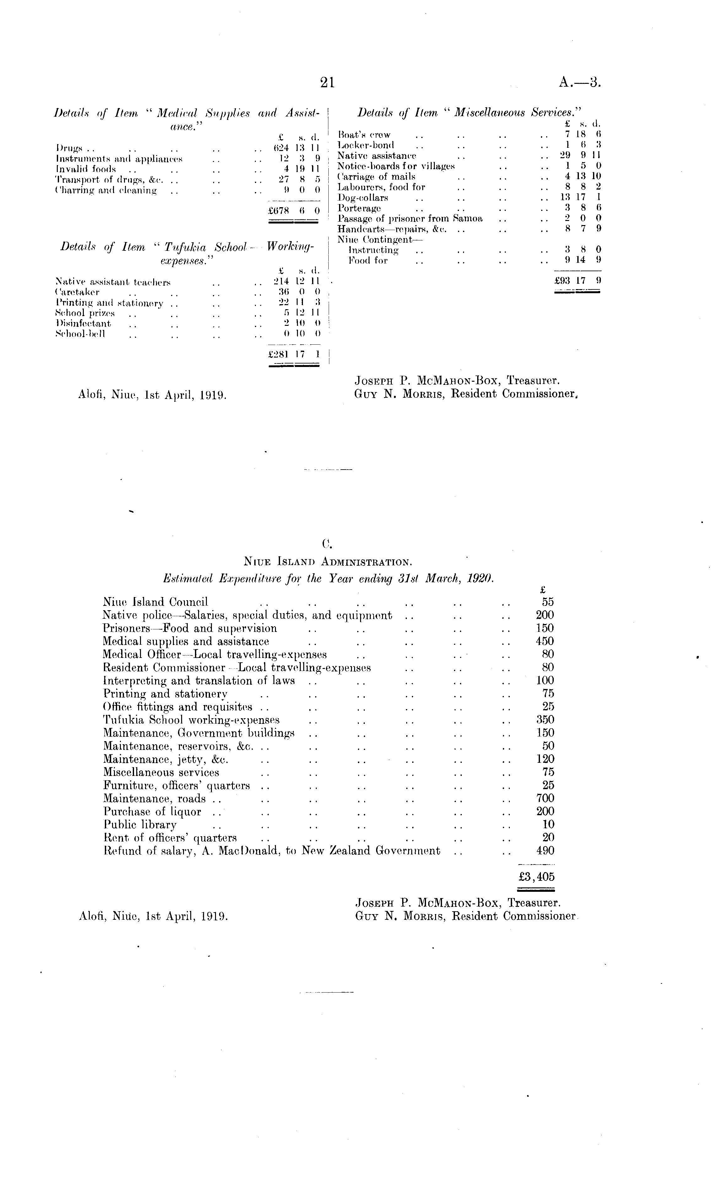 C. Niue Island Administration. Estimated Expenditure for the Year ending 31st March, 1920. £ Niue Island Council .. .. . . . . .. . . 55 Native police—Salaries, special duties, and equipment .. .. .. 200 Prisoners —Food and supervision .. .. .. .. .. 150 Medical supplies and assistance .. .. .. .. .. 450 Medical Officer—Local travelling-expenses .. .. ..' .. 80 Resident Commissioner Local travelling-expenses .. .. .. 80 Interpreting and translation of laws .. .. .. . . . . 100 Printing and stationery . . .. . . .. . . . . 75 Office fittings and requisites . . . . . . . . . . . . 25 Tufukia School working-expenses .. .. .. .. .. 350 Maintenance, Government buildings .. .. .. .. .. 150 Maintenance, reservoirs, &o. . . . . . . . . . . . . 50 Maintenance, jetty, &c. .. .. .. .. .. .. 120 Miscellaneous services . . .. .. . . . . . . 75 Furniture, officers' quarters . . . . .. . . . . . . 25 Maintenance, roads . . . . . . . . . . . . .. 700 Purchase of liquor .. . . .. .. . . . . . . 200 Public library .. .. .. .. .. .. .. 10 Rent of officers' quarters .. . . . . . . . . . . 20 Refund of salary, A. Mac-Donald, to New Zealand Government .. .. 490 £3,405 Joseph P. McMahon-Box, Treasurer. Alofi, Niiie, Ist April, 1.919. Guy N. Morris, Resident Commissioner