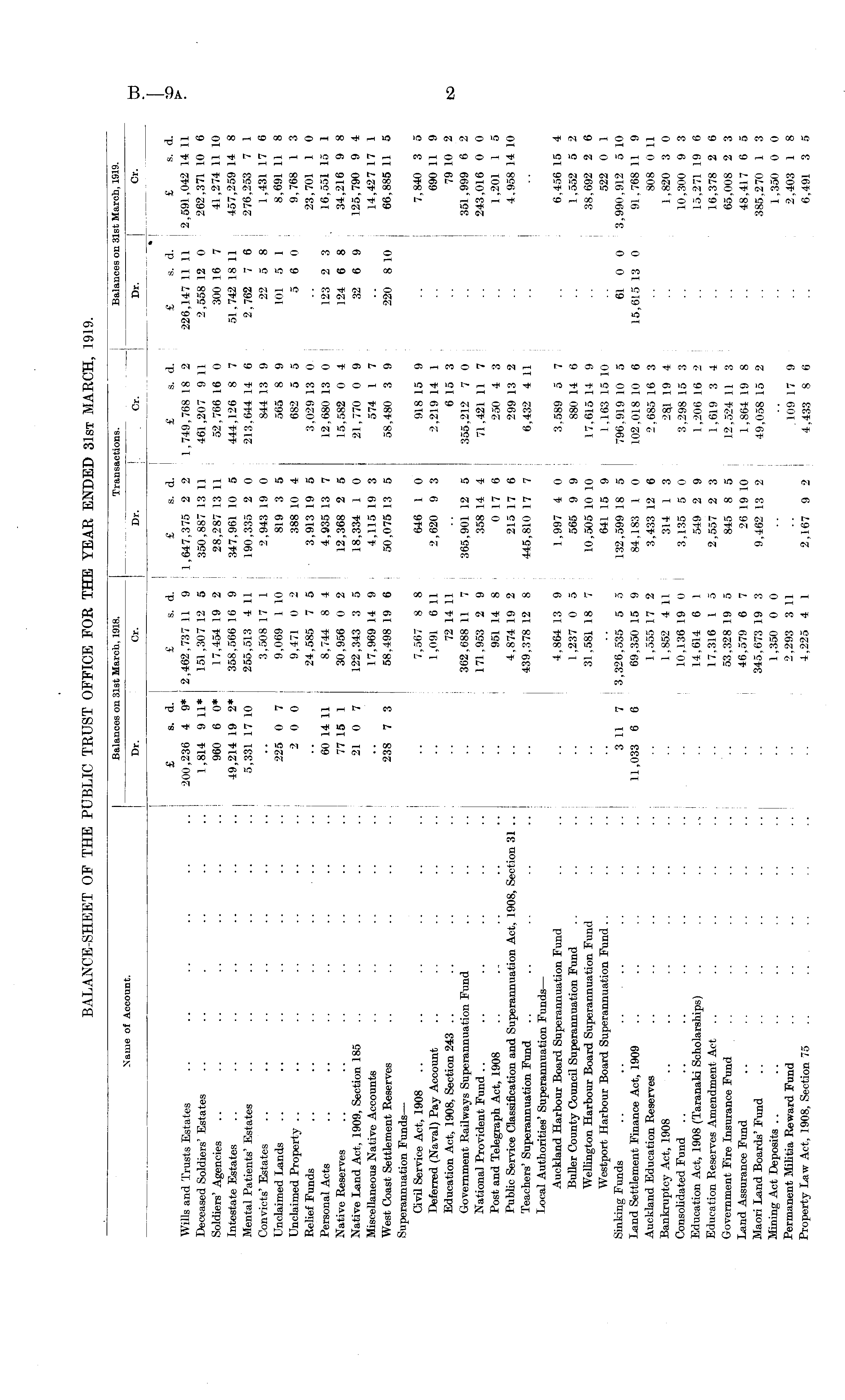 Balances on 31st March, 1918. Transactions. Balances on 31st Maroh, 1919. Name of Account. Dr. Or. Dr. Cr. Dr. I Cr. Wills and Trusts Estates Deceased Soldiers' Estates Soldiers' Agencies Intestate Estates Mental Patients' Estates Convicts' Estates Unclaimed Lands Unclaimed Property £ s. d. £ s. d. £ s. d. 200,236 4 9* 2,462,737 11 9 I 1,647,375 2 2 1,814 9 11* 151,307 12 5 i 350,887 13 11 960 6 0* 17,454 19 2 ! 28,287 13 11 49,214 19 2* 358,566 16 9 : 347,961 10 5 5,331 17 10 255,513 4 11 190,335 2 0 3,508 17 1 2,943 19 0 225 0 7 9,069 1 10 819 3 5 2 0 0 9,471 0 2 388 10 4 £ s. d. 1,749,768 18 2 461,207 9 11 52,766 16 0 444,126 8 7 213,644 14 6 844 13 9 565 8 9 682 5 5 £ s. d. £ s. d. 226,147 11 11 2,591,042 14 11 2,558 12 0 262,371 10 6 300 16 7 41,274 11 10 51,742 18 11 457,259 14 8 2,762 7 6 276,253 7 1 22 5 8 1,431 17 6 101 5 1 8,691 11 8 5 6 0 ' 9,768 1 3 * Relief Funds .. .. .. .. .. Personal Acts Native Reserves Native Land Act, 1909, Section 185 Miscellaneous Native Accounts West Coast Settlement Reserves 24,585 7 5 , 3,913 19 5 60 14 11 8,744 8 4 j 4,935 13 7 77 15 1 30,956 0 2 12,368 2 5 21 0 7 122,343 3 5 18,334 1 0 17,969 14 9 4,115 19 3 238 7 3 58,498 19 6 50,075 13 5 j 3,029 13 0 12,680 13 0 | 15,582 0 4 21,770 0 9 574 1 7 58,480 3 9 23,701 1 0 123 2 3 16,551 15 1 124 6 8 34,216 9 8 32 6 9 125,790 9 4 14,427 17 1 220 8 10 66,885 11 5 Superannuation Funds — Civil Service Act, 1908 Deferred (Naval) Pay Account Education Act, 1908, Section 243 .. Government Railways Superannuation Fund National Provident Fund Post and Telegraph Act, 1908 Public Service Classification and Superannuation Act, 1908, Section 31 .. Teachers' Superannuation Fund Local Authorities' Superannuation Funds — Auckland Harbour Board Superannuation Fund Buller County Council Superannuation Fund Welhngton Harbour Board Superannuation Fund Westport Harbour Board Superannuation Fund Sinking Funds .. .. .. ... Land Settlement Finance Act, 1909 Auckland Education Reserves Bankruptcy Act, 1908 Consolidated Fund Education Act, 1908 (Taranaki Scholarships) Education Reserves Amendment Act Government Fire Insurance Fund Land Assurance Fund Maori Land Boards' Fund Mining Act Deposits Permanent Militia Reward Fund Property Law Act, 1908, Section 75 ... 7,567 8 8 646 1 0 1,091 6 11 2,620 9 3 72 14 11 362,688 11 7 365,901 12 5 171,953 2 9 358 14 4 951 14 8 0 17 6 4,874 19 2 215 17 6 439,378 12 8 445,810 17 7 4,864 13 9 1,997 4 0 1,237 0 5 565 9 9 31,581 18 7 10,505 10 10 641 15 9 3 11 7 3,326,535 5 5 . 132,599 18 5 11,033 6 6 69,350 15 9 84,183 1 0 1,555 17 2 3,433 12 6 1,852 4 11 314 1 3 10,136 19 0 ! 3,135 5 0 14,614 6 1 549 2 9 17,316 1 5 2,557 2 3 53,328 19 5 845 8 5 46,579 6 7 26 19 10 345,673 19 3 9,462 13 2 1,350 0 0 2,293 3 11 4,225 4 1 2,167 9 2 918 15 9 2,219 14 1 6 15 3 355,212 7 0 71,421 11 7 250 4 3 299 13 2 6.432 4 11 3,589 5 7 880 14 6 17,615 14 9 1,163 15 10 796,919 10 5 102,018 10 6 2,685 16 3 28,1 19 4 3,298 15 3 1,206 16 2 1,619 3 4 12,524 11 3 1,864 19 8 49,058 15 2 .109 17 9 4.433 8 6 7,840 3 5 690 11 9 79 10 2 351,999 6 2 243,016 0 0 1,201 1 5 4,958 14 10 6,456 15 4 1,552 5 2 38,692 2 6 522 0 1 61 0 0 3,990,912 5 10 15,615 13 0 91,768 11 9 808 0 11 1,820 3 0 10,300 9 3 15,271 19 6 16,378 2 6 65,008 2 3 48,417 6 5 385,270 1 3 1,350 0 0 2,403 1 8 6,491 3 5