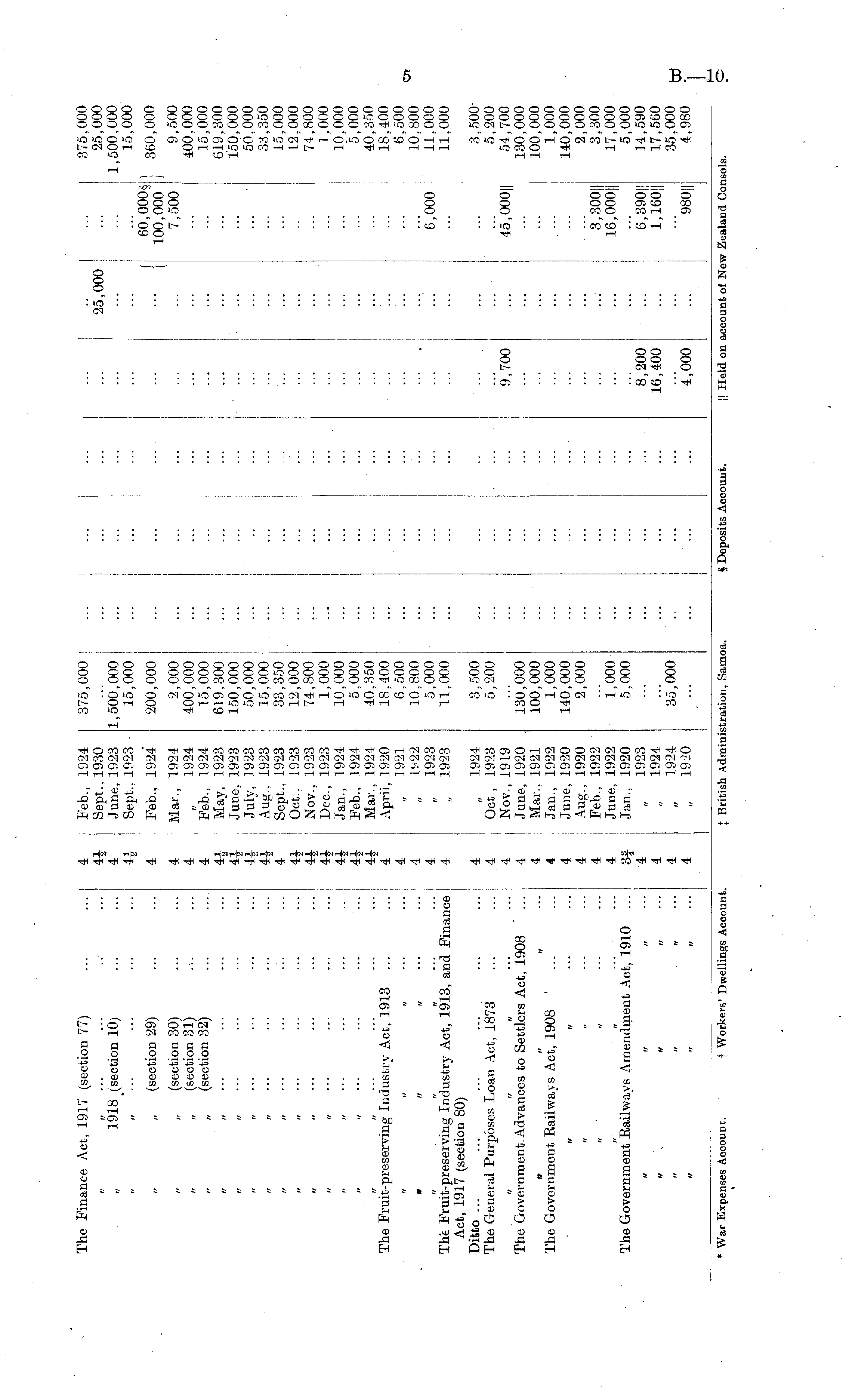 The Finance Act, 1917 (section 77) 4 41 4 41 *2 | Feb., 1924 j Sept.. 1930 June, 1923 Sept.. 1923 375,000 I 1 1 9,700 8,200 16,400 4,000 25,000 1 I f 1 60,000$ 100,000 7,500 6,000 45,000|i 3-300|| 16,000]j 6,390; 1,160|| "980!| I 375,000 25,000 1,500,000 15,000 360,000 9,500 400,000 15,000 619,300 150,000 50,000 33,350 15,000 12,000 74,800 1,000 10,000 5,000 40,350 18,400 6,500 10,800 11,000 11,000 3,500 5,200 54,700 130,000 100,000 1,000 140,000 2,000 3,300 17,000 5,000 14,590 17,560 35,000 4,980 1918 (section 10) 1,500,000 15,000 „ „ (section 29) 4 Feb., 1924 200,000 „ - (section 30) „ „ (section 31) „ „ (section 32) 4 4 4 ii ii 4i 414 4 4 4 4 Mar., 1924 1924 Feb., 1924 May, 1923 June, 1923 Julv, 1923 Aug.. 1923 Sept.. 1923 Oct.. 1923 Nov., 1923 Dec, 1923 Jan., 1924 Feb., 1924 Mar., 1924 April, 1920 „ 1921 „ 1S22 „ 1923 „ 1923 2,000 400,000 15,000 619,300 150,000 50,000 15,000 33,350 12,000 74,800 1,000 10,000 5,000 40,350 18,400 6,500 10,800 5,000 11,000 3,500 5,200 130,000 100,000 1,000 140,000 2,000 tr ir ' • • • • ■ • ■ • The Fruit-preserving Industry Act, 1913 tf rr if if a a • ■ ' The Fruit-preserving Industry Act, 1913, and Finance Act, 1917 (section 80) Ditto ... The General Purposes Loan Act, 1873 4 4 4 4 4 4 4 4 4 4 3| 4 4 4 4 „ 1924 j Oct., 1923 j Nov., 1919 I June, 1920 Mar.. 1921 : Jan., 1922 June, 1920 Aug., 1920 Feb., 1922 June, 1922 Jan., 1920 1923 1924 „ 1924 1920 The Government Advances to Settlers Act, 1908 The Government Bail ways Act, 1908 a n ... The Government Railways Amendment Act, 1910 1,000 5,000 it it tr it ii ii 35,000 ii a ii f * War Expenses Account. f Workers' Dwellings Account. J British Administration, Samoa. § Deposits Account. |j Held on account of New Zealand Consols.