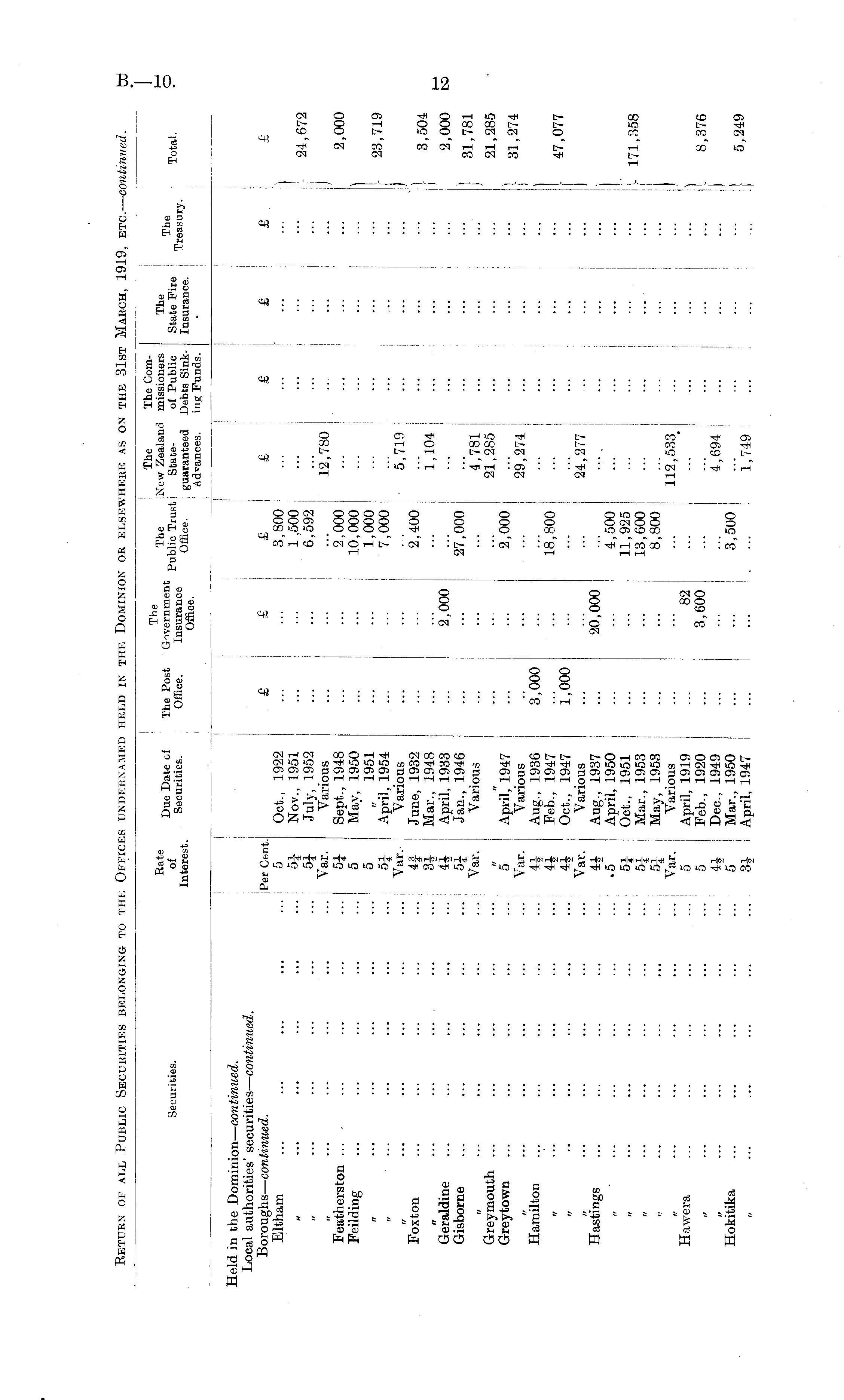 Securities. Rate of Interest. Due Date of Securities. The Post Office. The The The Com- , n , . The New Zealand missioners Government n 1 1 m - c- « n uInsurance Publ,c Trust I Stace " of Public Office Office, guaranteed Debts SinkI Advances. ing Funds. The State Fire Insurance. The Treasury. Total. . ■ eld in the Dominion — continued. Local authorities' securities — continued. Boroughs — continued. Eltham Featherston .... Feilding Foxton Geraldine Gisborne a ... ... ... Greymouth ... Grey town Hamilton n • • ... ... Hastings Hawera Hokitika Per Cent. 5 ... 51 ... 51 \ ar. ... 51 5 5 ... 5i Var., 43 31 ... 41 ... J 51 ... Var. ::: 5 Var. 4i 41 41 Var. I 41 - _ 51 ... 51 Var. 5 5 4i 5 ... . 3i I Oct., 1922 Nov., 1951 July, 1952 Various Sept., 1948 Mav, 1950 „ 1951 April, 1954 Various June, 1932 Mar., 1948 April, 1933 Jan., 1946 Various April," 1947 Various Aug., 1936 Feb., 1947 Oct., 1947 Various Aug., 1937 April, 1950 Oct.. 1951 Mar., 1953 May, 1953 Various April, 1919 Feb., 1920 Dec, 1949 Mar., 1950 April. 1947 £ I £ 2,000 £ 3,800 1.500 6,592 2,000 10,000 1,000 7,000 2,400 27,000 2,000 J £ ... 12,780 I ... 5,719 1,104 I 4,781 21,285 £ 1 £ £ ) ] 1 t £ 24,672 2,000 23,719 3,504 2,000 31,781 21,285 3,000 1 18^800 29,274 24,277 1" I 31,274 47,077 1,000 20,000 4,500 11,925 13,600 8,800 ... ) 1 171,358 82 3,600 112,533. 4,694 1 1 I 8,376 5,249 3,500 1,749 I