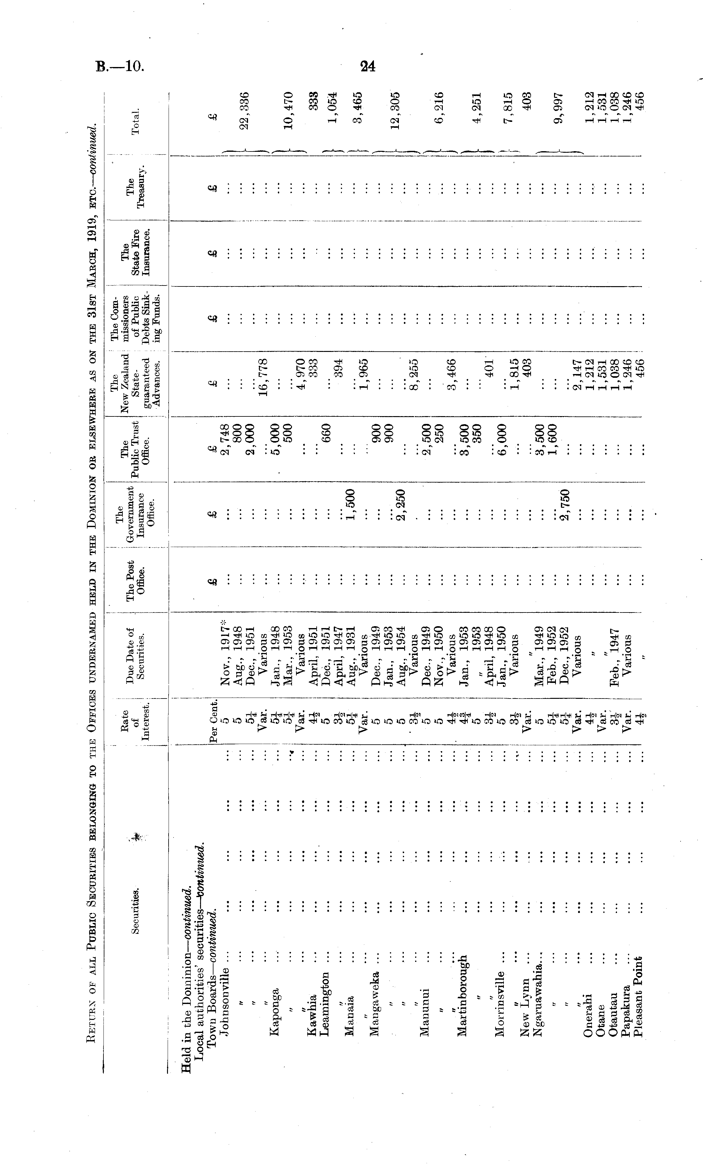 Securities. ¥ Rate of InterestDue Date of Securities. The Post Office. The Government Insurance Office. The ! TheComThe New Zealand: missioners Public Trust State- of Public Office. guaranteed Debts SinkAdvanees. ing Funds. The State Fire Insurance. The Treasury. . Total. . eld in the Dominion — continued. Local authorities' securities — Continued. Town Boards — continued. Johnsonville ... £ £ Per Cent. 5 5 "V ar. 51 51 4i *2 5 31 : 51 Var. 5 5 5 3* 5" 4* 4| 3i 5 3i Var. 51 51 Var. 41 *2 Var. j 31 d 2^ Var. 4* £ 2,748 800 2,000 £ £ £ £ £ Kaponga Kawhia Leamington ... Manaia Maugaweka ... ■ •« Nov, 1917* Aug, 1948 Dec, 1951 Various Jan, 1948 Mar, 1953 Various April, 1951 Dec, 1951 April, 1947 Aug, 1931 Various Dec. 1949 Jan, 1953 Aug, 1954 Various Dec, 1949 Nov, 1950 Various Jan, 1953 1953 April, 1948 Jan, 1950 Various l 1,500 5,000 500 660 900 900 16,778 4,970 333 394 1,965 i 22,336 10,470 333 1,054 3,465 2,250 1 12,305 Mauunui 2,500 250 8,255 u ... ... ... 1 3,466 I 1 6,216 „ ... ... ... Martinborough 3,500 350 4,251 6,000 401 Morrinsville ... 1,815 403 7,815 a •.. ... ... New Lynn Ngaruawahia... Mar, 1949 Feb, 1952 Dec, 1952 Various 3,500 1,600 ■ 403 2*750 ' 9,997 Onerahi Otane Otautau Papakura Pleasant Point Feb, "l947 Various 2,147 1,212 1,531 1,038 1,246 456 . : ■ - 1,212 1,531 1,038 1,246 456 1