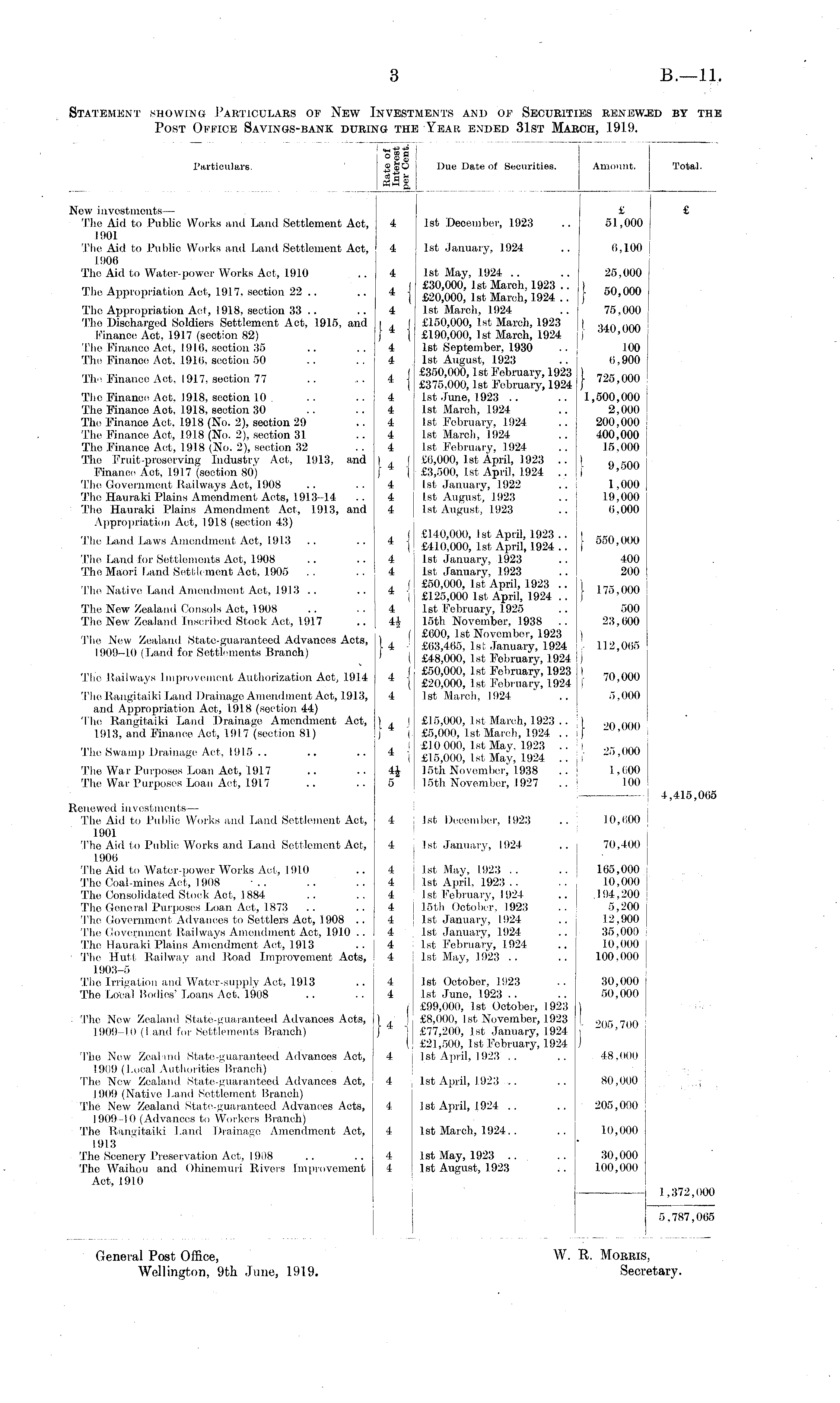 Particular's. 280 &&1 Due Date of Securities. Amount. Total. New investments —■ The Aid to Public Works and Laud Settlement Act, 1901 The Aid to Public Works and Land Settlement Act, 1906 The Aid to Water-power Works Act, 1910 4 £ 1st December, 1923 .. 51,000 £ 4 1st January, 1924 .. 6,100 4 1st May, 1924 . . .. 25,000 £30,000, 1st March, 1923 .. ) rn nnfl £20,000, 1st March, 1924 .. j °"> uu " 1st March, 1924 .. 75,000 £150,000, 1st March, 1.923 I .,.,. nnn £190,000, 1st March, 1924 ) ,iw ' uuu 1st September, 1930 .. .100 1st August, 1923 .. 6,900 £350,000,1st February, 1923 I 79r nnn £375,000,1st February, 1924 J '" d > uuu 1st .June, 1923 .. .. 1,500,000 1st March, 1924 .. 2,000 1st February, 1924. .. 200,000 1st March, 1924 .. 400,000 1st February, 1924 .. 15,000 £6,000, 1st April, 1923 .. I Q nnn £3,500, 1st April, 1.924 .. | y ' ouu 1st January, 1922 ..I 1,000 1st August, 1923 .. 1.9,000 1st August, 1923 .. 6,000 The Appropriation Act, 1917, section 22 .. 4| The Appropriation Aot, 1918, section 33 .. Tho Discharged Soldiers Settlement Act, 1915, and Finance Aot, 1917 (section 82) The Finanoe Act, 1916, section 35 The Finance Act, 1916, section 50 4 1*1 4 4 The Finance Act, 1917, section 77 * I Tho Finance Act, 1918, section 10 . The Finance Act, 1918, section 30 The Finance Act, 1918 (No. 2), section 29 The Finanoe Act, 1918 (No. 2), section 31 Tho Finance Act, 1918 (No. 2), section 32 Tho Fruit-preserving Industry Act, 1913, and Finance Act, 1917 (section 80) The Government Railways Act, 1908 Tho Hauraki Plains Amendment Acts, 1913-14 Tho Hauraki Plains Amondment Aot, 1913, and Appropriation Act, 19.1.8 (section 43) 4 4 4 4 4 Ml 4 4 4 The Land Laws Amendment Act, 1913 •I £140,000, 1st April, 1923.. I SKn ...... £410,000, 1st April, 1924 .. I 0M ' UW 1st January, 1923 .. 400 1st January, 1923 .. 200 £50,000, 1st April, 1923 .. j , 7 ~ n nn i £125,000 1st April, 1.924 .. f uo ' utM 1st February, 1925 .. 500 15th November, 1938 .. 23,600 £600, 1st November, 1923 ) £63,465, 1st January, 1924 , 112,065 £48,000, 1st February, 1924 J £50,000, 1st February, 1923 I -„ ...,., £20,000, 1st February, 1924 I '".w" 1st March, 1924 .. 5,000 The Land for Settlements Act, 1908 The Maori Land Settlement Aot, 1905 4 4 The Native Land Amendment Act, 1913 <l The New Zealand Consols Act, 1908 Tho New Zealand Inscribed Stock Act, 1917 4 44 The New Zealand State-guaranteed Advances Acts, 1909-10 (Land for Settlements Branch) H 4 j The Railways Improvement Authorization Act, 19.14 The Rangitaiki Laud Drainage Amendment Act, 1913, and Appropriation Aot, 1.918 (section 44) The Rangitaiki Land Drainage Amendment Act, 1913, and Finance Act, 1917 (section 81) 4 Mi £15,000, 1st March, 1.923 .. ! | . m „,.,, £5,000, 1st March, 1924 . . : f - u ' uuu £10 000, 1st May, 1923 .. : l .,- nnft £15,000, 1st May, 1924 .. I -"'> uuu 15th November, 1938 .. j 1,600 15th November, .1927 .. > 100 The Swamp Drainage Act, 1915 .. The War Purposes Loan Act, 1917 The War Purposes Loan Act, 1917 4 5 , 4,415,065 Renewed investments — The Aid to Public Works and Land Settlement Act, 1901 The Aid to Public; Works and Land Settlement Act, 1906 The Aid to Water-power Works Aot, 1910 The Coal-mines Act, 1908 The Consolidated Stock Aot, 1884 The General Purposes Loan Act, 1873 The Government Advances to Settlers Act, 1908 .. The Government Railways Amendment Act, 1910 .. The Hauraki Plains Amendment Act, 1913 The Hutt Railway and Road Improvement Acts, 1903-5 The Irrigation and Water-supply Act, 1913 The Local Bodies' Loans Aot. 1908 4 4 4 4 4 4 4 4 4 4 1st December, 1923 .. 10,<i00 I 1st January, 1924 .. 70,400 1st May, 1923 .. .. 165,000 1st April, 1923 .. ..' 1 10,000 1st February, 1924 .. .194,200 15th October, 1923 .. 5,200 1st January, 1924 .. 12,900 1st January, .1924 .. 35,000 1st February, 1924 .. 10,000 1st May, .1923 .. .. 100,000 4 4 1st October, 1923 .. 30,000 1st June, 1923 .. .. 50,000 £99,000, 1st October, 1923 ) £8,000, 1st November, 1923 I 9fl - 7ll0 £77,200, 1st January, 1924 1 JA) '"' U £21,500, 1st February, 1924 I 1st April, 1923 . . .. 48,000 ; The Now Zealand State-guaranteed Advances Acts, 1909-10 (Land for Settlements Branch) l,j The Now Zealand State-guaranteed Advances Act, 1909 (Local Authorities Branch) The New Zealand State-guaranteed Advances Act, 1909 (Native Land Settlement Branch) The New Zealand State-guaranteed Advances Acts, 1909-10 (Advances to Workers Branch) The Rangitaiki Land Drainage Amendment Act, 1913 The Scenery Preservation Act, 1908 The Waihou and Ohinemuii Rivers Improvement Act, 1910 4 4 4 4 1st April, 1923 ,'.. .. 80,000 1st April, 1924 .. .. 205,000 1st March, 1924.. .. 10,000 4 4 1st May, 1923 .. .. 30,000 1st August, 1923 .. 100,000 1,372,000 5,787,065