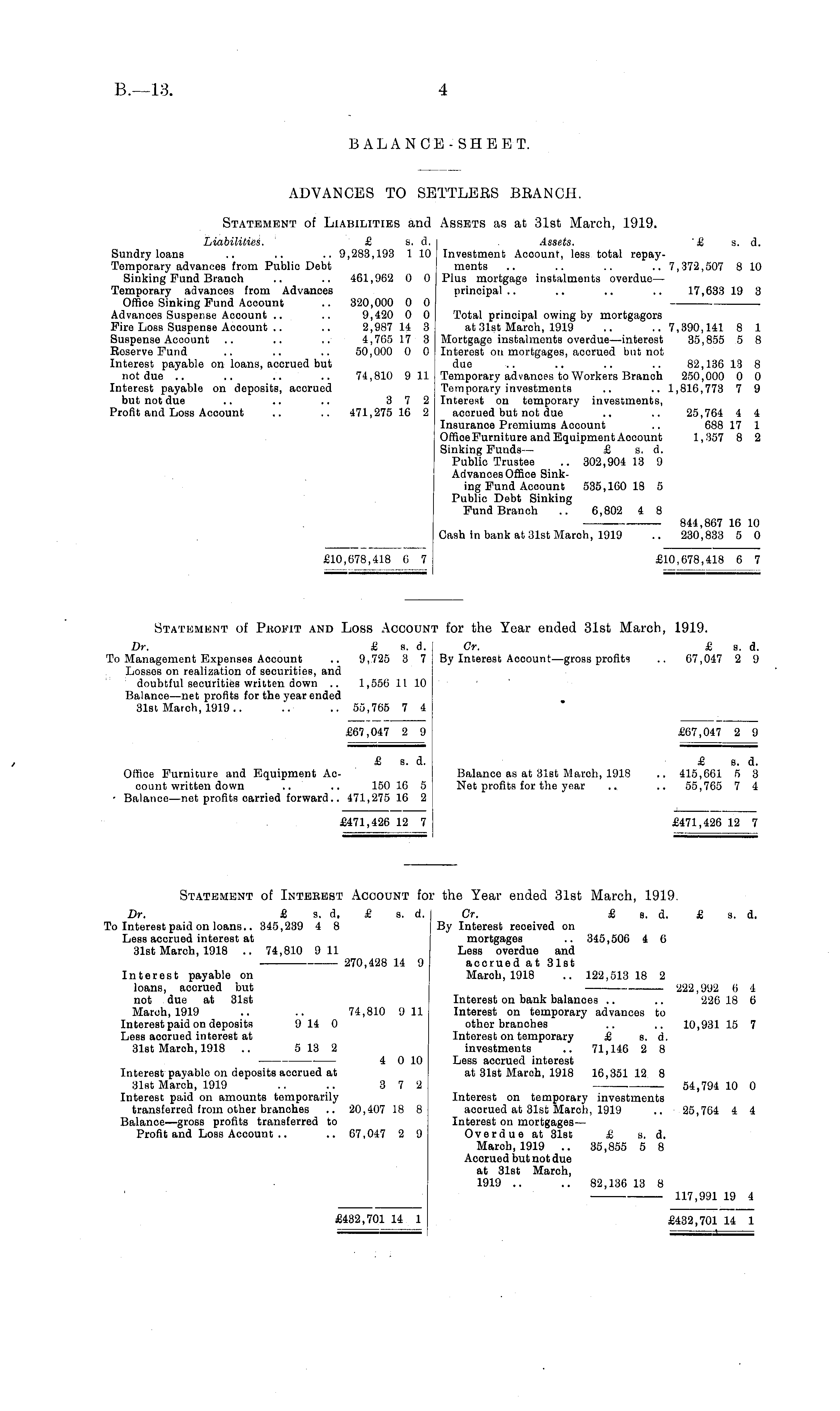 BALANCE-SHEET. ADVANCES TO SETTLERS BRANCH. Statement of Liabilities and Assets as at 31st March, 1919. Liabilities. £ s. d. , Assets. £ s. d. Sundry loans .. .. .. 9,283,193 1 10 Investment Account, less total repayTemporary advances from Public Debt ments .. .. .. .. 7,372,507 810 Sinking Fund Branch .. .. 461,962 0 0 Plus mortgage instalments overdue— Temporary advances from Advanoes principal.. .. .. .. 17,633 19 3 Office Sinking Fund Account .. 320,000 0 0 Advances Suspense Account .. .. 9,120 0 0 Total principal owing by mortgagors Fire Loss Suspense Account .. .. 2,987 14 3 at 31st March, 1919 ' .. .. 7,390,141 8 1 Suspense Acoount .. .. .. 4,765 17 3 Mortgage instalments overdue—interest 35,855 5 8 Reserve Fund .. .. .. 50,000 0 0 Interest oti mortgages, accrued but not Interest payable on loans, accrued but due .. .. .. .. 82,136 13 8 not due .. .. .. .. 74,810 911 Temporary advances to Workers Branch 250,000 0 0 Interest payable on deposits, accrued Temporary investments .. .. 1,816,773 7 9 but not due .. .. .. 3 7 2 Interest on temporary investments, Profit and Loss Account .. .. 471,275 16 2 accrued but not due .. .. 25,764 4 4 Insurance Premiums Account .. 688 17 1 Offioe Furniture and Equipment Aocount 1,357 8 2 Sinking Funds— £ s. d. Public Trustee .. 302,904 13 9 Advances Office Sinking Fund Acoount 535,160 18 5 Public Debt Sinking Fund Branch .. 6,802 4 8 — 844,867 16 10 Cash in bank at 31st Maroh, 1919 .. 230,833 5 0 £10,678,418 6 7 £10,678,418 6 7