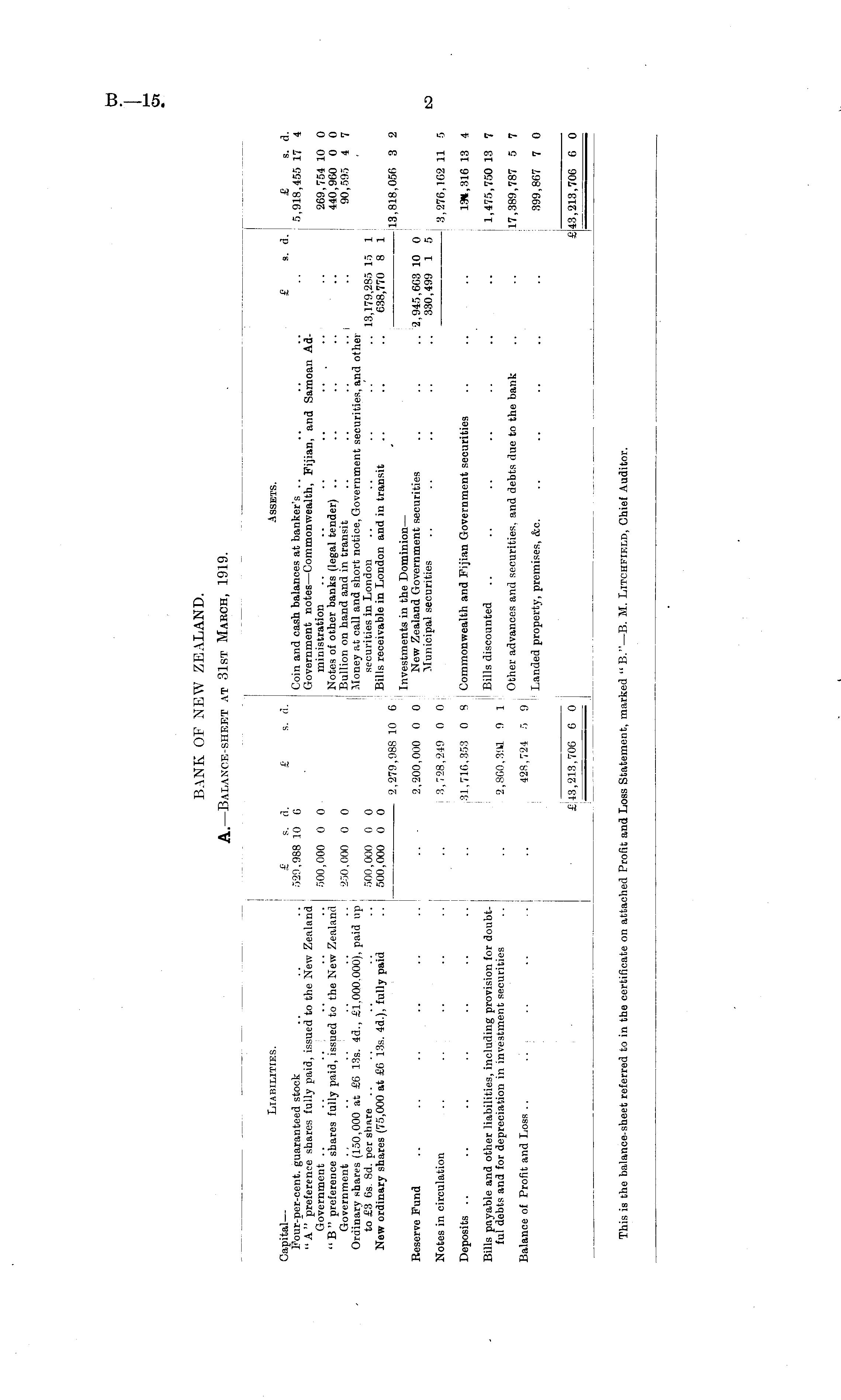• r" ii ~ i i 1 I Liabilities. Assets. Capital— £ s. a. £ s. d. £ s. d. £ s. d. Four-per-cent. guaranteed stock .. .. .. 529,988 10 0 Coin and cash balances at banker's .. .. .. .. .. 5,918,455 17 4 "A" preference shares fully paid, issued to the New Zealand Government notes —Commonwealth, Fijian, and Samoan AdGovernment .. .. .. .. .. .. 500,000 0 0 ministration .. .. .. .. .. .. .. 269,754 10 0 " B" preference shares fully paid, issued to the New Zealand Note3 of other banks (legal tender) .. .. .. .. .. 440,960 0 0 Government ., .. .. : .. .. .. -250,000 0 0 Bullion on hand and in transit .. .. .. ..I .. 90,595 4 7 Ordinary shares (150,000 at £6 13s. 4d., £1,000.000), paid up Money at call and short notice, Government securities, and other to £3 6s. 8d. per share .. .. .. .. .. 500,000 0 0 securities in London .. .. .. ..' .. 13,179,285 15 1 New ordinary shares (75,000 at £6 13s. 4d.), fully paid .. 500,000 0 0 Bills receivable in London and in transit .. .. .. 638,770 8 1 2,279,988 10 6 - : 13,818,056 3 2 Investments in the Dominion — Reserve Fund .. .. .. .. .. .. .. - 2,200,000 0 0 New Zealand Government securities .. .. .. 2,945,603 10 0 Municipal securities .. .. .. .. .. 330,499 1 5 Notes in circulation ... .. : .. .. .. .. 13,728,249 0 0 8,276,162 11 5 Deposits .. .. .. .. .. .. .. .. 31,716,353 0 8 Commonwealth and Fijian Government securities .. .. .. 13*, 316 13 4 Bills payable and other liabilities, including provision for doubt- Bills discounted .. .. .. .. .. .. .. 1,475,750 13 7 ful debts and for depreciation in investment securities .. .. 2,800,3!U 9 1 Other advances and securities, and debts due to the bank .. .. 17,389,787 5 7 Balance of Profit and Loss .. .'. , .. .. .. .. 428,724 0 9 Landed property, premises, &c. .. .. .. .. .. 399,807 7 0 £13,213,706 6 0 £43,213,700 6 0 43,213,700 6 0 This is the balance-sheet referred to in the certificate on attached Profit and Loss Statement, marked " B." — B. M. Litchfield, Chief Auditor.