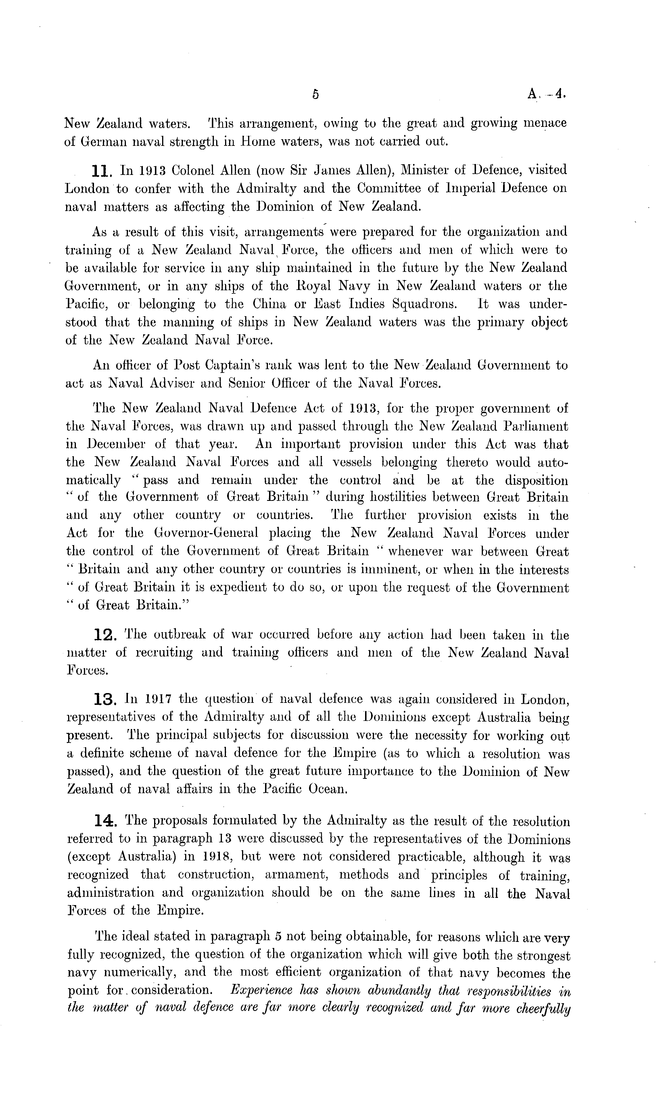 New Zealand waters. This arrangement, owing to the great and growing menace of German naval strength in Home waters, was not carried out. 11. In 1913 Colonel Allen (now Sir James Allen), Minister of Defence, visited London to confer with the Admiralty and the Committee of Imperial Defence on naval matters as affecting the Dominion of New Zealand. As a result of this visit, arrangements were prepared for the organization and training of a New Zealand Naval Force, the officers and men of which were to be available for service in any ship maintained in the future by the New Zealand Government, or in any ships of the Royal Navy in New Zealand waters or the Pacific, or belonging to the China or East Indies Squadrons. It was understood that the manning of ships in New Zealand waters was the primary object of the New Zealand Naval Force. An officer of Post Captain's rank was lent to the New Zealand Government to act as Naval Adviser and Senior Officer of the Naval Forces. The New Zealand Naval Defence Act of 1913, for the proper government of the Naval Forces, was drawn up and passed through the New Zealand Parliament in December of that year. An important provision under this Act was that the New Zealand Naval Forces and all vessels belonging thereto would automatically " pass and remain under the control and be at the disposition " of the Government of Great Britain " during hostilities between Great Britain and any other country or countries. The further provision exists in the Act for the Governor-General placing the New Zealand Naval Forces under the control of the Government of Great Britain " whenever war between Great " Britain and any other country or countries is imminent, or when in the interests " of Great Britain it is expedient to do so, or upon the request of the Government " of Great Britain." 12. The outbreak of war occurred before any action J tad been taken in the matter of recruiting and training officers and men of the New Zealand Naval Forces. 13. In 1917 the question of naval defence was again considered in London, representatives of the Admiralty and of all the Dominions except Australia being present. The principal subjects for discussion were the necessity for working out a definite scheme of naval defence for the Empire (as to which a resolution was passed), and the question of the great future importance to the Dominion of New Zealand of naval affairs in the Pacific Ocean. 14. The proposals formulated by the Admiralty as the result of the resolution referred to in paragraph 13 were discussed by the representatives of the Dominions (except Australia) in 1918, but were not considered practicable, although it was recognized that construction, armament, methods and principles of training, administration and organization should be on the same lines in all the Naval Forces of the Empire. The ideal stated in paragraph 5 not being obtainable, for reasons which are very fully recognized, the question of the organization winch will give both the strongest navy numerically, and the most efficient organization of that navy becomes the point for. consideration. Experience has shown abundantly that responsibilities in the matter of naval defence are far more clearly recognized and far more cheerfully