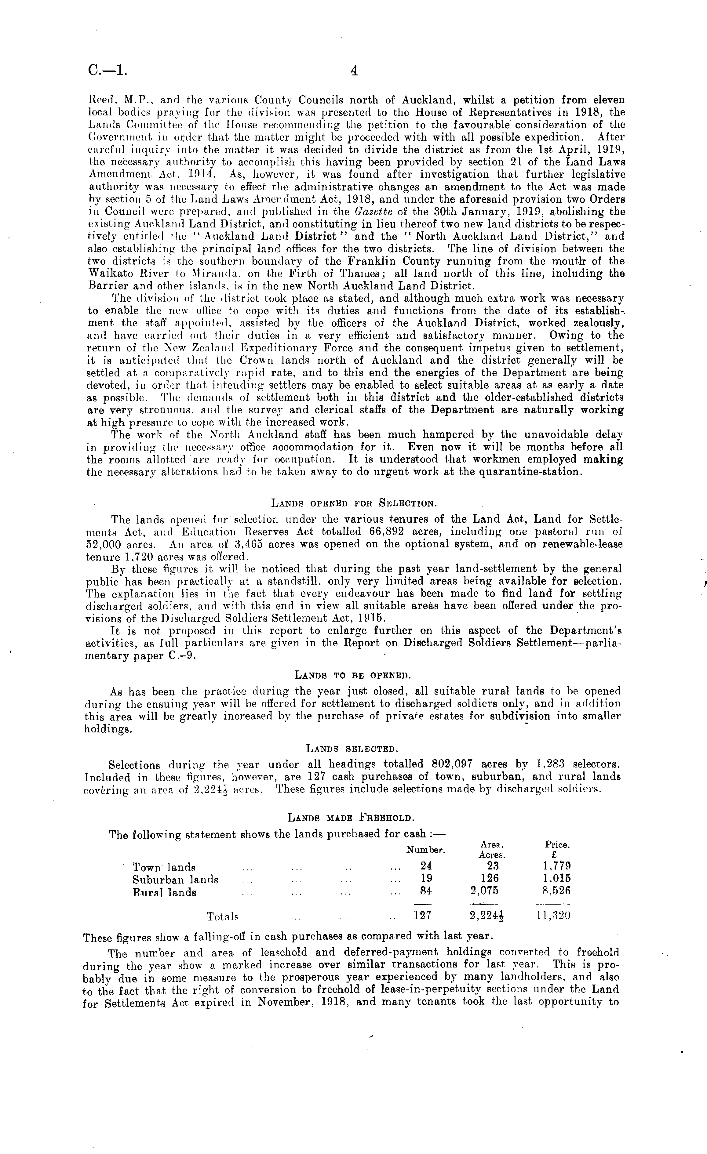 Reed, M.P., and the various County Councils north of Auckland, whilst a petition from eleven local bodies praying for the division was presented to the House of Representatives in 1918, the Lands Committee of the House recommending the petition to the favourable consideration of the Government in order that the matter might be proceeded with with all possible expedition. After careful inquiry into the matter it was decided to divide the district as from the Ist April, 1919, the necessary authority to accomplish this having been provided by section 21 of the Land Laws Amendment Act, 1914. As, however, it was found after investigation that further legislative authority was necessary to effect the administrative changes an amendment to the Act was made by section 5 of the Land Laws Amendment Act, 1918, and under the aforesaid provision two Orders in Council were prepared, and published in the Gazette of the 30th January, 1919, abolishing the existing Auckland Land District, and constituting in lieu thereof two new land districts to be respectively entitled the "Auckland Land District" and the "North Auckland Land District," and also establishing the principal land offices for the two districts. The line of division between the two districts is the southern boundary of the Franklin County running from the mouth of the Waikato River to Miranda, on the Firth of Thames; all land north of this line, including the Barrier and other islands, is in the new North Auckland Land District. The division of the district took place as stated, and although much extra work was necessary to enable the new office to cope with its duties and functions from the date of its establishment the staff appointed, assisted by the officers of the Auckland District, worked zealously, and have carried out their duties in a very efficient and satisfactory manner. Owing to the return of the New Zealand Expeditionary Force and the consequent impetus given to settlement, it is anticipated that the Crown lands north of Auckland and the district generally will be settled at a comparatively rapid rate, and to this end the energies of the Department are being devoted, in order that intending settlers may be enabled to select suitable areas at as early a date as possible. The demands of settlement both in this district and the older-established districts are very strenuous, and the survey and clerical staffs of the Department are naturally working at high pressure to cope with the increased work. The work of the North Auckland staff has been much hampered by the unavoidable delay in providing the necessary office accommodation for it. Even now it will be months before all the rooms allotted are ready for occupation. It is understood that workmen employed making the necessary alterations had to be taken away to do urgent work at the quarantine-station. Lands opened for Selection. The lands opened for selection under the various tenures of the Land Act, Land for Settlements Act, and Education Reserves Act totalled 66,892 acres, including one pastoral run of 52,000 acres. An area of 3,465 acres was opened on the optional system, and on renewable-lease tenure 1,720 acres was offered. By these figures it will be noticed that during the past year land-settlement by the general public has been practically at a standstill, only very limited areas being available for selection. The explanation lies in the fact that every endeavour has been made to find land for settling discharged soldiers, and with this end in. view all suitable areas have been offered under the provisions of the Discharged Soldiers Settlement Act, 1915. It is not proposed in this report to enlarge further on this aspect of the Department's activities, as full particulars are given in the Report on Discharged Soldiers Settlement parliamentary paper C.-9. Lands to be opened. As has been the practice during the year just closed, all suitable rural lands to be opened during the ensuing year will be offered for settlement to discharged soldiers only, and in addition this area will be greatly increased by the purchase of private estates for subdivision into smaller holdings. Lands selected. Selections during the year under all headings totalled 802,097 acres by 1,283 selectors. Included in these figures, however, are 127 cash purchases of town, suburban, and rural lands covering an area of 2,224| acres. These figures include selections made by discharged soldiers. Lands made Freehold. The following statement shows the lands purchased for cash : — , T , Area. Price. Number. Ac| . es £ Town lands ... ... ... ... 24 23 1,779 Suburban lands ... ... ... ... 19 126 1,015 Rural lands ... ... ... ~. 84 2,075 8,526 Totals ... ... 127 2,224£ 11,320 These figures show a falling-off in cash purchases as compared with last year. The number and area of leasehold and deferred-payment holdings converted to freehold during the year show a marked increase over similar transactions for last year. This is probably due in some measure to the prosperous year experienced by many landholders, and also to the fact that the right of conversion to freehold of lease-in-perpetuity sections under the Land for Settlements Act expired in November, 1918, and many tenants took the last opportunity to