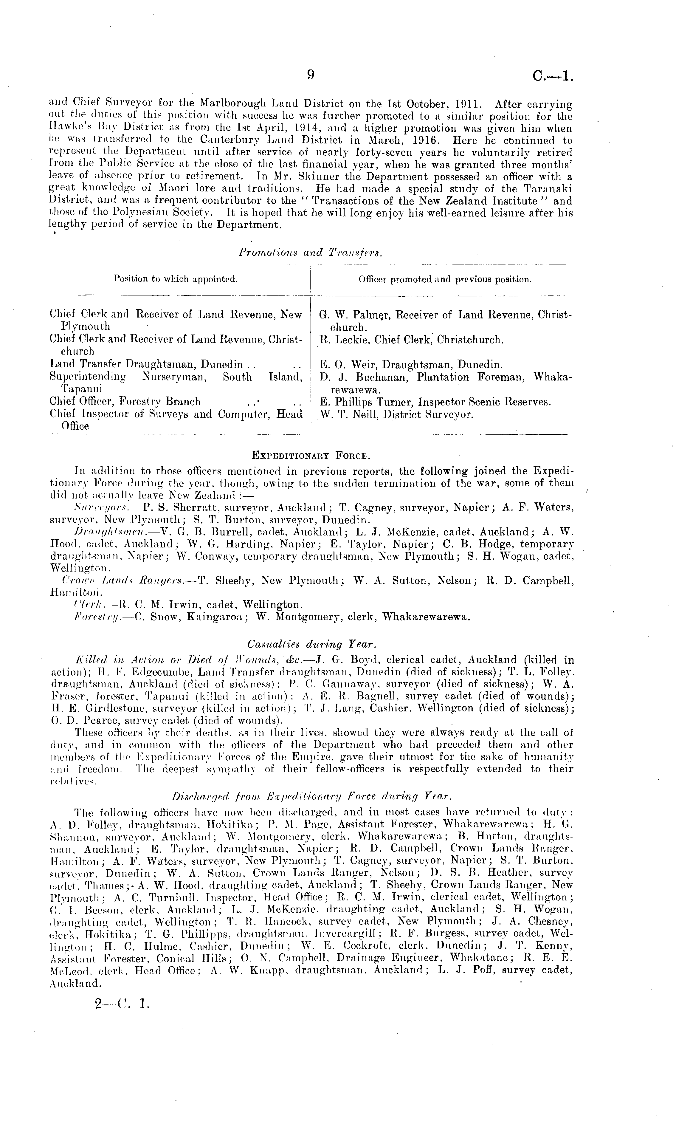 and Chief Surveyor for the Marlborough Land District on the Ist October, 191 L After carrying out the duties of this position with success he was further promoted to a similar position for the Hawke's Bay District as from the Ist April, 1914, and a higher promotion was given him when he was transferred to the Canterbury Land District in Marcli, 1916. Here he continued to represent the Department until after service of nearly forty-seven years he voluntarily retired from the Public Service at the close of the last financial year, when he was granted three months' leave of absence prior to retirement. In Mr. Skinner the Department possessed an officer with a great knowledge of Maori lore and traditions. He had made a special study of the Taranaki District, and was a frequent contributor to the " Transactions of the New Zealand Institute " and those of the Polynesian Society. It is hoped that he will long enjoy his well-earned leisure after his lengthy period of service in the Department.