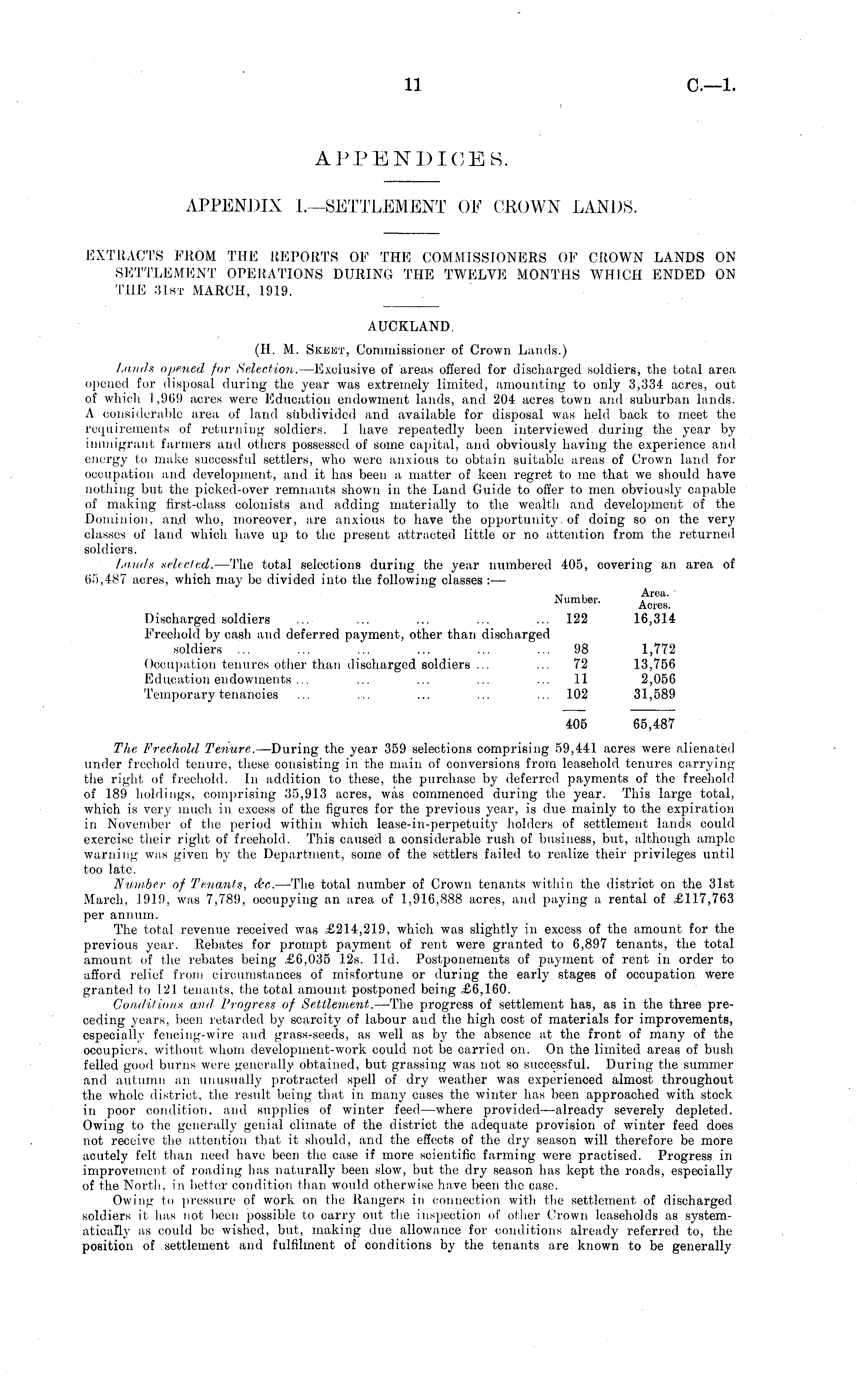 EXTRACTS FROM THE REPORTS OF THE COMMISSIONERS OF CROWN LANDS ON SETTLEMENT OPERATIONS DURING THE TWELVE MONTHS WHICH ENDED ON THE 31st MARCH, 1919. AUCKLAND, (H. M. Skhht, Commissioner of Crown Lands.) Lands opened for Selection. —Exclusive of areas offered for discharged soldiers, the total area opened for disposal during the year was extremely limited, amounting to only 3,334 acres, out of which 1,969 acres were Education endowment hinds, and 204 acres town and suburban lands. A considerable area of land subdivided and available for disposal was held back to meet the requirements of returning soldiers. I have repeatedly been interviewed during the year by immigrant farmers and others possessed of some capital, and obviously having the experience and energy to make successful settlers, who were anxious to obtain suitable areas of Crown land for occupation and development, and it has been a matter of keen regret to me that we should have nothing but the picked-over remnants shown in the Land Guide to offer to men obviously capable of making first-class colonists and adding materially to the wealth and development of the Dominion, and who, moreover, are anxious to have the opportunity .of doing so on the very classes of land which have up to the present attracted little or no attention from the returned soldiers. Lauds selected. —The total selections during the year numbered 405, covering an area of 65,487 acres, which may be divided into the following classes : — Number. jg£ Discharged soldiers ... ... ... ... 122 16,314 Freehold by cash and deferred payment, other than discharged soldiers ... ... ... ... ... ... 98 1,772 Occupation tenures other than discharged soldiers ... ... 72 13,756 Education endowments ... ... ... ... ... 11 2,056 Temporary tenancies ... ... ... ... ... 102 31,589 405 65,487 The Freehold Tenure. —During the year 359 selections comprising 59,441 acres were alienated under freehold tenure, these consisting in the main of conversions from leasehold tenures carrying the right of freehold. In addition to these, the purchase by deferred payments of the freehold of 189 holdings, comprising 35,913 acres, was commenced during the year. This large total, which is very much in excess of the figures for the previous year, is due mainly to the expiration in November of the period within which lease-in-perpetuity holders of settlement lands could exercise their right of freehold. This caused a considerable rush of business, but, although ample warning was given by the Department, some of the settlers failed to realize their privileges until too late. Number of Tenants, &c. —The total number of Crown tenants within the district on the 31st Marcli, 1919, was 7,789, occupying an area of 1,916,888 acres, and paying a rental of £117,763 per annum. The total revenue received was £214,219, which waß slightly in excess of the amount for the previous year. Rebates for prompt payment of rent were granted to 6,897 tenants, the total amount of the rebates being £6,035 12s. lid. Postponements of payment of rent in order to afford relief from circumstances of misfortune or during the early stages of occupation were granted to 121 tenants, the total amount postponed being £6,160. Conditions and, Progress of Settlement. —The progress of settlement has, as in the three preceding years, been retarded by scarcity of labour aud the high cost of materials for improvements, especially fencing-wire and grass-seeds, as well as by the absence at the front of many of the occupiers, without whom development-work could not be carried on. On the limited areas of bush, felled good burns were generally obtained, but grassing was not so successful. During the summer and autumn an unusually protracted spell of dry weather was experienced almost throughout the whole district, the result being that in many cases the winter has been approached with stock in poor condition, and supplies of winter feed —where provided—already severely depleted. Owing to the generally genial climate of the district the adequate provision of winter feed does not receive the attention that it should, and the effects of the dry season will therefore be more acutely felt than need have been the case if more scientific farming were practised. Progress in improvement of roading has naturally been slow, but the dry season has kept the roads, especially of the North, in better condition than would otherwise have been the case. Owing to pressure of work on the Rangers in connection with the settlement of discharged soldiers it has not been possible to carry out the inspection of other Crown leaseholds as systematically as could be wished, but, making due allowance for conditions already referred to, the position of settlement and fulfilment of conditions by the tenants are known to be generally
