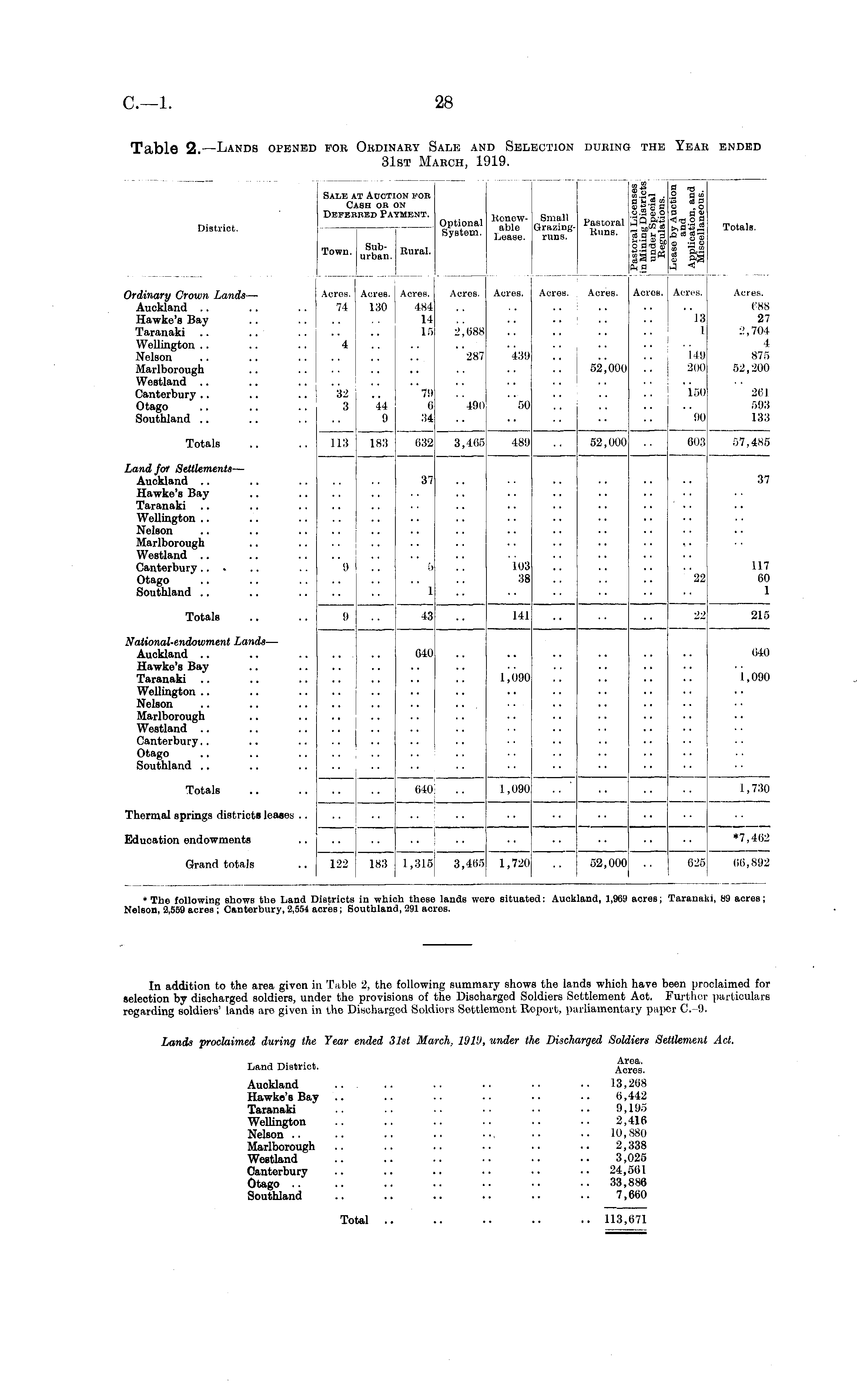 In addition to the area given in Table 2, the following summary shows the lands which have been proclaimed for selection by discharged soldiors, under tho provisions of the Discharged Soldiers Settlement Act. Further particulars regarding soldiers' lands are given in the Discharged Soldiors Settlement Report, parliamentary paper C.-9. Lands proclaimed during the Year ended 31st March, 1919, under the Discharged Soldiers Settlement Act. Land District. Acres. Auckland .. .. .. .. •• .. 13,268 Hawke's Bay .. .. .. •■ •• •• 6,442 Taranaki .. .. •• •• •■ •• 9,195 Wellington .. .. .. •• •• 2,416 Nelson .. .. .. •• ••, ■■ •■ 10,880 Marlborough .. .. .. •■ •• •• 2,338 Westland .. .. •• •• •• •• 3,025 Canterbury .. .. .. •• •• •• 24,561 Otago .. .. •■ ■■ •■ •• •• 33,886 Southland .. .. .. .. ■• .. 7,660 Total .. .. .. .. .. 113,671