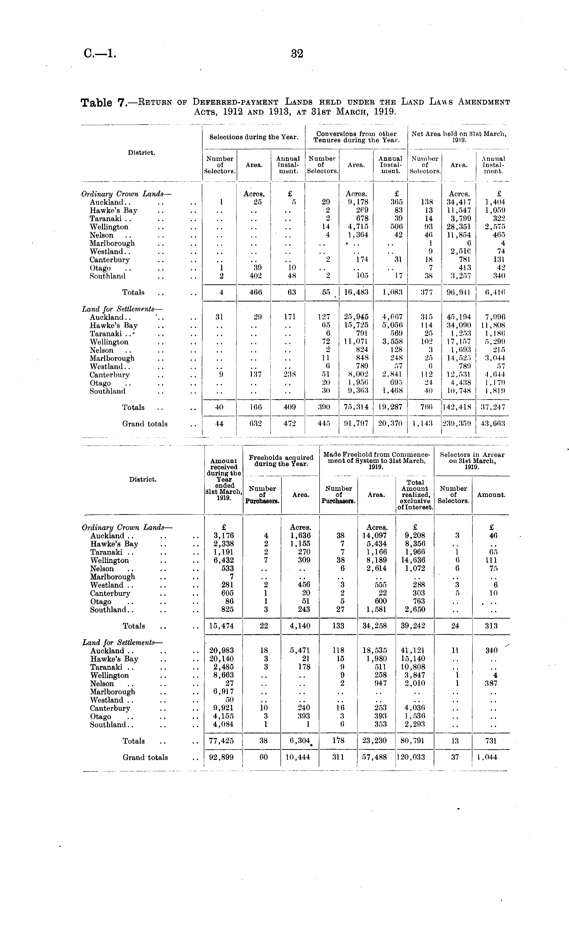 Selections during the Year. Convei Tenure! •sions fror s during tl ' other e Year. Net Area held on 31 1919. it March, District. Number Annual of Area. InstalSelectors. ment. Number of Selectors. Area. Annual Instalment. Number of Selectors. Area. Annual Instalment. Ordinary Crown Lands — Auckland Hawke's Bay Taranaki Wellington Nelson Marlborough Westland Canterbury Otago Southland 1 Acres. 25 £ 5 29 2 2 14 4 Acres. 9,178 269 678 4,715 1,364 £ 365 83 30 506 42 138 13 14 03 4(1 I 9 18 7 38 Acres. 34,417 11 ,547 3,799 28,351 11,854 6 2,516 781 413 3,257 £ 1 ,404 1,059 322 2,575 465 4 74 131 42 340 2 174 31 i 2 39 402 10 48 2 105 "l7 Totals 460 ii.", 55 16,483 1 ,083 377 96,941 6,416 Land for Settlements — Auckland.. '.. Hawke's Bay Taranaki Wellington Nelson Marlborough Westland Canterbury Otago Southland 31 29 171 127 65 0 72 2 II li 51. 20 30 25,945 15,725 791 11,071 824 848 789 8,002 I , 956 9,363 4,667 5,056 569 3,558 128 248 57 2,841 005 1,468 315 114 25 102 3 25 (i 112 24 40 45,194 34,090 1 ,253 17,157 1,693 14,525 789 12,531 4,438 10,748 7,990 11,808 1 ,180 5,299 215 3,044 57 4,044 I , I 79 1,810 9 137 238 Totals 142,418 37,247 III 166 409 lilt) 75,314 19,287 700 Grand totals 44 632 472 ■45 91,707 20,370 1,143 [239,359 43,603 Amount received during the Year ended 31st Marcli, 1919. Freeh, durii lids acquired lg the Year. Made met Freehol, it of Syst liold from Oi lystem to 31s 1919. omi itM menceLarch, Selectors on 31st 19: in Arrear March, District. Total mount lalized, elusive nterest. 19. Numb of Purchas >er sr Area. Num oi Purchu ber [ Aroa. Ai re exi of I Number of Selectors. Amount. >ers. [ i tsers. Ordinary Grown Lands — Auckland Hawke's Bay Taranaki Wellington Nelson Marlborough Westland Canterbury Otago Southland £ 3,176 2,338 1,191 6,432 533 7 281 605 80 825 4 2 2 7 Acres. 1,636 1,155 270 309 38 7 7 38 6 Acres. 14,097 5,434 1,166 8,189 2,614 £ 9,208 8,350 1,966 14,030 1,072 3 I (i 6 £ 46 05 111 75 2 1 1 3 456 20 51 243 3 2 5 27 555 22 600 1,581 288 303 763 2,050 3 5 6 10 Totals 15,474 22 4,140 133 34,258 39,242 24 313 Land for Settlements — Auckland Hawke's Bay Taranaki Wellington Nelson Marlborough Westland Canterbury Otago Southland 20,983 20,140 2,485 8,663 27 6,917 50 9,921 4,155 4,084 18 3 3 5,471 21 178 118 15 9 9 2 18,535 I ,980 511 258 947 41,121 15,140 10,808 3,847 2,010 11 i l <S 340 4 387 10 3 1 240 393 1 10 3 6 253 393 353 4,030 1,536 2,293 Totals 77,425 38 0,304 178 23,230 80,791 I.'! 731 Grand totals 92,899 00 10,444 311 57,488 120,033 1 .044 37