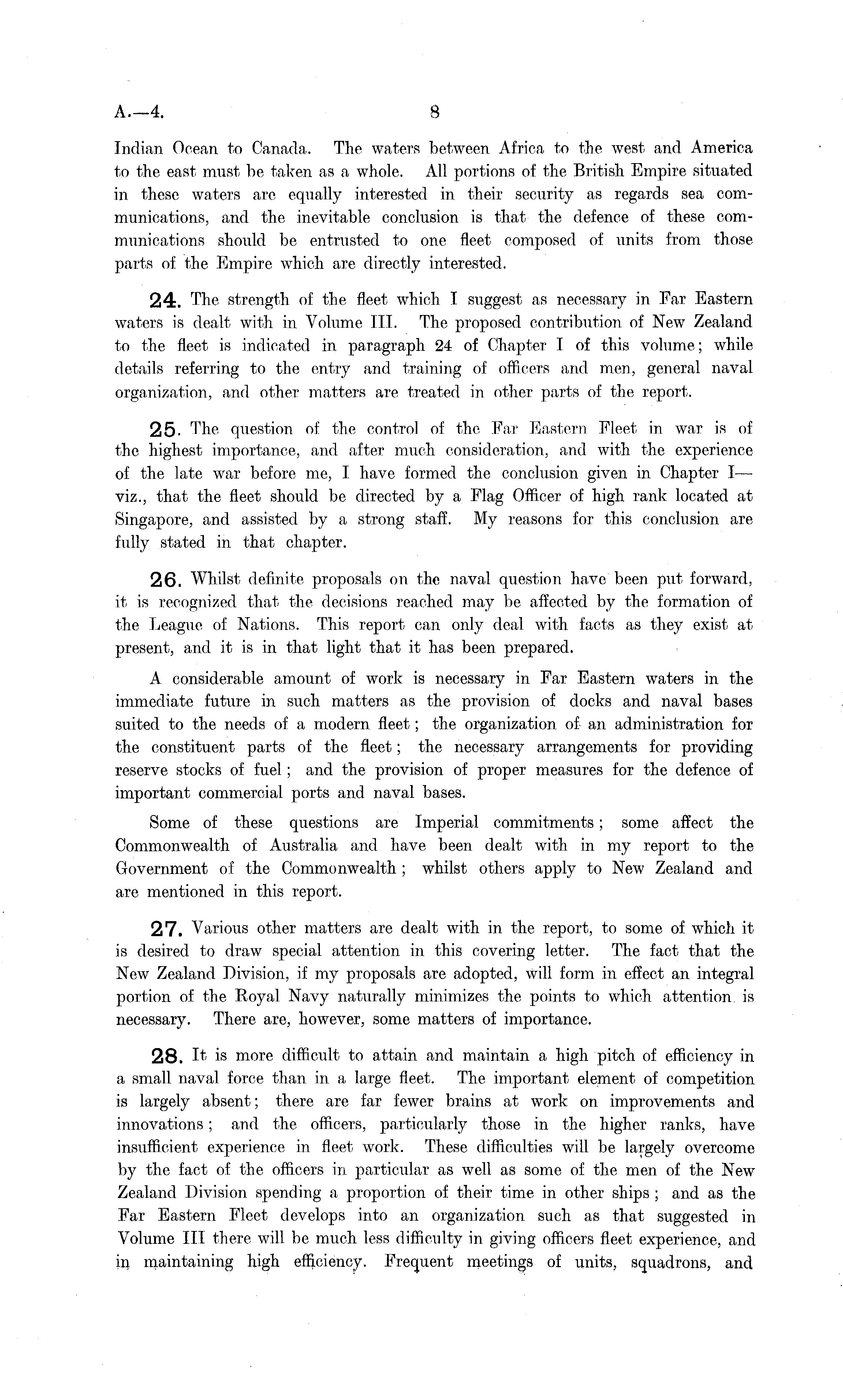 Indian Ocean to Canada. The waters between Africa to the west and America to the east must be taken as a whole. All portions of the British Empire situated in these waters arc equally interested in their security as regards sea communications, and the inevitable conclusion is that the defence of these communications should be entrusted to one fleet composed of units from those parts of the Empire which are directly interested. 24. The strength of the fleet which I suggest as necessary in Far Eastern waters is dealt with in Volume 111. The proposed contribution of New Zealand to the fleet is indicated in paragraph 24 of Chapter I of this volume; while details referring to the entry and training of officers and men, general naval organization, and other matters are treated in other parts of the report. 25- The question of the control of the Far Eastern Fleet in war is of the highest importance, and after much consideration, and with the experience of the late war before me, I have formed the conclusion given in Chapter I — viz., that the fleet should be directed by a Flag Officer of high rank located at Singapore, and assisted by a strong staff. My reasons for this conclusion are fully stated in that chapter. 26. Whilst definite proposals on the naval question have been put forward, it is recognized that the decisions reached may be affected by the formation of the League of Nations. This report can only deal with, facts as they exist at present, and it is in that light that it has been prepared. A considerable amount of work is necessary in Far Eastern waters in the immediate future in such matters as the provision of docks and naval bases suited to the needs of a modern fleet; the organization of an administration for the constituent parts of the fleet; the necessary arrangements for providing reserve stocks of fuel; and the provision of proper measures for the defence of important commercial ports and naval bases. Some of these questions are Imperial commitments; some affect the Commonwealth of Australia and have been dealt with in my report to the Government of the Commonwealth ; whilst others apply to New Zealand and are mentioned in this report. 27. Various other matters are dealt with in the report, to some of which it is desired to draw special attention in this covering letter. The fact that the New Zealand Division, if my proposals are adopted, will form in effect an integral portion of the Royal Navy naturally minimizes the points to which attention is necessary. There are, however, some matters of importance. 28. H is more difficult to attain and maintain a high pitch of efficiency in a small naval force than in a large fleet. The important element of competition is largely absent; there are far fewer brains at work on improvements and innovations; and the officers, particularly those in the higher ranks, have insufficient experience in fleet work. These difficulties will be largely overcome by the fact of the officers in particular as well as some of the men of the New Zealand Division spending a proportion of their time in other ships ; and as the Far Eastern Fleet develops into an organization such as that suggested in Volume 111 there will be much less difficulty in giving officers fleet experience, and in maintaining high efficiency. Frequent meetings of units, squadrons, and