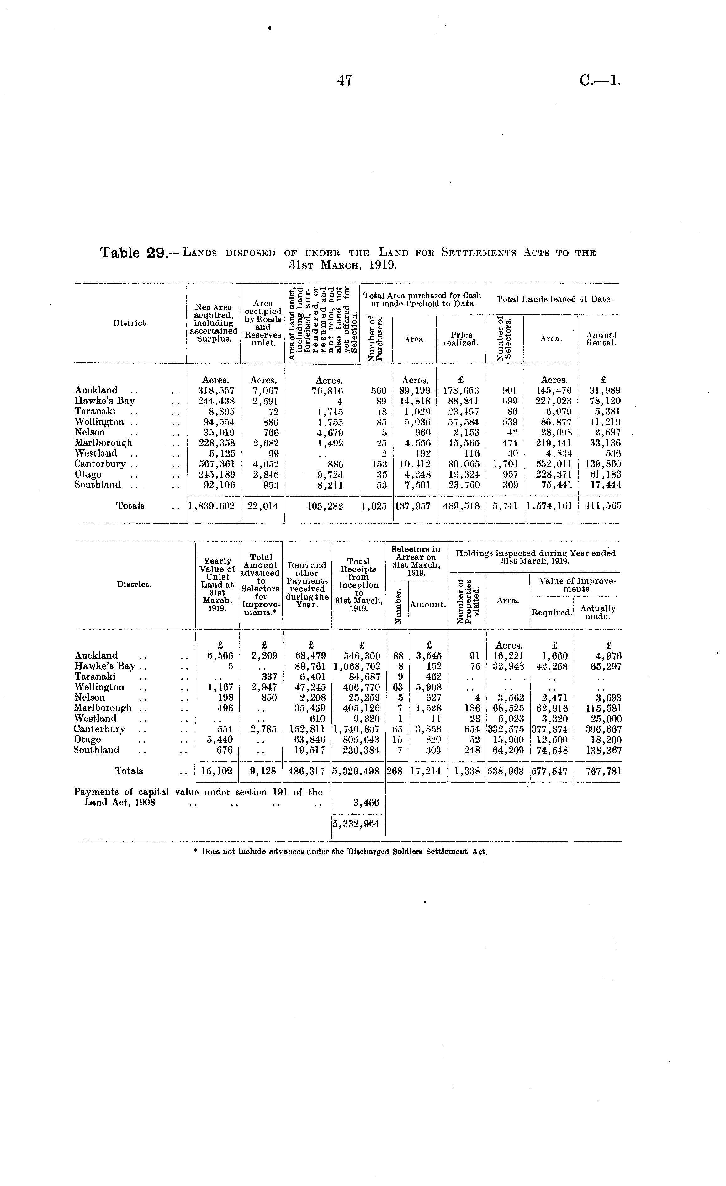 i ■- co co rt u ISo 5 9 O-S Total A or ma §.a©Sa-3c«©o oj» jcrtrt_rtrt—-caa .. © rta'©^ 3 °© ©S o22 a co* 0 © £i i a a © ©o»S« ag *4 7.9, j/OS , - TJ -O if Crt *SSS9B« r 0tftl Area purchased rireetld1o f0 Da C ; a a h ™ al **»* leased at Date. .. . 4vph "8 3 3 co co TMfliCjo TtVftohrtld fi Area occupied by Roads and Reserves unlet. Net Area A ™ a „, P'-W- L« or made Freehold te acquired, %$§%# * «pj•..tf aI a „ . District. including by ?° a ad ' ill« 81 Jill ° g ascertained ,, a v ' S a Surplus. "f,i e ,7t °l°a»»o„» .5 3 Area. e unlet. co a © © o w-g-03 a© rO m .____ Price S-g . Annual Aroa - realized. f i Aiea * Rental. 3* 5«_ ! [ Acres. £ Acres. I £ 89,199 178,(153 901 145,470 ' 31,989 14,818 88,841 699 I 227,023 I 78,120 1,029 23,457 86 6,079 j 5,381 5,036 57,584 539 80,877 41,219 966 2,153 42 28,6(18 2,697 4,556 15,565 474 219,441 33,136 192 116 30 4,834 , 536 10,412 80,005 1,704 552,011 , 139,860 4,248 19,324 957 228,371 : 61,183 7,501 23,760 309 75,441 17,444 137,957 489,518 j 5,741 1,574,161 411,565 I ..*..,.■.. ™ ~ o © © — ©© as © - rt, ,. ,. « rt -*.m a H £ .a <« i, rt a « etc ~g ta • -i t-i x .m t-i ;u p _, A Ph Aores. Acres. Acres. [ Acres. Auckland .. .. 318,557 7,067 70,816 560 89,199 1 Hawko'sBay .. 244,438 2,591 4 89 14,818 Taranaki .. .. 8,895 72 1,715 18 1,029 Wellington .. .. 94,554 886 ' 1,755 85 5,036 Nelson .. .. 35,019 766 4,679 5 966 Marlborough . .. 228,358 2,682 1,492 25 4,556 Westland .. .. 5,125 99 1 .. 2 192 Canterbury.. .. 567,361 4,052 886 153 10,412 Otago .. .. 245,189 2,846 I 9,724 35 4,248 Southland ... .. 92,106 953 8,211 53 7,501 Totals .. 1,839,602 22,014 105,282 1,025 137,957 4 Selectors in Vearlv Total Total Arrear on Value of Amount Rent and R i°T. t . 31st March, Unlet advanced other from 1919. District. Land at **%%& Inception [m £ 0V e- »''<> 3lst March, | Amount . ma ' ments.* ma - g * Total Amount advanced to Selectors for Improvements.* Rent and other Payments received during the Year. S Holdings inspected during Year ended .-UstMar?! 31st March, 1919. '*- co O © . u'3v Value of Improvements. Amnnnt. S 8-a A, ' 0n " . . .. Amount. a a -a Aet.nnllv |H Required. *£*«JJ» & ©rt a gi.1 SBfi Area. £ £ £ £ £ Auckland .. .. 6,566 2,209 68,479 546,300 88 3,545 Hawke's Bay.. .. 5 .. 89,761 1,068,702 8 152 Taranaki .. .. .. 337 0,401 84,687 9 462 Wellington .. .. 1,167 2,947 47,245 406,770 63 5,908 Nelson .. .. 198 850 2,208 25,259 5 627 Marlborough .. .. 496 .. 35,439 405,126 7 1,528 Westland .. .. ; .. 610 9,820 1 II Canterbury .. ... 554 2,785 152,811 1,746,807 65 3,858 Otago .. ..: 5,440 .. 63,846 805,643 15 ; 820 Southland .. .. ! 076 .. 19,517 230,384 7 303 £ 2,209 337 2,947 850 2,785 £ 68,479 89,761 0,401 47,245 2,208 35,439 610 152,811 63,846 19,517 £ 546,300 1,068,702 84,687 406,770 25,259 405,120 9,821) 1,746,807 805,643 230,384 88 8 9 63 5 7 1 65 15 7 £ I Acres. £ £ 3,545 91 | 1.6,221 1,660 I 4,976 152 75 : 32,948 42,258 i 65,297 462 .. 5,908 627 4 [ 3,562 2,471 3,693 1,528 186 I 68,525 62,916 115,581 II 28 5,023 3,320 25,000 3,858 654 332,575 377,874 , 396,667 820 52 15,900 12,500 I 18,200 303 248 64,209 74,548 138,367 Totals .. j 15,102 9,128 486,317 5,329,498 1268 17,214 1,338 538,963 577,547 767,781 Payments of capital value under section 191 of the Land Act, 1908 3,466 5,332,964 * Does not include advances under the Dischari Soldiers Settlement Act.