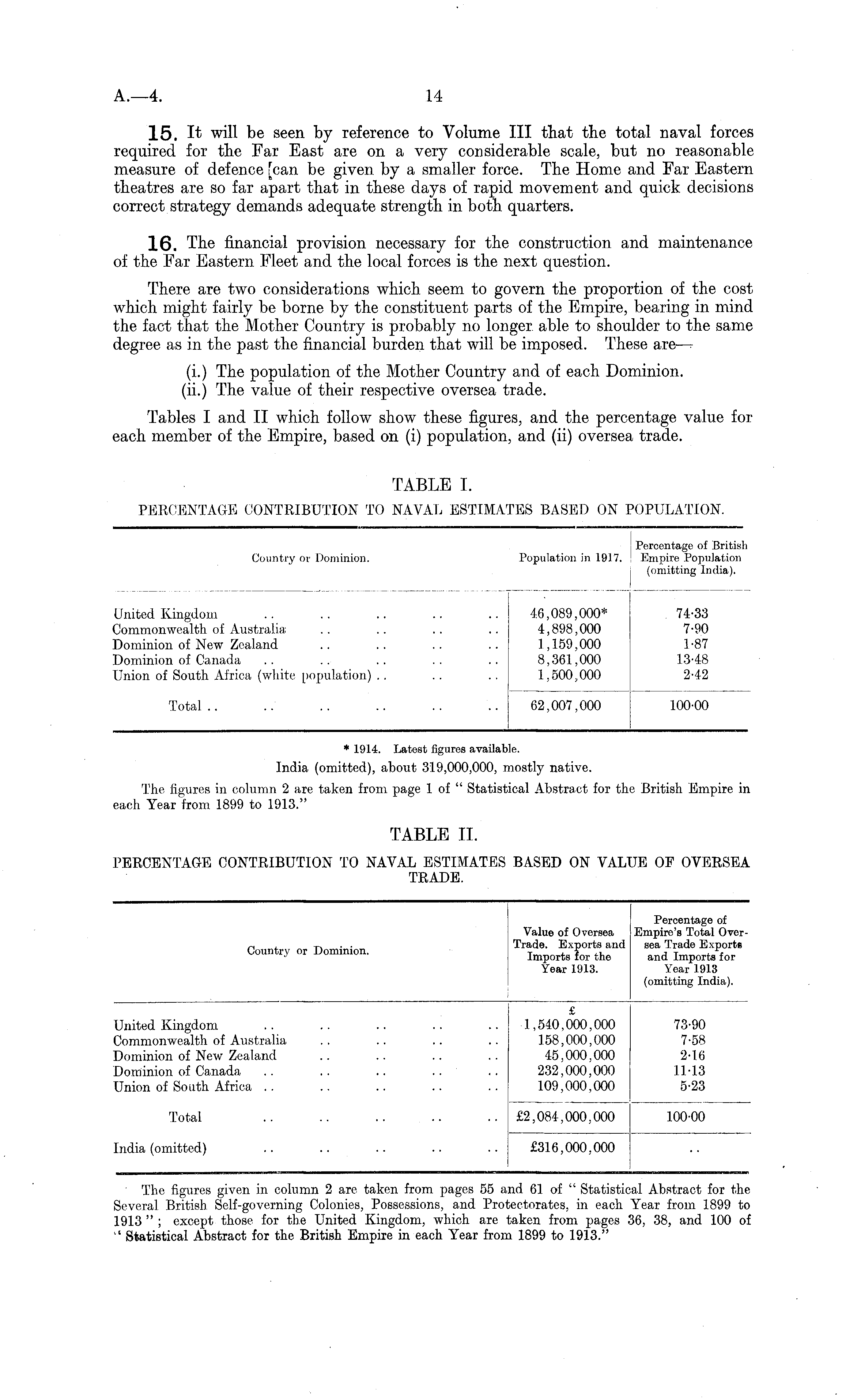 15. If will be seen by reference to Volume 111 that the total naval forces required for the Far East are on a very considerable scale, but no reasonable measure of defence [can be given by a smaller force. The Home and Far Eastern theatres are so far apart that in these days of rapid movement and quick decisions correct strategy demands adequate strength in both quarters. 16. The financial provision necessary for the construction and maintenance of the Far Eastern Fleet and the local forces is the next question. There are two considerations which seem to govern the proportion of the cost which might fairly be borne by the constituent parts of the Empire, bearing in mind the fact that the Mother Country is probably no longer able to shoulder to the same degree as in the past the financial burden that will be imposed. These are—-t (i.) The population of the Mother Country and of each Dominion, (ii.) The value of their respective oversea trade. Tables I and II which follow show these figures, and the percentage value for each member of the Empire, based on (i) population, and (ii) oversea trade.