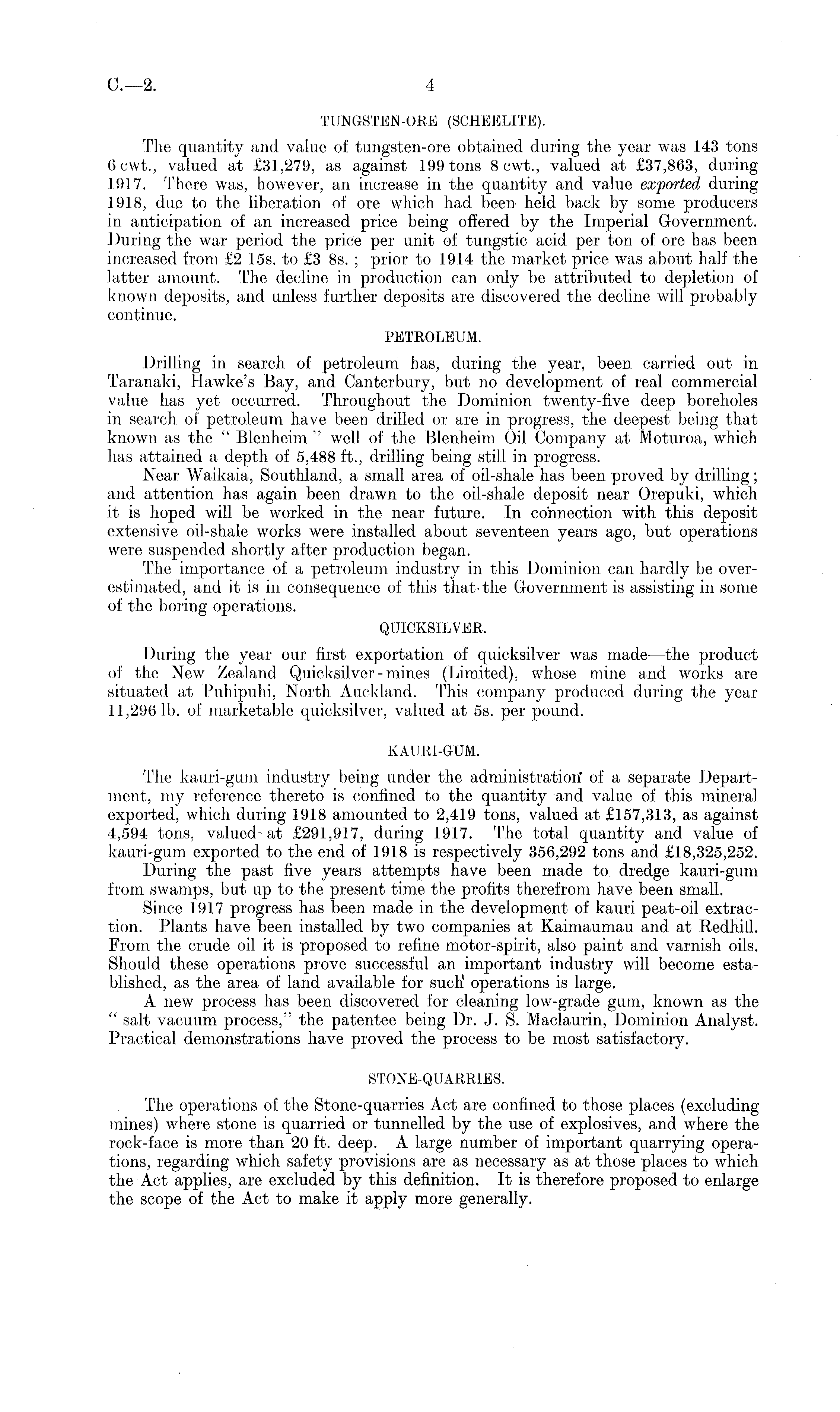 TUNGSTEN-ORE (SCHEELITE). The quantity and value of tungsten-ore obtained during the year was 143 tons 6cAvt., valued at £31,279, as against 199 tons Bcwt., valued at £37,863, during 1917. There was, however, an increase in the quantity and value exported during 1918, due to the liberation of ore which had been held back by some producers in anticipation of an increased price being offered by the Imperial Government. During the war period the price per unit of tungstic acid per ton of ore has been increased from £2 Iss. to £3 Bs. ; prior to 1914 the market price was about half the latter amount. The decline in production can only be attributed to depletion of known deposits, and unless further deposits are discovered the decline will probably continue. PETROLEUM. Drilling in search of petroleum has, during the year, been carried out in Taranaki, Hawke's Bay, and Canterbury, but no development of real commercial value has yet occurred. Throughout the Dominion twenty-five deep boreholes in search of petroleum have been drilled or are in progress, the deepest being that known as the " Blenheim " well of the Blenheim Oil Company at Moturoa, which has attained a depth of 5,488 ft., drilling being still in progress. Near Waikaia, Southland, a small area of oil-shale has been proved by drilling; and attention has again been drawn to the oil-shale deposit near Orepuki, which it is hoped will be worked in the near future. In connection with this deposit extensive oil-shale works were installed about seventeen years ago, but operations were suspended shortly after production began. The importance of a petroleum industry in this Dominion can hardly be overestimated, and it is in consequence of this that-the Government is assisting in some of the boring operations. QUICKSILVER. During the year our first exportation of quicksilver was made—the product of the New Zealand Quicksilver-mines (Limited), whose mine and works are situated at Puhipuhi, North Auckland. This company produced during the year 11,296 lb. of marketable quicksilver, valued at ss. per pound. KAURI-GUM. The kauri-gum industry being under the administration' of a separate Department, my reference thereto is confined to the quantity and value of this mineral exported, which during 1918 amounted to 2,419 tons, valued at £157,313, as against 4,594 tons, valued-at £291,917, during 1917. The total quantity and value of kauri-gum exported to the end of 1918 is respectively 356,292 tons and £18,325,252. During the past five years attempts have been made to dredge kauri-gum from swamps, but up to the present time the profits therefrom have been small. Since 1917 progress has been made in the development of kauri peat-oil extraction. Plants have been installed by two companies at Kaimaumau and at Redhill. From the crude oil it is proposed to refine motor-spirit, also paint and varnish oils. Should these operations prove successful an important industry will become established, as the area of land available for sueh 1 operations is large. A new process has been discovered for cleaning low-grade gum, known as the " salt vacuum process," the patentee being Dr. J. S. Maclaurin, Dominion Analyst. Practical demonstrations have proved the process to be most satisfactory. STONE-QUARRIES. The operations of the Stone-quarries Act are confined to those places (excluding mines) where stone is quarried or tunnelled by the use of explosives, and where the rock-face is more than 20 ft. deep. A large number of important quarrying operations, regarding which safety provisions are as necessary as at those places to which the Act applies, are excluded by this definition. It is therefore proposed to enlarge the scope of the Act to make it apply more generally.