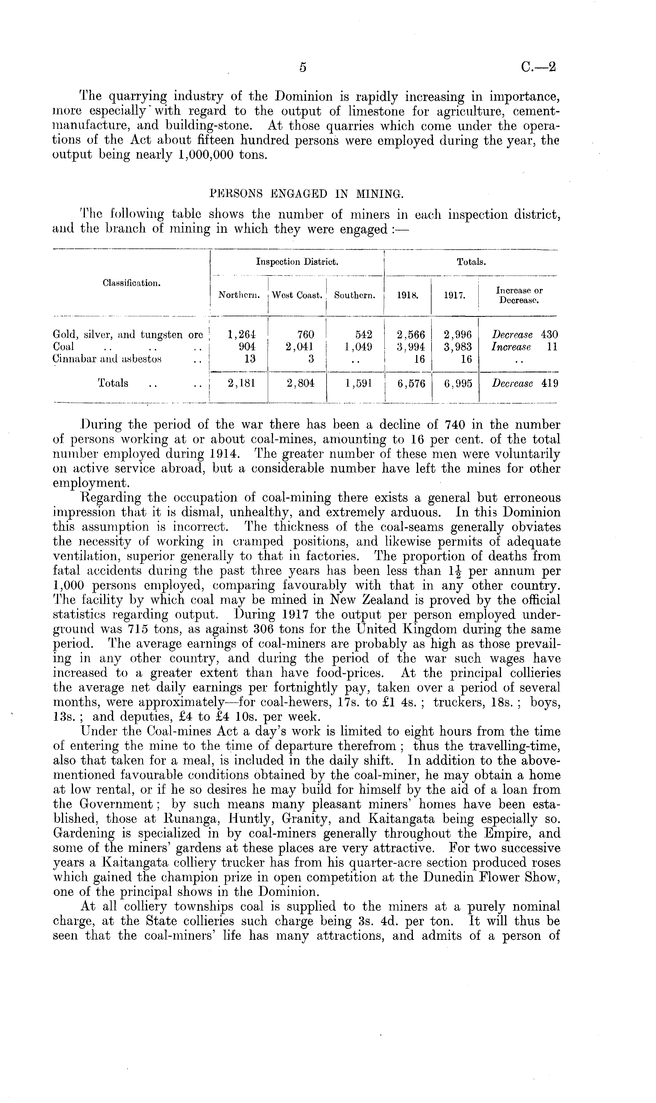 Im Classification. Northern. ipcction District. West Coast. ' Southern. 1918. I Total Is. 1917. Increase or Decrease. I i ( Gold, silver, and tungsten ore t 1,264 Coal .. .. .. 904 Cinnabar and asbestos .. 13 Totals .. .. 2,181 I 760 2,041 3 2,804 542 2,566 1,049 3,994 16 1,591 6,576 2.996 3,983 16 Decrease 430 Increase 11 6,995 Decrease 419