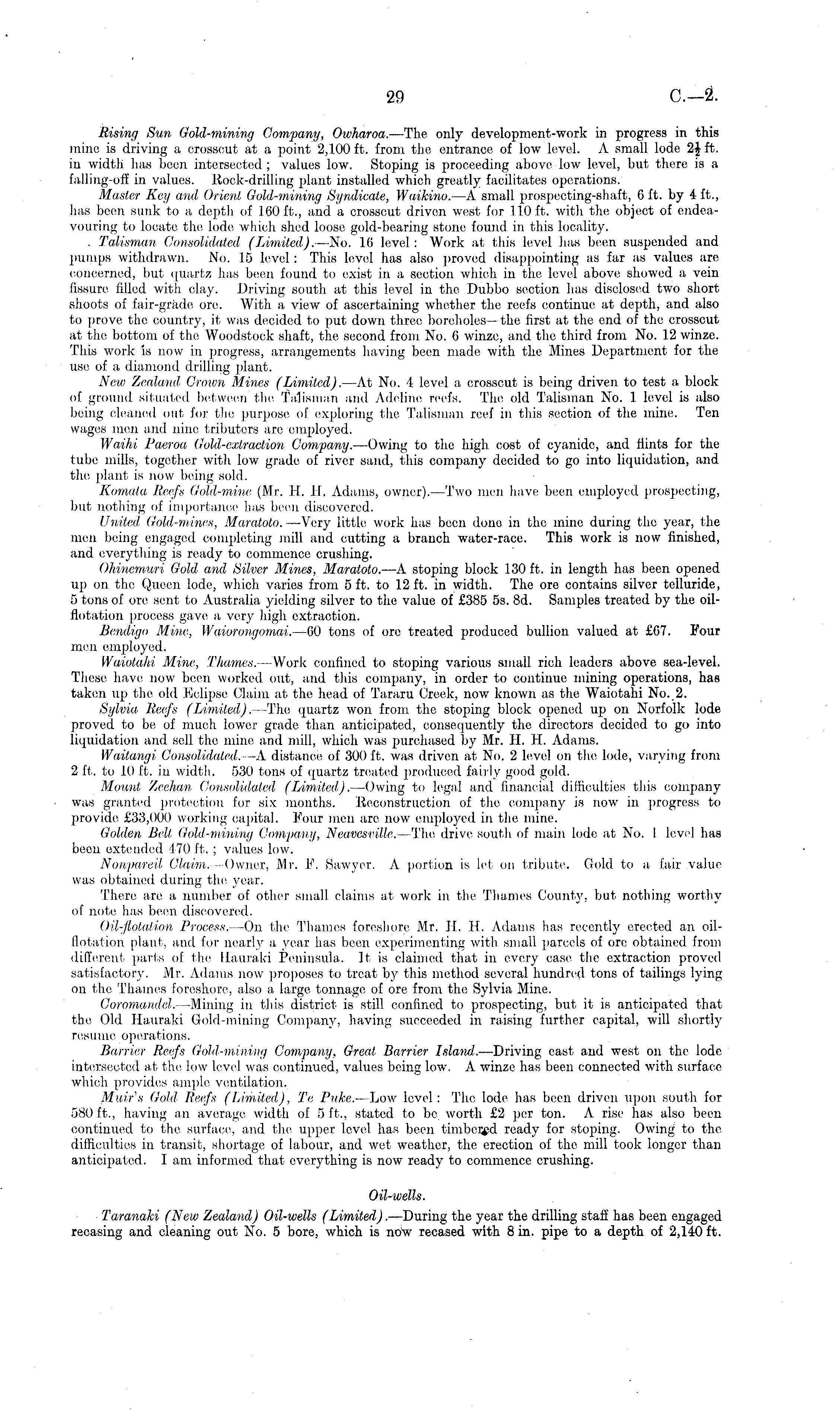Rising Sun Gold-mining Company, Owharoa. —The only development-work in progress in this mine is driving a crosscut at a point 2,100 ft. from the entrance of low level. A small lode 2$ ft. in width has boon intersected ; values low. Stoping is proceeding above low level, but there is a falling-off in values. Rock-drilling plant installed which greatly facilitates operations. Master Key and Orient Gold-mining Syndicate, Waikino. —A small prospecting-shaft, 6 ft. by 4 ft., has been sunk to a depth of 160 ft., and a crosscut driven west for 110 ft. with the object of endeavouring to locate the lode which shed loose gold-bearing stone found in this locality. . Talisman Consolidated (Limited). —No. 16 level : Work at this level has been suspended and pumps withdrawn. No. 15 level : This level has also proved disappointing as far as values are concerned, but quartz has been found to exist in a section which in the level above showed a vein fissure filled with clay. Driving south at this level in tho Dubbo section has disclosed two short shoots of fair-grade ore. With a view of ascertaining whether the reefs continue at depth, and also to prove the country, it was decided to put down three boreholes—the first at the end of the crosscut at the bottom of the Woodstock shaft, the second from No. 6 winze, and the third from No. 12 winze. This work Is now in progress, arrangements having been made with the Mines Department for the use of a diamond drilling plant. New Zealand Crown Mines (Limited). —At No. 4 level a, crosscut is being driven to test a block of ground situated between the Talisman and Adeline reefs. The old Talisman No. 1 level is also being cleaned out for the purpose of exploring the Talisman reef in this section of the mine. Ten wages men and nine tributers are employed. Waihi Paeroa Gold-extraction Company. —Owing to the high cost of cyanide, and flints for the tube mills, together with low grade of river sand, this company decided to go into liquidation, and the plant is now being sold. Komala Reefs Gold-mine (Mr. H. H. Adams, owner). —Two men have been employed prospecting, but nothing of importance lias been discovered. United Gold-mines, Maratoto. —Very little work has been dono in the mine during the year, the men being engaged completing mill and cutting a branch water-race. This work is now finished, and everything is ready to commence crushing. Ohinemuri Gold and Silver Mines, Maratoto. —A stoping block 130 ft. in length has been opened up on tho Queen lode, which varies from 5 ft. to 12 ft. in width. The ore contains silver tclluride, 5 tons of ore sent to Australia yielding silver to the value of £385 ss. Bd. Samples treated by the oilflotation process gave a very high extraction. Bendigo Mine, Waiorongomai. —6o tons of ore treated produced bullion valued at £67. Four men employed. Waiotahi Mine, Thames. — Work confined to stoping various small rich leaders above sea-level. These have now been worked out, and this company, in order to continue mining operations, has taken up the old Eclipse Claim at the head of Tararu Creek, now known as the Waiotahi No. 2. Sylvia Reefs (Limited). —The quartz won from the stoping block opened up on Norfolk lode proved to be of much lower grade than anticipated, consequently the directors decided to go into liquidation and soil the mine and mill, which was purchased by Mr. H. H. Adams. Waitangi Consolidated.--A distance of 300 ft. was driven at No. 2 level on the lode, varying from 2 ft. to 10 ft. in width. 530 tons of quartz treated produced fairly good gold. Mount Zeehan Consolidated (Limited). —Owing to legal and financial difficulties this company was granted protection for six months. Reconstruction of the company is now in progress to provide £33,000 working capital. Four men arc now employed in the mine. Golden Bell Gold-mining Company, Neavesville. —The drive south of main lode at No. I level has been extended 170 ft. ; values low. Nonpareil Claim. —Owner, Mr. F. Sawyer. A portion is let on tribute. Gold to a fair value was obtained during the year. There are a number of other small claims at work in the Thames County, but nothing worthy of note has been discovered. Oil-flotation Process. -On the Thames foreshore Mr. 11. H. Adams lias recently erected an oilflotation plant, and for nearly a year has been experimenting with small parcels of ore obtained from different parts of the Eauraki Peninsula. It is claimed that in every case the extraction proved satisfactory. Mr. Adams now proposes to treat by this method several hundred tons of tailings lying on the Thames foreshore, also a large tonnage of ore from tho Sylvia Mine. Commanded. —Mining in this district is still confined to prospecting, but it is anticipated that tho Old Hauraki Gold-mining Company, having succeeded in raising further capital, will shortly resume operations. Barrier Reefs Gold-mining Company, Great Barrier Island. —Driving east and west on the lode intersected at the low level was continued, values being low. A winze has been connected with surface which provides ample ventilation. Muir's Gold Reefs (Limited), Te Puke. —Low level : The lode has been driven upon south for 580 ft., having an average width of 5 ft., stated to bo worth £2 per ton. A rise has also been continued to the surface, and the upper level has been timbered ready for stoping. Owing to the difficulties in transit, shortage of labour, and wet weather, the erection of the mill took longer than anticipated. lam informed that everything is now ready to commence crushing. Oil-wells. Taranaki (New Zealand) Oil-wells (Limited). —During the year the drilling staff has been engaged recasing and cleaning out No. 5 bore, which is no*w recased with 8 in. pipe to a depth of 2,140 ft.