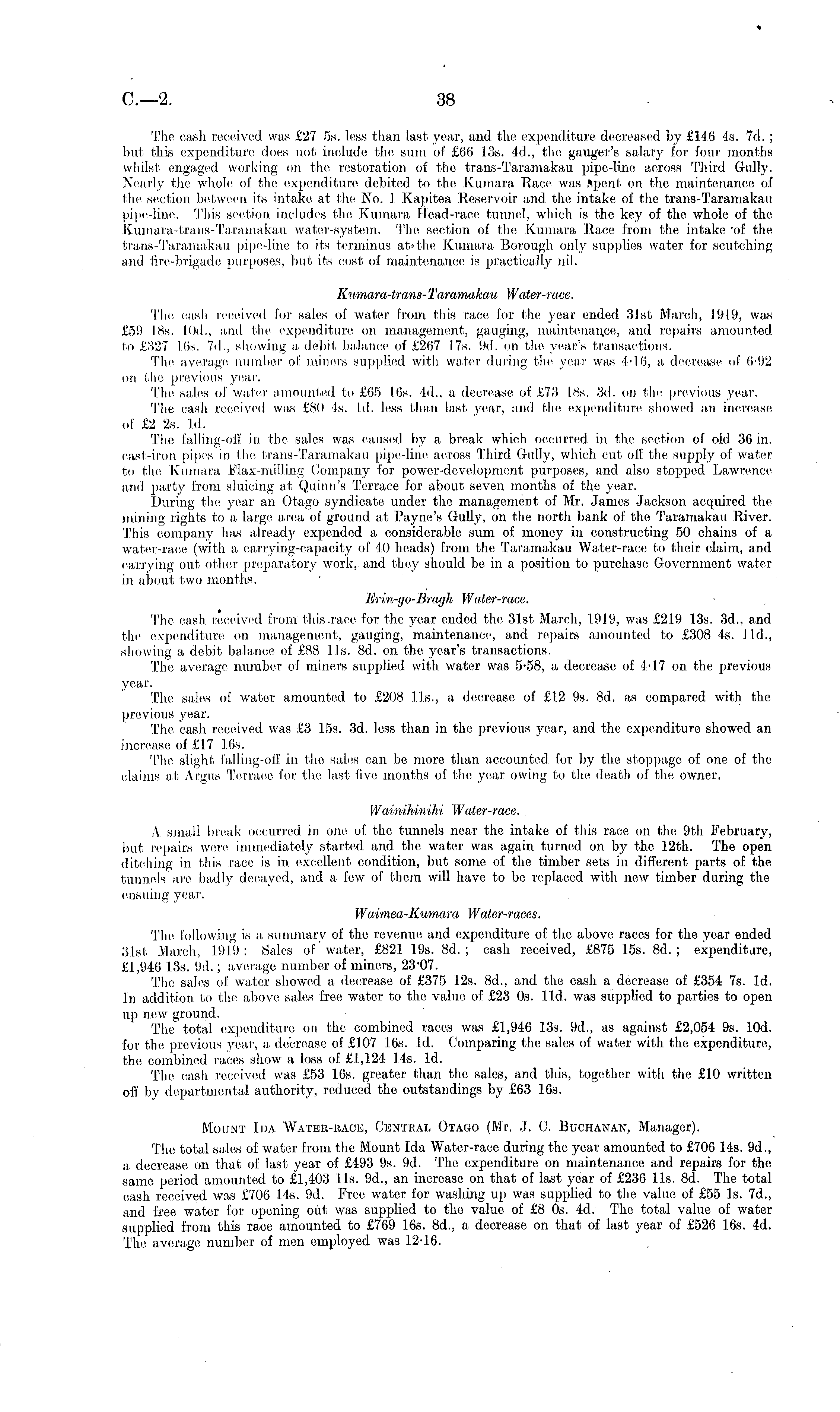 The cash received was £27 ss. less than last year, and the expenditure decreased by £116 4s. 7d. ; but this expenditure does not include the sum of £66 13s. 4d., the gauger's salary for four months whilst engaged working on the restoration of the trans-Taramakau pipe-line across Third Gully. Nearly the whole of the expenditure debited to the Kumara Raoe was Spent on the maintenance of the, section between its intake at the No. 1 Kapitea Reservoir and. the intake of the trans-Taramakau pipe-line. This section includes the Kumara Head-race tunnel, which is the key of the whole of the Kumara-trans-Taramakau water-system. The section of the Kumara Race from the intake 'of the trans-Taramakau. pipe-line to its terminus at the Kumara Borough only supplies water for scutching and fire-brigade purposes, but its cost of maintenance is practically nil. Kumara-trans-Taramakau Water-race. The cash received for sales of water from this race for the year ended 3.lst March, 1919, was £59 18s. 10d., and the expenditure on management, gauging, maintenance, and repairs amounted to £327 16s. 7<1., showing a debit balance of £267 17s. 9d. on the year's transactions. The, average number of miners supplied with water during the year was 4-16, a decrease of 6-92 on the previous year. The, sales of water amounted to £65 16s. 4d.. a decrease of £73 18s. 3d. on the previous year. The cash received was £80 4s. Id. less than last year, and the expenditure showed an increase of £2 2s. Id. The falling-off in the sales was caused by a break which occurred in the section of old 36 in. cast-iron, pipes in the trans-Taramakau pipe-line across Third Gully, which cut off the supply of water to the Kumara Flax-milling Company for power-development purposes, and also stopped. Lawrence and party from sluicing at Quinn's Terrace for about seven months of the year. During the year an Otago syndicate under the management of Mr. James Jackson acquired the mining rights to a large area of ground at Payne's Gully, on the north bank of the Taramakau River. This company has already expended a considerable sum of money in constructing 50 chains of a water-race (with a carrying-capacity of 40 heads) from the Taramakau Water-race to their claim, and carrying out other preparatory work,, and they should bo in a position to purchase Government water in about two months. Erin-go-Bragh Water-race. The cash received from this .race for the year ended the 31st March, 1919, was £219 13s. 3d., and the expenditure on management, gauging, maintenance, and repairs amounted to £308 4s. lid., showing a debit balance of £88 lis. Bd. on the, year's transactions. The average number of miners supplied with water was 5-58, a decrease of 4T7 on the previous year. The sales of water amounted to £208 lis., a decrease of £12 9s. Bd. as compared with the previous year. The cash received was £3 15s. 3d. less than in the previous year, and the expenditure showed an increase of £17 16s. The slight falling-off in the sales can be more than accounted for by the, stoppage of one of the claims at Argus Terrace for the last five months of the year owing to the death of the owner. Wainihinihi Water-race. A small break: occurred in one of the tunnels near the intake of this race on the 9th February, but, repairs were immediately started and the water was again turned on by the 12th. The open ditching in this race is in excellent condition, but some of the timber sets in different parts of the tunnels are badly decayed, and a few of them will have to be replaced with new timber during the ensuing year. Waimea-Kumara Water-races. The, following is a summary of the revenue and expenditure of the above races for the year ended Slat March, 1919: Sales of water, £821 19s. Bd. ; cash received, £875 15s. Bd. ; expenditure, £1,946 13s. 9d.; average number of miners, 23"07. The sales of water showed a decrease of £375 12s. Bd., and the cash a decrease of £354 7s. Id. In addition to the above sales free water to the value of £23 os. lid. was supplied to parties to open up new ground. The total expenditure on the combined races was £1,946 13s. 9d., as against £2,054 9s. lOd. for the previous year, a decrease of £1.07 16s. Id. Comparing the sales of water with the expenditure, the combined races show a loss of £1,124 14s. Id. The cash received was £53 16s. greater than the sales, and this, together with the £10 written off by departmental authority, rcdueed the outstandings by £63 16s. Mount Ida Water-race, Central Otago (Mr. J. 0. Buchanan, Manager). The total sales of water from the Mount Ida Water-race during the year amounted to £706 14s. 9d., a decrease on that of last year of £493 9s. 9d. The expenditure on maintenance and repairs for the same period amounted to £1,403 lis. 9d., an increase on that of last year of £236 lis. Bd. The total cash received was £706 14s. 9d. Free water for washing up was supplied to the value of £55 is. 7d., and free water for opening out was supplied to the value of £8 os. 4d. The total value of water supplied from this race amounted to £769 16s. Bd., a decrease on that of last year of £526 16s. 4d. The average number of men employed was 12-16.