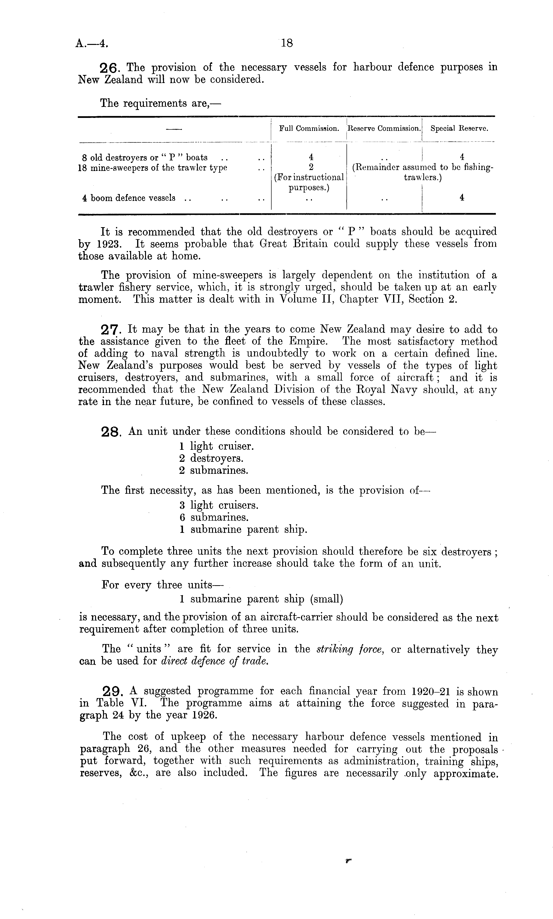 It is recommended that the old destroyers or " P " boats should be acquired by 1923. It seems probable that Great Britain could supply these vessels from those available at home. The provision of mine-sweepers is largely dependent on the institution of a trawler fishery service, which, it is strongly urged, should be taken, up at an early moment. This matter is dealt with in Volume 11, Chapter VII, Section 2. 27- If ma y be that in the years to come New Zealand may desire to add to the assistance given to the fleet of the Empire. The most satisfactory method of adding to naval strength is undoubtedly to work on a certain denned line. New Zealand's purposes would best be served by vessels of the types of light cruisers, destroyers, and submarines, with a small force of aircraft; and it is recommended that the New Zealand Division of the Royal Navy should, at any rate in the near future, be confined to vessels of these classes. 28. An unit under these conditions should be considered to be— 1 light cruiser. 2 destroyers. 2 submarines. The first necessity, as has been mentioned, is the provision of — 3 light cruisers. 6 submarines. 1 submarine parent ship. To complete three units the next provision should therefore be six destroyers ; and subsequently any further increase should take the form of an unit. For every three units— 1 submarine parent ship (small) is necessary, and the provision of an aircraft-carrier should be considered as the next requirement after completion of three units. The " units " are fit for service in the striking force, or alternatively they can be used for direct defence of trade. 29. A suggested programme for each financial year from 1920-21 is shown in Table VI. The programme aims at attaining the force suggested in paragraph 24 by the year 1926. The cost of upkeep of the necessary harbour defence vessels mentioned in paragraph 26, and the other measures needed for carrying out the proposals put forward, together with such requirements as administration, training ships, reserves, &c, are also included. The figures are necessarily .only approximate.