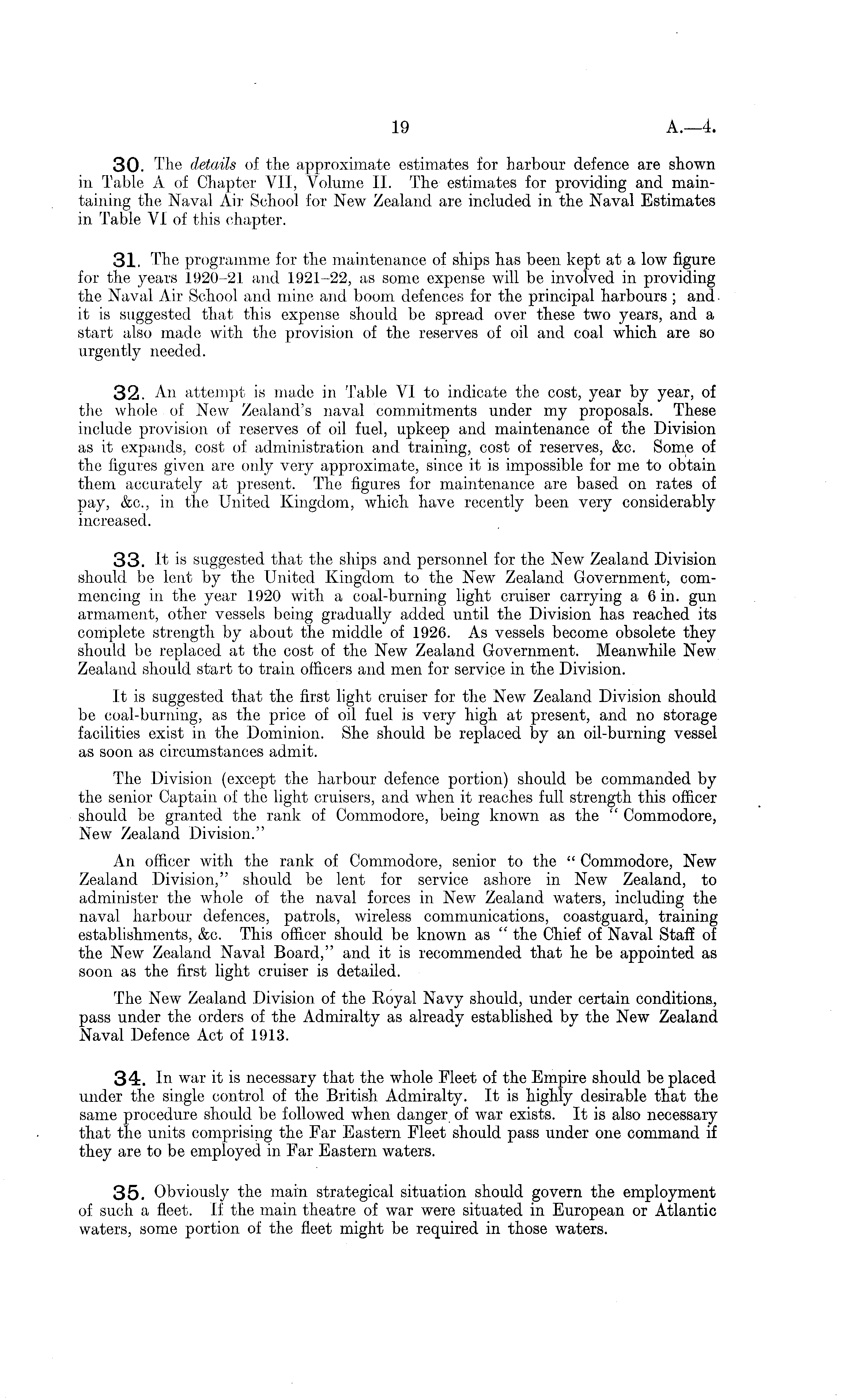30. The details of the approximate estimates for harbour defence are shown in Table A of Chapter VII, Volume 11. The estimates for providing and maintaining the Naval Air School for New Zealand are included in the Naval Estimates in Table VI of this chapter. 31. The programme for the maintenance of ships has been kept at a low figure for the years 1920-21 and 1921-22, as some expense will be involved in providing the Naval Air School and mine and boom defences for the principal harbours ; and it is suggested that this expense should be spread over these two years, and a start also made with the provision of the reserves of oil and coal which are so urgently needed. 32. An attempt is made in Table VI to indicate the cost, year by year, of the whole of New Zealand's naval commitments under my proposals. These include provision of reserves of oil fuel, upkeep and maintenance of the Division as it expands, cost of administration and training, cost of reserves, &c. Some of the figures given are only very approximate, since it is impossible for me to obtain them accurately at present. The figures for maintenance are based on rates of pay, &c, in the United Kingdom, which have recently been very considerably increased. 33. It is suggested that the ships and personnel for the New Zealand Division should be lent by the United Kingdom to the New Zealand Government, commencing in the year 1920 with a coal-burning light cruiser carrying a 6 in. gun armament, other vessels being gradually added until the Division has reached its complete strength by about the middle of 1926. As vessels become obsolete they should be replaced at the cost of the New Zealand Government. Meanwhile New Zealand should start to train officers and men for service in the Division. It is suggested that the first light cruiser for the New Zealand Division should be coal-burning, as the price of oil fuel is very high at present, and no storage facilities exist in the Dominion. She should be replaced by an oil-burning vessel as soon as circumstances admit. The Division (except the harbour defence portion) should be commanded by the senior Captain of the light cruisers, and when it reaches full strength this officer should be granted the rank of Commodore, being known as the ' Commodore, New Zealand Division." An officer with the rank of Commodore, senior to the " Commodore, New Zealand Division," should be lent for service ashore in New Zealand, to administer the whole of the naval forces in New Zealand waters, including the naval harbour defences, patrols, wireless communications, coastguard, training establishments, &c. This officer should be known as " the Chief of Naval Staff of the New Zealand Naval Board," and it is recommended that he be appointed as soon as the first light cruiser is detailed. The New Zealand Division of the Royal Navy should, under certain conditions, pass under the orders of the Admiralty as already established by the New Zealand Naval Defence Act of 1913. 34. In war it is necessary that the whole Fleet of the Empire should be placed under the single control of the British Admiralty. It is highly desirable that the same procedure should be followed when danger of war exists. It is also necessary that the units comprising the Far Eastern Fleet should pass under one command if they are to be employed in Far Eastern waters. 35. Obviously the main strategical situation should govern the employment of such a fleet. If the main theatre of war were situated in European or Atlantic waters, some portion of the fleet might be required in those waters.