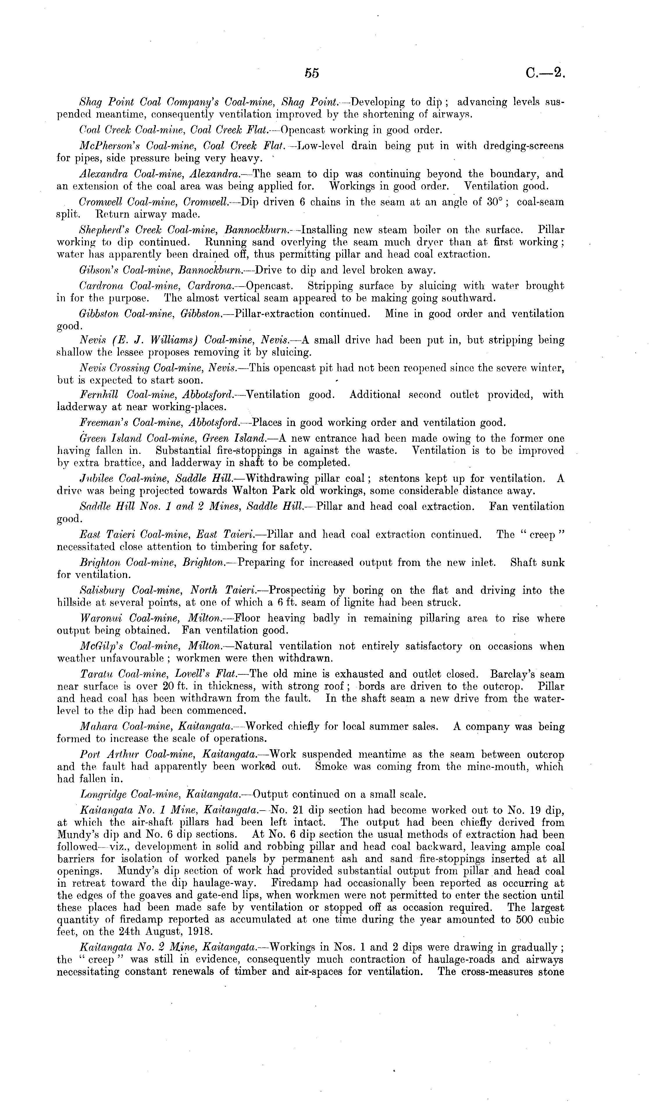 Shag Point Coal Company's Coal-mine, Shag Point. —Developing to dip ; advancing levels suspended meantime, consequently ventilation improved by the shortening of airways. Coal Creek Coal-mine, Coal Creek Flat. —Opencast working in good order. McPherson's Coal-mine, Coal Creek Flat. —Low-level drain being put in with dredging-scrcens for pipes, side pressure being very heavy. Alexandra Coal-mine, Alexandra. —The seam to dip was continuing beyond the boundary, and an extension of the coal area was being applied for. Workings in good order. Ventilation good. Cromwell Coal-mine, Cromwell. —Dip driven 6 chains in the seam at an angle of 30° ; coal-seam split. Return airway made. Shepherd's Creek Coal-mine, Bannoekhurn. Installing new steam boiler on the surface. Pillar working to dip continued. Running sand overlying the seam much dryer than at first working ; water lias apparently been drained off, thus permitting pillar and head coal extraction. Gibson's Coal-mine, Bannockburn. —Drive to dip and level broken away. Cardrona Coal-mine, Cardrona. —Opencast. Stripping surface by sluicing with water brought in for the purpose. The almost vertical seam appeared to be making going southward. Gibbston Coal-mine, Gibbston. —Pillar-extraction continued. Mine in good order and ventilation good. Nevis (E. J. Williams) Coal-mine, Nevis. —A small drive had been put in, but stripping being shallow the lessee proposes removing it by sluicing. Nevis Crossing Coal-mine, Nevis. —This opencast pit had not been reopened since the severe winter, but is expected to start soon. Fernhill Coal-mine, Abbotsford. —Ventilation good. Additional second outlet provided, with ladderway at near working-places. \ Freeman's Coal-mine, Abbotsford. Places in good working order and ventilation good. Green Island Coal-mine, Green Island. —A new entrance had been made owing to the former one having fallen in. Substantial fire-stoppings in against the waste. Ventilation is to bo improved by extra brattice, and ladderway in shaft to be completed. Jubilee Coal-mine, Saddle Hill. —Withdrawing pillar coal; stentons kept up for ventilation. A drive was being projected towards Walton Park old workings, some considerable distance away. Saddle Hill Nos. 1 and 2 Mines, Saddle Hill. —Pillar and head coal extraction. Fan ventilation good. East, Taieri Goal-mine, East Taieri. —Pillar and head coal extraction continued, Tho " creep " necessitated close attention to timbering for safety. Brighton Coal-mine, Brighton. —Preparing for increased output from the new inlet. Shaft sunk for ventilation. Salisbury Coal-mine, North Taieri. —Prospecting by boring on the flat and driving into the hillside, at several points, at one of which a 6 ft. seam of lignite had been struck. Waronui Coal-mine, Milton. —Floor heaving badly in remaining pillaring area to rise where output being obtained. Fan ventilation good. MeGilp's Coal-mine, Milton. —Natural ventilation not entirely satisfactory on occasions when weather unfavourable ; workmen were then withdrawn. Taralu Coal-mine, Lovell's Flat. —The old mine is exhausted and outlet closed. Barclay's seam near surface is over 20ft. in thickness, with strong roof; bords are driven to tho outcrop. Pillar and head coal has been withdrawn from the fault. In the shaft seam a new drive from the waterlevel to the dip had been commenced. Mahara Coal-mine, Kaitangata.- -Worked chiefly for local summer sales. A company was being formed to increase the scale of operations. Port Arthur Coal-mine, Kaitangata.- -Work suspended meantime as the seam between outcrop and the, fault had apparently been worked out. Smoke was coming from the mine-mouth, which had fallen in. Longridge Coal-mine, Kaitangata- Output continued on a small scale. Kaitangata No. 1 Mine, Kaitangata.—No. 21 dip section had become worked out to No. 19 dip, at which the air-shaft pillars had been left intact. The output had been chiefly derived from Mundy's dip and No. 6 dip sections. At No. 6 dip section the usual methods of extraction had been followed —viz., development in solid and robbing pillar and head coal backward, leaving ample, coal barriers for isolation of worked panels by permanent ash and sand fire-stoppings inserted at all openings. Mundy's dip section of work had provided substantial output from pillar and head coal in retreat toward, the dip haulage-way. Firedamp had occasionally been reported as occurring at the edges of the goaves and gate-end lips, when workmen were not permitted to enter the section until these places had been made safe by ventilation or stopped off as occasion required. The largest quantity of firedamp reported as accumulated at one time during the year amounted to 500 cubic feet, on the 24th August, 1918. Kaitangata No. 2 Mine, Kaitangata. —Workings in Nos. 1 and 2 dips were drawing in gradually ; the " creep " was still in evidence, consequently much contraction of haulage-roads and airways necessitating constant renewals of timber and air-spaces for ventilation. The cross-measures stone
