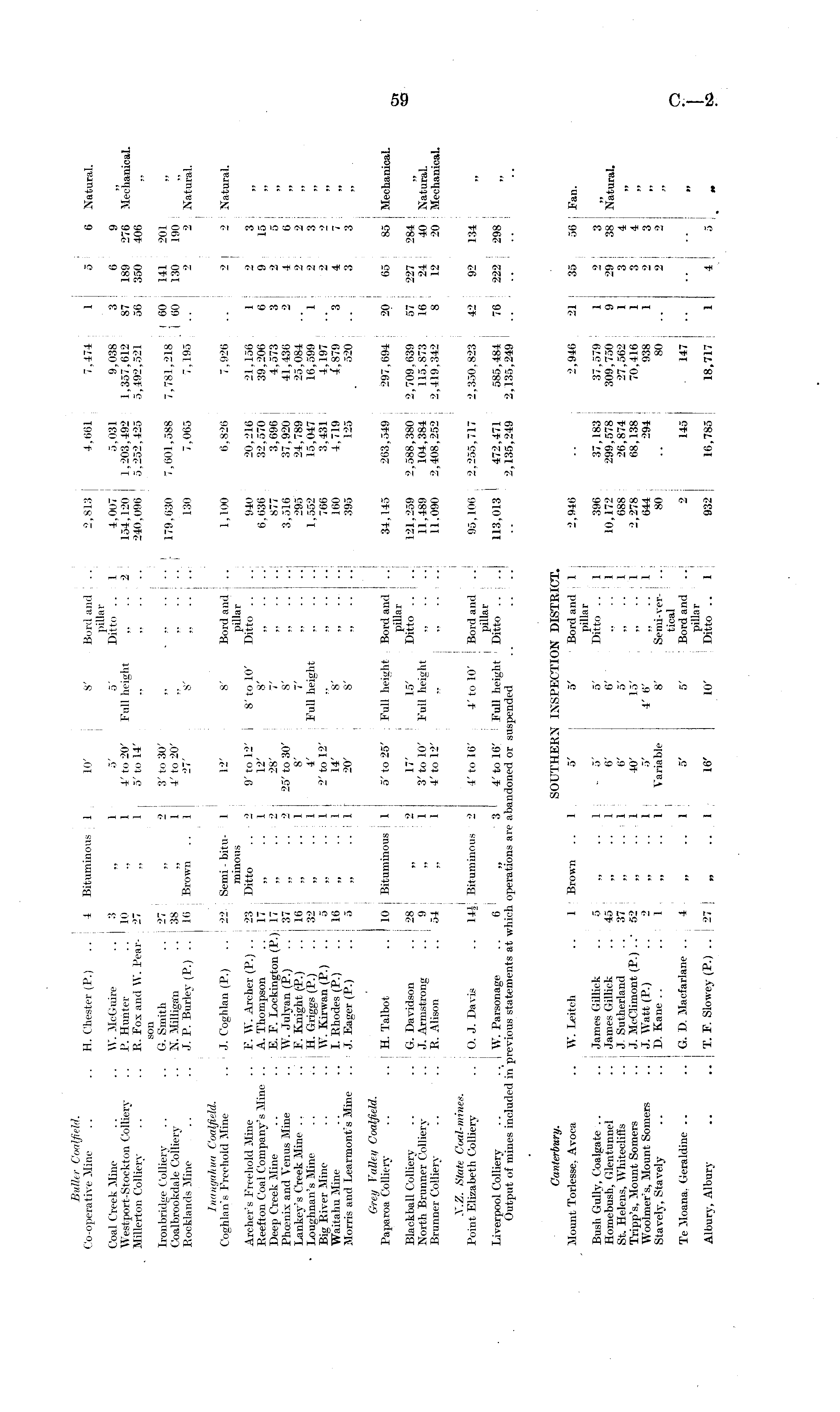 Butler Coalfield. Co-operative Mine .. .. H. Chester (P.) .. 4 Bituminous j 1 ; Coal Creek Mine .. i.. W. McGuire .. 3 „ 1 Westport-Stockton Colliery . . P. Hunter .. 10 „ 1 Millerton Colliery .. " .. R. Fox and W. Pear- 27 „ 1 son Ironbridge Colliery .. .. i G. Smith 27 „ 2 Ooalbrookdale Colliery ..IN. Milligan 38 „ 1 Rocklands Mine .. .. J. P. Burley (P.) .. 16 j Brown .. 1 I i 10' 8' Bord and . . pillar 5' 5' Ditto .. 1 4' to 20' Full height „ .. 2 5' to 14' .. „ .. .. 3' to 30' „ I 4'to 20' .. ...... j" 27' 8' , 2,813 j 4,007 154,120 240,096 179,630 130 4,661 7,474 1 5 5,031 9,038 3 6 1,203,492 1,357,612 87 189 5,252,425 5,492,521 56 j 350 n cm -oo - -oi .no : I 60 141 ,,601,o88 i,i81,218 : , 7,065 7,195 .. 2 6 Natural. 9 276 Mechanical 406 201 j 190 2 Natural. lnanijalnia Coalfield. Coghlan's Freehold Mine .. : J. Coghlan (P.) .. 22 Semi - bitu- 1 minous Archer's Freehold Mine .. F. W. Archer (P.) .. 23 Ditto .. 2 Reefton Coal Company's Mine .. A. Thompson .. 17 ,, .. 1 Deep Creek Mine .. .. E. F. Lockington (P.) 17 ,, ..2 Phoenix and Venus Mine .. W. Julyan (P.) 37 ,, .. 2 Lankey's Creek Mine .. ..' F. Knight (-P.) ..16 „ ..1 Louglman's Mine .. .. H. Griggs (P.) 32 „ .. 1 Big River Mine .. .. W. Kirwan (P.) .. 5 „ ..1 WaitahuMine .. .. J I. Rhodes (P.) .. 16 „ ..1 Morris and Learmont's Mine .. J. Eager (P.) .. 5 ' „ .. 1 G-rey Valley Coalfield. Paparoa Colliery .. .. j H. Talbot .. 10 j Bituminous 1 Blackball Colliery .. .. : G. Davidson .. 28 „ 2 North Brunner Colliery .. J. Armstrong .. 9 „ 1 Brunner Colliery . . . . R. jVlison 54 '. „ 1 12' 8' Bord and .. pillar 9'to 12' 8'to 10' Ditto .. . .'■ 12' 8' 28' 7' „ .. .. 25' to 30' 8' „ .. .. 8' r „ .. .. 4' Full height 2'to 12' ., 14' 8' 20' 8' 5' to 25' Full height Bord and pillar 17' 15' Ditto 3'to 10' Full height 4'to 12' .. 1,100 940 i 6,636 877 : 3,516 295 1,552 766 160 395 34,145 121.259 11,489 11.090 6,826 7,926 .. 2 1 20,216 21.156 1 2 32,570 | 39,206 6 9 3,696 I 4.573 3 2 37,920 : 41,436 2 4 24,789 ! 25,084 .. 2 15,047 ' 16,599 1 2 3,431 4,197 .. 2 4,719 4,879 3 4 125 520 .. 3 263,549 297,694 20 65 2,588,380 2,709,639 57 l 227 104,384 i 115,873 16 ' 24 2,408,252 2,419,342 8 12 2 ! Natural. 15 j 5 ! „ 6 ! 2 i 2 : 7 j „ 3 85 Mechanical 284 : 40 | Natural. 20 : Mechanical i X.Z. State Coal-mines. Point Elizabeth Colliery .. O. J. Davis .. 14i: Bituminous 2 Liverpool Colliery .. .. W. Parsonage .. 6 ! „ 3 Output of mines included in previous statements at which operations are abai 4'to 16' 4'to 10' Bord and .. pillar 4'to 16' I Full height Ditto .... mdoned or suspended .. .... 95,106 | 113,013 i - 2,255,717 2,350,823 42 92 472,471 585,484 ! 76 ' 222 2,135,249 2,135,249 .. 134 298 ! Canterbury. SOUTHERN INSPECTION DISTRICT. Mount Torlesse, .. W. Leitch .. 1 Brown .. 1 Bush Gully, Coalgate .. .. James Gillick .. 5 „ .. 1 Homebush, (ilentunnel .. j James Gillick .. 45 „ .. 1 St. Helens, Whitecliffs .. J. Sutherland 37 „ . . 1 Tripp's, Mount Somers .. J. McClimont (P.) ..- 52 „ ..1 Woohner's, Mount Somers .. J. Watt (P.) .. 2 „ .. 1 Stavely, Stavely .. .. D. Kane . . .. 1 „ . . 1 Te lioana. Geraldine .. .. G. D. Macfarlanc .. 4 „ .. 1 ' Albury, Albury .. .. T. F. Slowey (P.) .. ! 27 j „ ..1 5' 5' Bord and : 1 j pillar 5' 5' Ditto .. 1 6' 6' .... I 6' 5' .. I 1 40' 15' „ .. 1 5' 4' 6' „ .. 1 ; Variable 8' Semi-ver- ..; tical 5' 5' Bord and pillar 16' 10' Ditto .. 1 2,946 396 10,172 688 2,278 644 80 j 2 932 2,946 21 j 35 37,183 j 37,579 1 2 | 299,578 i 309,750 : 9 29 26,874 : 27,562 1 3 68,138 ! 70,416 1 3 294 938 1 2 80 . .. 2 145 147 16,785 18,717 1 4 56 Fan. 3 38 Natural. 4 4 3 2