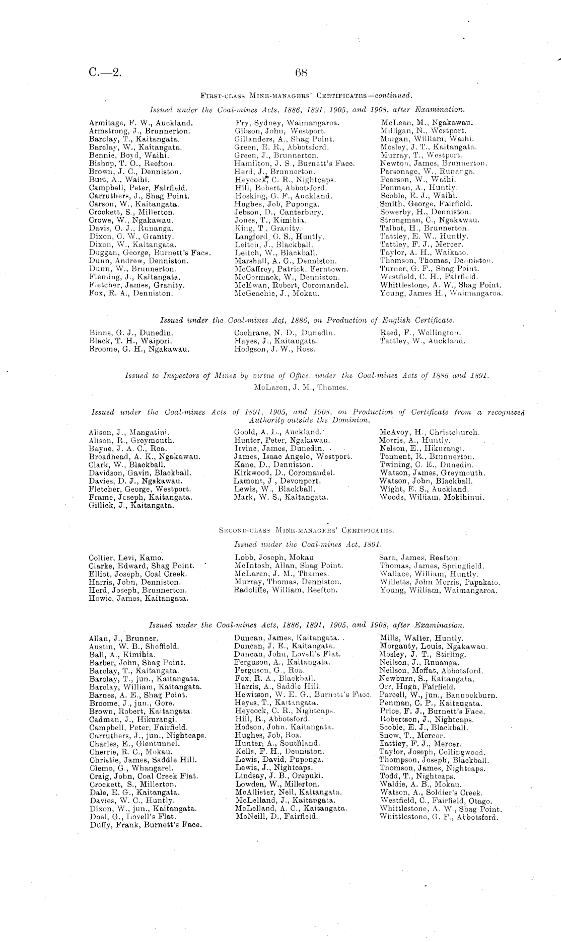 First-class Mine-managers' Certificates— continued. Issued under the Goal-mines Acts, 1886, 1891, 1905, and 1908, after Examination. Armitage, F. W., Auckland. Fry, Sydney, Waimangaroa. McLean, M., Ngakawau. Armstrong, J., Brunnerton. Gibson, John, Westport. Milligan, N., Westport. Barclay, T., Kaitangata. Gillanders, A., Shag Point. Morgan, William, Waihi. Barclay, W., Kaitangata. Green, E. R., Abbotsford. Mosley, J. T., Kaitangata. Bennio, Bojd, Waihi. Green, J., Brunnerton. Murray, T., Westport. Bishop, T. 0., Reefton. Hamilton, J. S., Burnett's Face. Newton, Jamos, Brunnerton. Brown, J. C, Denniston. Herd, J., Brunnorton. Parsonage, W., Runanga. Burt, A., Waihi. Heycock, C. R., Nightcaps. Pearson, W., Waihi. Campbell, Peter, Fairfield. Hill, Robert, Abbotsford. Penman, A., Huntly. Carruthers, J., Shag Point. Hosking, G. F., Auckland. Scoble, E. J., Waihi. Carson, W., Kaitangata. Hughes, Job, Puponga. Smith, George, Fairfield. Crookett, S., Millorton. Jebson, D., Canterbury. Sowerby, H., Denniston. Crowe, W., Ngakawau. Jones, T., Kimihia. Strongman, O, Ngakaw.iu. Davis, 0. J., Runanga. Ki)ig, T , Granity. Talbot, H., Brunnerton. Dixon, 0. W., Granity. Langford, G. S., Huntly. Tattley, E. W., Huntly. Dixon, W., Kaitangata. Leitch, J., Blackball. ' Tattley, F. J., Mercer. Duggan, George, Burnett's Face. Leitch, W., Blackball. Taylor, A. H., Waikato. Dunn, Andrew, Denniston. Marshall, A. G., Denniston. Thomson, Thomas, Denniston. Dunn, W., Brunnerton. McCaffrey, Patrick, Ferntown. Turner, G. F., Shag Point. Fleming, J., Kaitangata. McCormack, W., Denniston. Westfield, C. H., Fairfield. Fietcher, James, Granity. McEwan, Robert, Coromandel. Whittlestone, A. W., Shag Point. Fox, R. A., Denniston. McGeachie, J., Mokau. Young, James H, Waimangaroa. Issued under the Goal-mines Act, 1886, on Production of English Certificate. Binns, G. J., Dunedin. Cochrane, N. D., Dunedin. Reed, F., Wellington. Black, T. H., Waipori. Hayes, J., Kaitangata. Tattley, W., Auckland. Broome, G. H., Ngakawau. Hodgson, J. W., Ross. Issued to Inspectors of Mines by virtue of Office, under the Goal-mines Acts of 1886 and 1891. McLaren, J. M., Thames. Issued under the Coal-mines Acts of 1891, 1905, and 1908, on Production of Certificate from a recognized Authority outside the Dominion. Alison, J., Mangatini. Goold, A. L., Auckland.' McAvoy, H, Christchurch. Alison, R., Greymouth. Hunter, Peter, Ngakawau. Morris, A., Huntly. Bayne, J. A. C, Roa. Irvine, James, Dunedin. • Nelson, E., Hikurangi. Broadhead, A. X., Ngakawau. James, Isaac Angelo, Westport. Torment, R., Brunnerton. Clark, W., Blaokball. Kane, D., Denniston. Twining, C. EC., Dunedin. Davidson, Gavin, Blackball. Kirkwood, D., Coromandel. Watson, James, Greymouth. Davies, D. J., Ngakawau. Lamont, J , Dovonport. Watson, John, Blackball. Fletcher, George, Westport. Lewis, W., Blackball. Wight, E. S., Auckland. Frame, Jcseph, Kaitangata. Mark, W. S., Kaitangata. Woods, William, Mokihitiui. Gillick, J., Kaitangata. Second-class Mine-managers' Certificates. Issued under the Coal-mines Act, 1891. Collier, Levi, Kamo. Lobb, Joseph, Mokau Sara, James, Reefton. Clarke, Edward, Shag Point. Mcintosh, Allan, Shag Point. Thomas, James, Springfield. Elliot, Joseph, Coal Creek. McLaren, J. M., Thames. Wallace, William, Huntly. Harris, John, Denniston. Murray, Thomas, Denniston. Willetts, John Morris, Papakaio. Herd, Joseph, Brunnerton. Radcliffe, William, Roefton. Young, William, Waimangaroa. Howie, James, Kaitangata. Issued under the Goal-mines Acts, 1886, 1891, 1905, and 1908, after Examination. Allan, J., Brunner. Duncan, James, Kaitangata. Mills, Walter, Huntly. Austin, W. 8., Sheffield. Duncan, J. E., Kaitangata. Morganty, Louis, Ngakawau. Ball, A., Kimihia. Duncan, John, Lovell's Flat. Mosley, J. T., Stirling. Barber, John, Shag Point. Ferguson, A., Kaitangata. Neilson, J., Runanga. Barclay, T., Kaitangata. Ferguson, G., Roa. Neilson, Moffat, Abbotsford. Barclay, T., jun., Kaitangata. Fox, R. A., Blaokball. Newburn, S., Kaitangata. Barclay, William, Kaitangata. Harris, A., Saddle Hill. Orr, Hugh, Fairfield. Barnes, A. E., Shag Point. Hewitson, W. E. G., Burnett's Face. Paroell, W., jun., Bannockburn. Broome, J., jun., Gore. Heyes, T., Kaitangata. Penman, C. P., Kaitangata. Brown, Robert, Kaitangata. Heycock, C. R., Nightcaps. Price, F. J., Burnett's Face. Cadman, J., Hikurangi. Hill, R., Abbotsford. Robertson, J., Nightcaps. Campbell, Peter, Fairfield. Hodson, John, Kaitangata. Scoble, E. J., Blaokball. Carruthers, J., jun., Nightcaps. Hughes, Job, Boa. Snow, T., Mercer. Charles, E., Glentunnel. Hunter, A., Southland. Tattley, F. J., Mercer. Cherrie, R. C, Mokau. Kells, F. H., Denniston. Taylor, Joseph, Collingwood. Christie, James, Saddle Hill. Lewis, David, Puponga. Thompson, Joseph, Blackball. Clemo, G., Whangarei. Lewis, J., Nightcaps. Thomson, James, Nightcaps. Craig, John, Coal Creek Flat. Lindsay, J. 8., Orepuki. Todd, T., Nightcaps. Crockett, S., Millerton. Lowden, W., Millerton. Waldie, A. 8., Mokau. Dale, E. G., Kaitangata. McAllister, Neil, Kaitangata. Watson, A., Soldier's Creek. Davies, W. C, Huntly. McLelland, J., Kaitangata. Westfield, C., Fairfield, Otago. Dixon, W., jun., Kaitangata. McLelland, A. O, Kaitangata. Whittlestone, A. W., Shag Point. Doel, G., Lovell's Flat. McNeill, D., Fairfield. Whittlestone, G. F., Atbotsford. Duffy, Frank, Burnett's Faoe.