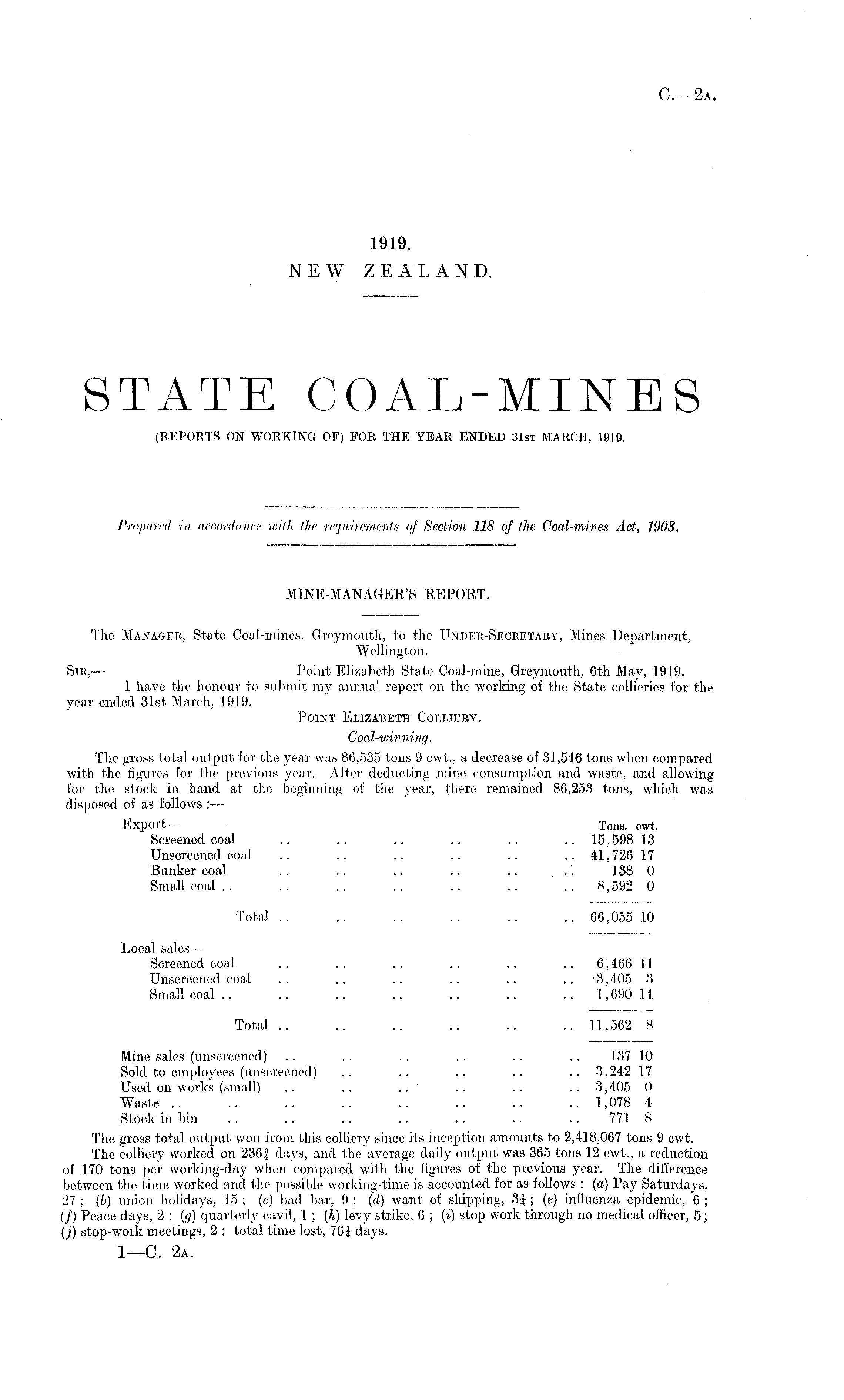 MINE-MANAGER'S REPORT. The Manager, State Coal-mines, Greymovtth, to the UNDER-SECRETARY, Mines Department, Wellington. Sm— Point Elizabeth State Coal-mine, Greymonth, 6th May, 1919. I have the honour to submit my annual report on the working of the State collieries for the year ended 31st March, 1919. Point Elizabeth Colliery. Goal-winning. The gross total output for the year was 86,535 tons 9 cwt., a decrease of 31,546 tons when compared with the figures for the previous year. After deducting mine consumption and waste, and allowing for the stock in hand at the beginning of the year, there remained 86.253 tons, which was disposed of as follows : — Export — Tons. cwt. Screened coal .. .. .. .. .. .. 15,598 13 Unscreened coal .. .. .. .. .. ..41,726 17 Bunker coal .. .. .. .. .. .. 138 0 Small coal .. .. .. .. .. .. .. 8,592 0 Total .. .. .. .. .. .. 66,055 10 Local sales— Screened coal .. .. .. .. .'. .. 6,466 11 Unscreened coal .. .. .. .. .. .. -3,405 3 Small coal .. .. .. .. .. .. .. 1,690 14 Total .. .. .. .. .. .. 11,562 8 Mine sales (unscreened) .. .. .. .. .. .. 137 10 Sold to employees (unscreened) .. .. .. .. .. 3.242 17 Used on works (small) .. .. .. .. .. .. 3,405 0 Waste .. .. .. .. .. .. .. .. 1,078 4 Stock in bin .. .. .. .. .. .. .. 771 8 The gross total output won from this colliery since its inception amounts to 2,418,067 tons 9 cwt. The colliery worked on 2362 days, and the average daily output was 365 tons 12 cwt., a reduction of 170 tons per working-day when compared with the figures of the previous year. The difference between the time worked and the possible working-time is accounted for as follows : (a) Pay Saturdays, 27; (b) union holidays, 15; (c) bad bar, 9; (d) want of shipping, 3J ; (c) influenza epidemic, 6; (/) Peace days, 2 ; (g) quarterly cavil, 1 ; (/..) levy strike, 6 ; (i) stop work through no medical officer. 5; (j) stop-work meetings, 2 : total time lost, 76J days.