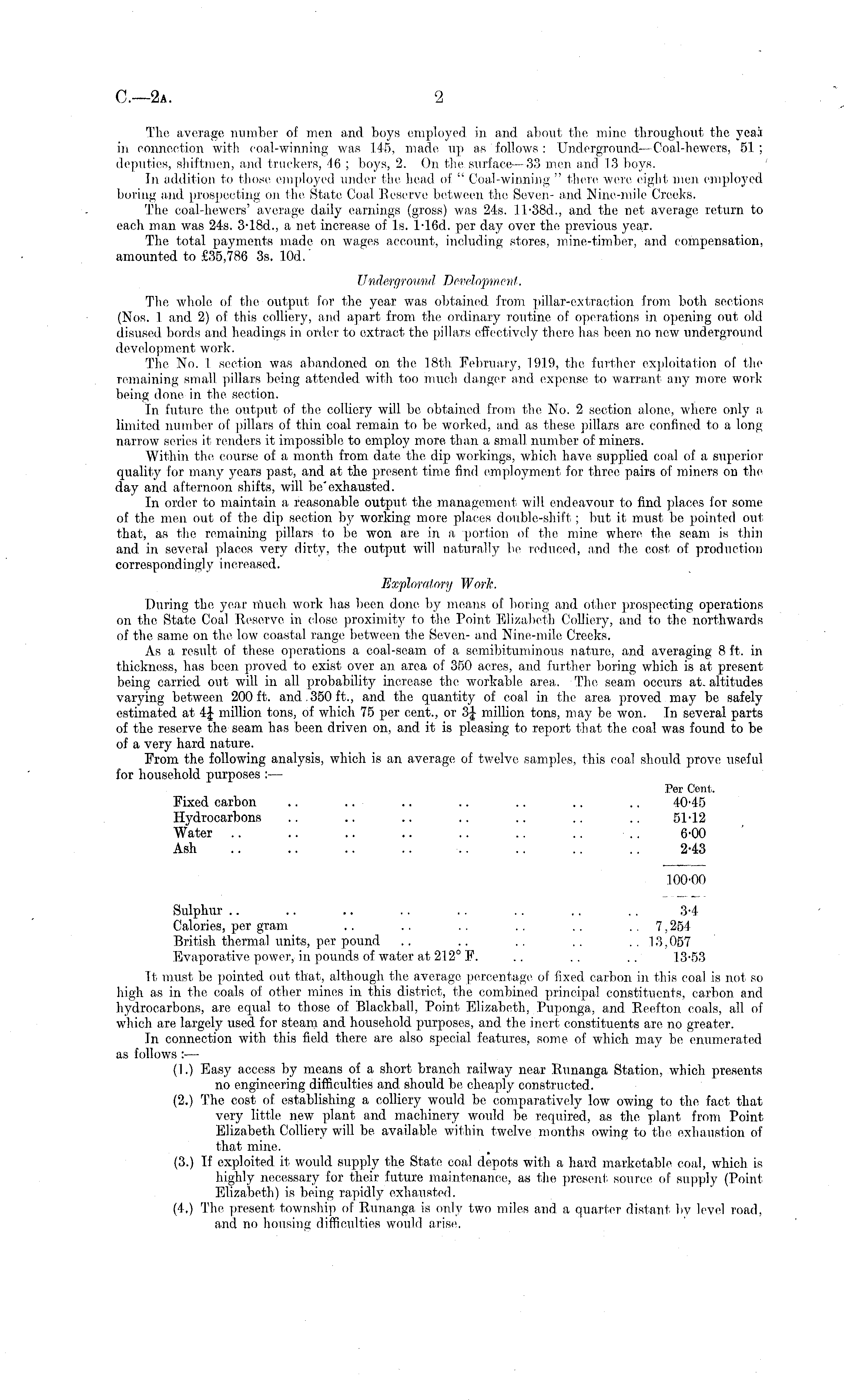 The average number of men and boys employed in and about the mine throughout the yeai in connection with coal-winning was 145, made up as follows: Underground— Coal-hewers, 51; deputies, shiftmen, and truckers, 16 ; boys, 2. On the surface—33 men and 13 boys. In addition to those employed under the head of " Coal-winning " there were eight men employed boring and prospecting on the State Coal Reserve between tho Seven- and Nine-mile Creeks. The coal-hewers' average daily earnings (gross) was 245. 11 - 38 d., and the net average return to each man was 245. 3-18 d., a net increase of Is. l-16d. per day over the previous year. The total payments made on wages account, including stores, mine-timber, and compensation, amounted to £35,786 3s. 10d.' Underground Development. The whole of the output for the year was obtained, from pillar-extraction from both sections (Nos. 1 and 2) of this colliery, and apart from the ordinary routine of operations in opening out old disused bords and headings in order to extract the pillars effectively there has been no now underground development work. The No. 1 section was abandoned on. the 18th February, 1919, the further exploitation of the remaining small, pillars being attended, with too much danger and expense to warrant any more workbeing done in the section. In future the output of the colliery will be obtained from the No. 2 section alone, where only a limited number of pillars of thin coal remain to be worked, and as these, pillars are, confined to a long narrow series it renders it impossible to employ more than a small number of miners. Within, the course of a month from date the dip workings, which have supplied coal of a superior quality for many years past, and at the present time find employment for three pairs of miners on the day and afternoon shifts, will be'exhausted. In order to maintain a reasonable output the management will endeavour to find places for some of the men out of the dip section by working more places double-shift ; but it must be pointed out that, as the remaining pillars to be won are in a portion ot the mine where the seam is thin and in several places very dirty, the output will naturally be reduced, and the cost of production correspond in gly in creased. Exploratory Work. During the year much work has been done by means of boring and oilier prospecting operations on the State Coal Reserve in close proximity to the Point Elizabeth Colliery, and to the northwards of the same on the low coastal range between the Seven- and Nine-mile Creeks. As a result of these operations a coal-seam of a semibituminous nature, and averaging 8 ft. in thickness, has been proved to exist over an area of 350 acres, and further boring which is at present being carried out will in all probability increase the workable, area. The seam occurs at. altitudes varying between 200 ft. and 350 ft., and the quantity of coal in the area proved may be safely estimated at 4J million tons, of which 75 per cent., or 3J million tons, may be won. In several parts of the reserve the scam has been driven on, and it is pleasing to report that the coal was found to be of a very hard nature. From tho following analysis, which is an average of twelve, samples, this coal should prove useful for household purposes : — Por Cent. Fixed carbon .. .. .. .. .. .. .. 40-45 Hydrocarbons .. .. .. .. .. .. .. 5.1-12 Water .. .. .. .. .. .. .. .. 6-00 Ash .. .. .. .. .. .. .. .. 2-43 100-00 Sulphur .. .. .. .. .. .. .. .. 3-4 Calories, per gram .. .. .. .. .. ■ ■ 7,254 British thermal units, per pound .. .. .. .. .. 13,057 Evaporative, power, in pounds of water at 212° F. .. .. .. 13-53 It must be pointed out that, although the average, percentage of fixed carbon in this coal is not so high as in the coals of other mines in this district, the combined principal constituents, carbon, and hydrocarbons, are equal to those of Blackball, Point Elizabeth, Puponga, and Reefton coals, all of which are largely used for steam and household purposes, and the inert constituents are no greater. In connection with this field there are also special features, some of which may be enumerated as follows :— (I.) Easy access by means of a short branch railway near Runanga Station, which presents no engineering difficulties and. should be, cheaply constructed. (2.) The cost of establishing a colliery would be comparatively low owing to the fact that very little new plant and machinery would be required, as the, plant from Point Elizabeth Colliery will be. available within twelve months owing to the exhaustion of that mine. (3.) If exploited, it would supply the State coal depots with a hard marketable coal, which is highly necessary for their future maintenance, as the present source of supply (Point Elizabeth) is being rapidly exhausted. (4.) The present township of Runanga, is only two miles and a quarter distant by level road, and no housing difficulties would arise.