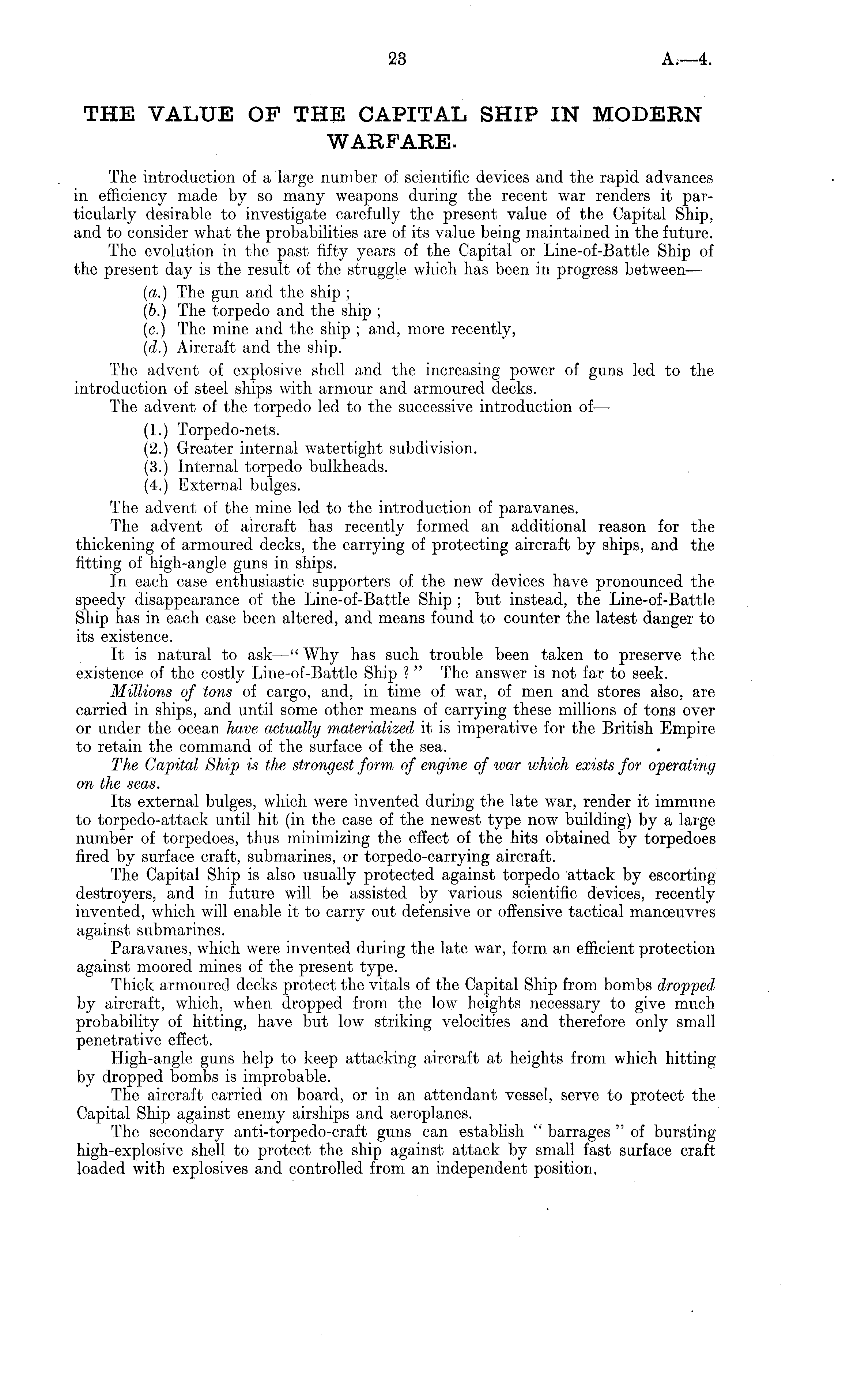 THE VALUE OF THE CAPITAL SHIP IN MODERN WARFARE. The introduction of a large number of scientific devices and the rapid advances in efficiency made by so many weapons during the recent war renders it particularly desirable to investigate carefully the present value of the Capital Ship, and to consider what the probabilities are of its value being maintained in the future. The evolution in the past fifty years of the Capital or Line-of-Battle Ship of the present day is the result of the struggle which has been in progress between— (a.) The gun and the ship ; (b.) The torpedo and the ship ; (c.) The mine and the ship ; and, more recently, (d.) Aircraft and the ship. The advent of explosive shell and the increasing power of guns led to the introduction of steel ships with armour and armoured decks. The advent of the torpedo led to the successive introduction of — (1.) Torpedo-nets. (2.) Greater internal watertight subdivision. (3.) Internal torpedo bulkheads. (4.) External bulges. The advent of the mine led to the introduction of paravanes. The advent of aircraft has recently formed an additional reason for the thickening of armoured decks, the carrying of protecting aircraft by ships, and the fitting of high-angle guns in ships. In each case enthusiastic supporters of the new devices have pronounced the speedy disappearance of the Line-of-Battle Ship ; but instead, the Line-of-Battle Ship has in each case been altered, and means found to counter the latest danger to its existence. It is natural to ask —" Why has such trouble been taken to preserve the existence of the costly Line-of-Battle Ship 1 " The answer is not far to seek. Millions of tons of cargo, and, in time of war, of men and stores also, are carried in ships, and until some other means of carrying these millions of tons over or under the ocean have actually materialized it is imperative for the British Empire to retain the command of the surface of the sea. The Capital Ship is the strongest form of engine of war which exists for operating on the seas. Its external bulges, which were invented during the late war, render it immune to torpedo-attack until hit (in the case of the newest type now building) by a large number of torpedoes, thus minimizing the effect of the hits obtained by torpedoes fired by surface craft, submarines, or torpedo-carrying aircraft. The Capital Ship is also usually protected against torpedo attack by escorting destroyers, and in future will be assisted by various scientific devices, recently invented, which will enable it to carry out defensive or offensive tactical manoeuvres against submarines. Paravanes, which were invented during the late war, form an efficient protection against moored mines of the present type. Thick armoured decks protect the vitals of the Capital Ship from bombs dropped. by aircraft, which, when dropped from the low heights necessary to give much probability of hitting, have but low striking velocities and therefore only small penetrative effect. High-angle guns help to keep attacking aircraft at heights from which hitting by dropped bombs is improbable. The aircraft carried on board, or in an attendant vessel, serve to protect the Capital Ship against enemy airships and aeroplanes. The secondary anti-torpedo-craft guns can establish " barrages " of bursting high-explosive shell to protect the ship against attack by small fast surface craft loaded with explosives and controlled from an independent position.