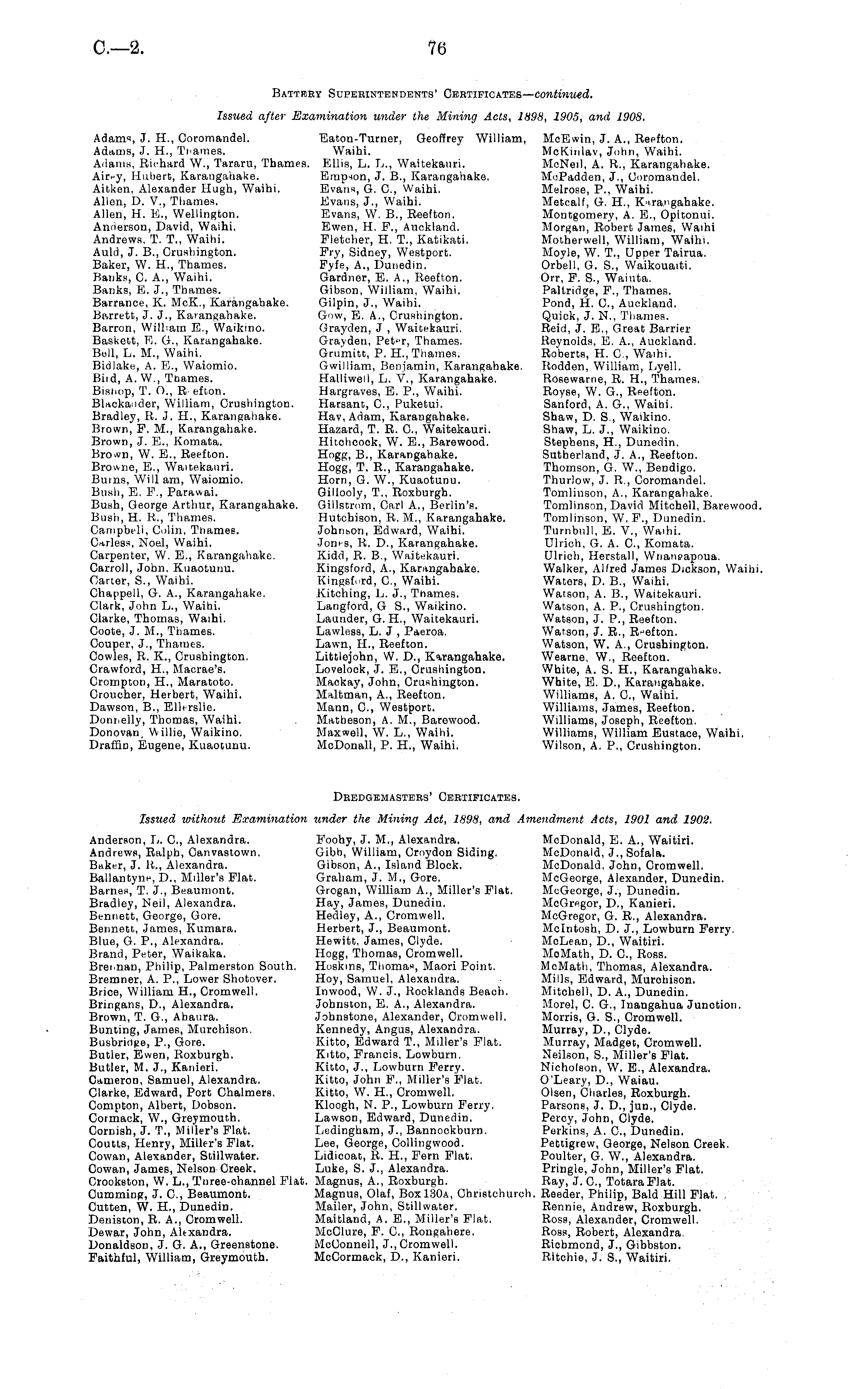 Battkry Superintendents' Certificates— continued. Issued after Examination under the Mining Acts, 1898, 1905, and 1908. Adams, J. H., Coromandel. Eaton-Turner, Geoffrey William, McEwin, J. A., Reefton. Adams, J. H., Thames. Waihi. McKinlav, John, Waihi. Adams, Richard W., Tararu, Thames. Ellis, L. L., Waitekauri. McNeil, A. R., Karangahake. Airpy, Hubert, Karangahake. Empson, J. 8., Karangahake. McPadden, J., Coromandel. Aitken, Alexander Hugh, Waihi. Evans, G. C, Waihi. Melrose, P., Waihi. Allen, D. V., Thames. Evans, J., Waihi. Metcalf, G. H., Karangahake. Allen, H. E., Wellington. Evans, W. 8., Reefton. Montgomery, A. E., Opitonui. Anderson, David, Waihi. Ewen, H. F., Auckland. Morgan, Robert James, Waihi Andrews, T. T., Waihi. Fletcher, H. T., Katikati. Motherwell, William, Waihi. Auld, J. 8., Crushington. Fry, Sidney, Westport. Moyle, W. T., Upper Tairua. Baker, W. H., Thames. Pyfe, A., Dunedin. Orb'ell, G. S., Waikouaiti. Hanks, C. A., Waihi. Gardner, E. A., Reefton. Orr, P. S., Waiuta. Banks, E. J., Thames. Gibson, William, Waihi, Paltridge, P., Thames. Barrance, K. McK., Karangahake. Gilpin, J., Waihi. Pond, H. C, Auckland. Barrett, J. J., Karangahake. Gow, E. A., Crushington. Quick, J. N., Thames. Barron, William E., Waikino. Grayden, J , Waitekauri. Reid, J. E., Great Barrier Baskett, E. G., Karangahake. Grayden, Pet»r, Thames. Reynolds, E. A., Auckland. Bell, L. M., Waihi. Grumitt, P. H., Thames. Roberts, H. C, Waihi. Bidlake, A. E., Waiomio. Gwilliam, Benjamin, Karangahake. Rodden, William, I,yell. Biid, A. W., Tnames. Halliwell, L. V., Karangahako. Rosewarne, R. H., Thames. Bishop, T. 0., R efton. Hargraves, E. P., Waihi. Royse, W. G., Reefton. Blackander, William, Crushington. Harsant, C, Fuketui. Sanford, A. G., Waibi. Bradley, R. J. H., Karangahake. Hay, Adam, Karangahake. Shaw, D. S., Waikino. Brown, P. M., Karangahake. Hazard, T. R. 0., Waitekauri. Shaw, L. J., Waikino. Brown, J. E., Komata. Hitchcook, W. E., Barewood. Stephens, H., Dunedin. Brown, W. E., Reefton. Hogg, 8., Karangahake. Sutherland, J. A., Reefton. Browne, E., Waitekauri. Hogg, T. R., Karangahake. Thomson, G. W., Bendigo. Bums, Will am, Waiomio. Horn, G. W., Kuaotunu. Thurlow, J. R,, Coromandel. Bush, E. P., Parawai. Gillooly, T., Roxburgh. Tomlinson, A., Karangahake. Bush, George Arthur, Karangahake. Gillstrom, Carl A., Berlin's. Tomlinson, David Mitchell, Barewood, Bush, H. R., Thames. Hutchison, R. M., Karangahake. Tomlinson, W. P., Dunedin. Campbell, Colin. Thames. Johnson, Pjdward, Waihi. Tumbull, E. V., Waihi. Curless, Noel, Waihi. Jones, R. D., Karangahake. Ulrich, G. A. C, Komata. Carpenter, W. E., Karangahake. Kidd, R. 8., Waitekauri. Ulrich, Herstall, Whanpapoua. Carroll, John. Kuaotunu. Kingsford, A., Karangahake. Walker, Alfred James Dickson, Waihi Carter, S., Waihi. Kingsfurd, C, Waihi. Waters, D. 8., Waihi. Chappell, G. A., Karangahake. Kitching, L. J., Tnames. Watson, A. 8., Waitekauri. Clark, John L., Waihi. Langford, G S., Waikino. Watson, A. P., Crushington. Clarke, Thomas, Waihi. Launder, G. H., Waitekauri. Watson, J. P., Reefton. Coote, J. M., Thames. Lawless, L. J , Paeroa. Watson, J. R., R-efton. Couper, J., Thames. Lawn, H., Reefton. Watson, W. A., Crushington. Cowles, R. X., Crushington. Littlejohn, W. D., Karangahake. Wearne, W., Reefton. Crawford, H., Macrae's. Lovelock, J. E., Crushington. White, A. S. H., Karangahake. Crompton, H., Maratoto. Mackay, John, Crushington. White, E. D., Karangahake. Oroucher, Herbert, Waihi. Maltman, A., Reefton. Williams, A. C, Waihi. Dawson, 8., Elhrslie. Mann, C, Westport. Williams, James, Reefton. Donnelly, Thomas, Waihi. Matbeson, A. M., Barewood. Williams, Joseph, Reefton. Donovan, Willie, Waikino, Maxwell, W. L., Waihi. Williams, William Eustace, Waihi, Draffin, Eugene, Kuaotunu. McDonall, P. H., Waihi. Wilson, A. P., Crushington. Dredgemastehs' Certificates. Issued icithout Examination under the Mining Act, 1898, and Amendment Acts, 1901 and 1902. Anderson, L. C, Alexandra. Poohy, J. M., Alexandra. McDonald, E. A., Waitiri. Andrews, Ralph, Canvastown. Gibb, William, Croydon Siding. McDonald, J., Sofala. Baker, J. R., Alexandra. Gibson, A., Island Block. McDonald, John, Cromwell. Ballantyne, D., Miller's Plat. Graham, J. M., Gore. McGeorge, Alexander, Dunedin. Barnes, T. J., Beaumont. Grogan, William A., Miller's Plat. McGeorge, J., Dunedin. Bradley, Neil, Alexandra. Hay, James, Dunedin. McGregor, D., Kanieri. Bennett, George, Gore. Hedley, A., Cromwell. McGregor, G. R., Alexandra. Bennett, James, Kumara. Herbert, J., Beaumont. Mcintosh, D. J., Lowburn Perry. Blue, G. P., Alexandra. Hewitt, James, Clyde. McLean, D., Waitiri. Brand, Peter, Waikaka. Hogg, Thomas, Cromwell. MoMath, D. C, Ross. Brennan, Philip, Palmerston South. Hoskins, Thomas, Maori Point. MoMath, Thomas, Alexandra. Bremner, A. P., Lower Shotover. Hoy, Samuel, Alexandra. Mills, Edward, Murohison. Brice, William H., Cromwell. Inwood, W. J., Rocklands Beach. Mitchell, D. A., Dunedin. Bringans, D., Alexandra. Johnston, E. A., Alexandra. Morel, C. G., Inangahua Junotion. Brown, T. G., Ahaura. Johnstone, Alexander, Cromwell, Morris, G. S., Cromwell. Bunting, James, Murchison. Kennedy, Angus, Alexandra. Murray, D., Clyde. Busbrioge, P., Gore. Kitto, Edward T., Miller's Plat. Murray, Madget, Cromwell. Butler, Ewen, Roxburgh. Kitto, Francis, Lowburn, Neilson, S., Miller's Plat. Butler, M. J., Kanieri. Kitto, J., Lowburn Perry. Nicholson, W. E., Alexandra. Cameron, Samuel, Alexandra. Kitto, John P., Miller's Plat. O'Leary, D., Waiau. Clarke, Edward, Port Chalmers. Kitto, W. H., Cromwell. Olsen, Charles, Roxburgh. Compton, Albert, Dobson. Kloogh, N. P., Lowburn Ferry. Parsons, J. D., jun., Clyde. Cormack, W., Greymouth. Lawson, Edward, Dunedin. Percy, John, Clyde. Cornish, J. T., Miller's Plat. Ledingham, J., Bannockburn, Perkins, A. C, Dunedin. Coutts, Henry, Miller's Flat. Lee, George, Collingwood. Pettigrew, George, Nelson Creek. Cowan, Alexander, Stillwater. Lidicoat, R. H., Pern