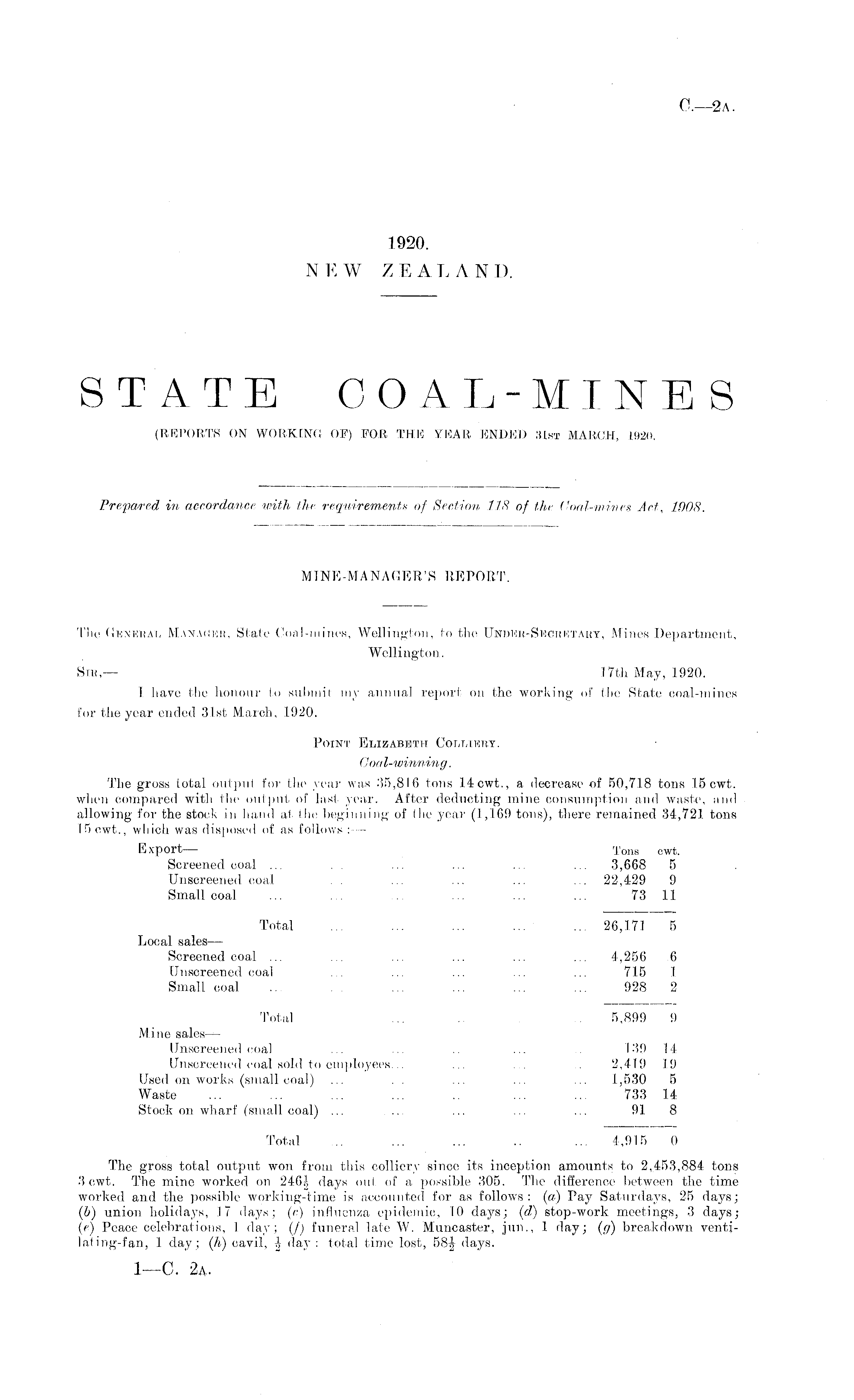 The (tEnkhaj, Manager, State Coal-mines, Wellington, to the Under-Secretary, Mines Department, Wellington. Sir,— 17th May, 1920. I have the honour to submit my annual report on the working of the State coal-mines for the year ended 31st March, 1920. Point Elizabeth Colliery. Goal-winning. The gross total output for the year was 35,816 tons 14 cwt., a decrease of 50,718 tons 1.5 cwt. when compared witli the output of last year. After deducting mine consumption and waste, and allowing for the stock in hand at the beginning of the year (1,169 tons), there remained 34,721 tons 15 cwt., which was disposed of as follows : — Export— Tons cwt. Screened coal ... . ... ... ... ... 3,668 5 Unscreened coal ... ... ... ... 22,429 9 Small coal ... ... ... ... 7311 Total ... ... ... ... ... 26,171 5 Local sales — Screened coal ... ... ... ... ... ... 4,256 6 Unscreened coal . . ... ... ... ... 715 1 Small coal ... ... ... ... 928 2 Total 5,899 9 Mine salesUnscreened coal ... ... ... 139 14 Unscreened coal sold to employees... ... ... 2,419 19 Used on works (small coal) ... ... ... ... 1,530 5 Waste ... ... ... ... .. ... ... 733 14 Stock on wharf (small coal) ... .. ... ... ... 91 8 Total ... ... .. ... 4,915 0 The gross total output won from this colliery since its inception amounts to 2,453,884 tons 3 cwt. The mine worked on 246J days out of a possible 305. The difference between the time worked and the possible working-time is accounted for as follows: (a) Pay Saturdays, 25 days; (b) union holidays, .17 days; (c) influenza epidemic, 10 days; (d) stop-work meetings, 3 days; (e) Peace celebrations, 1 day; (/) funeral late W. Muncaster, jun., 1 day; (g) breakdown venti-lating-fan, 1 day; (A) cavil, day: total time lost, days.
