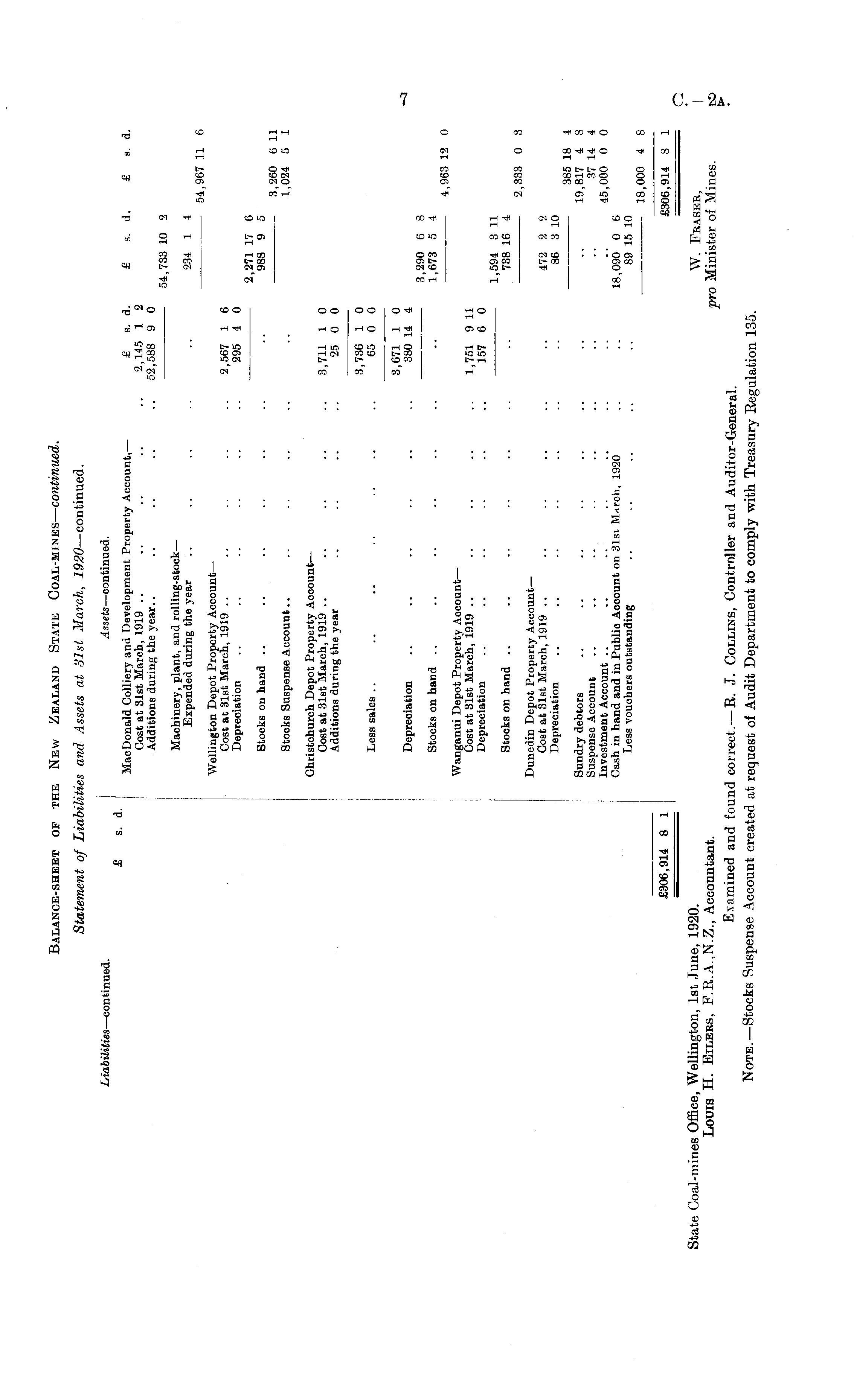 Balance-sheet of the New Zealand State Coal-mines— continued. Statement of Liabilities and Assets at 31st March, 1920— continued. Liabilities— continued. Assets— continued. £ s. d. Mac Donald Colliery and Development Property Account,— £ s. d. £ s. d. £ s. d. Cost at 31st March, 1919 .. .. .. .. .. 2,145 1 2 Additions during the year.. .. .. .. .. 52,588 9 0 54,733 10 2 Machinery, plant, and rolling-stock— Expended during the year .. .. .. .. 234 1 4 54,967 11 6 Wellington Depot Property Account— Cost at 31st March, 1919 .. .. .. .. 2,567 1 6 Depreciation .. .. .. .. .. .. 295 4 0 2,271 17 6 Stocks on hand .. .. .. .. .. .. .. 988 9 5 3,260 6 11 Stocks Suspense Account.. .. ~ .. .. .. 1,024 5 1 Christchurch Depot Property Account— Cost at 31st March, 1919 .. .. .. .. .. 3,711 1 0 Additions during the year .. .. .. .. 25 0 0 3,736 1 0 Less sales .. .. .. .. .. .. .. 65 0 0 3,671 1 0 Depreciation .. .. .. .. .. .. 380 14 4 3,290 6 8 Stocks on hand .. .. .. .. .. .. .. 1,673 5 4 4,963 12 0 Wanganui Depot Property Aocount— Cost at 31st March, 1919 .. .. .. .. .. 1,751 9 11 Depreciation .. .. .. .. .. 157 6 0 1,594 3 11 Stocks on hand .. .. .. .. .. .. .. 738 16 4 2,333 0 3 Dunedin Depot Property Account— Cost at 31st March, 1919 .. .. .. .. .. .. 472 2 2 Depreciation .. .. .. .. .. .. .. 86 3 10 —- 385 18 4 Sundry debtors .. .. .. .. .. .. .. .. 19,817 4 8 Suspense Account .. .. .. .. .. .. .. 37 14 4 Investment Account .. .. .. .. .. .. .. .. 45,000 0 0 Cash in hand and in Publio Account on 31st. March, 1920 .. .. 18,090 0 6 Less vouchers outstanding .. .. .. .. .. 89 15 10 18,000 4 8 £306,914 8 1 £306,914 8 1 State Coal-mines Office, Wellington, Ist June, 1920. W. Fbasek, Louis H. Eilers, F.R.A.,N.Z., Accountant. pro Minister of Mines. Examined and found correct.— R. J. Collins, Controller and Auditor-General. Note.—Stocks Suspense Account created at request of Audit Department to comply with Treasury Regulation 135.