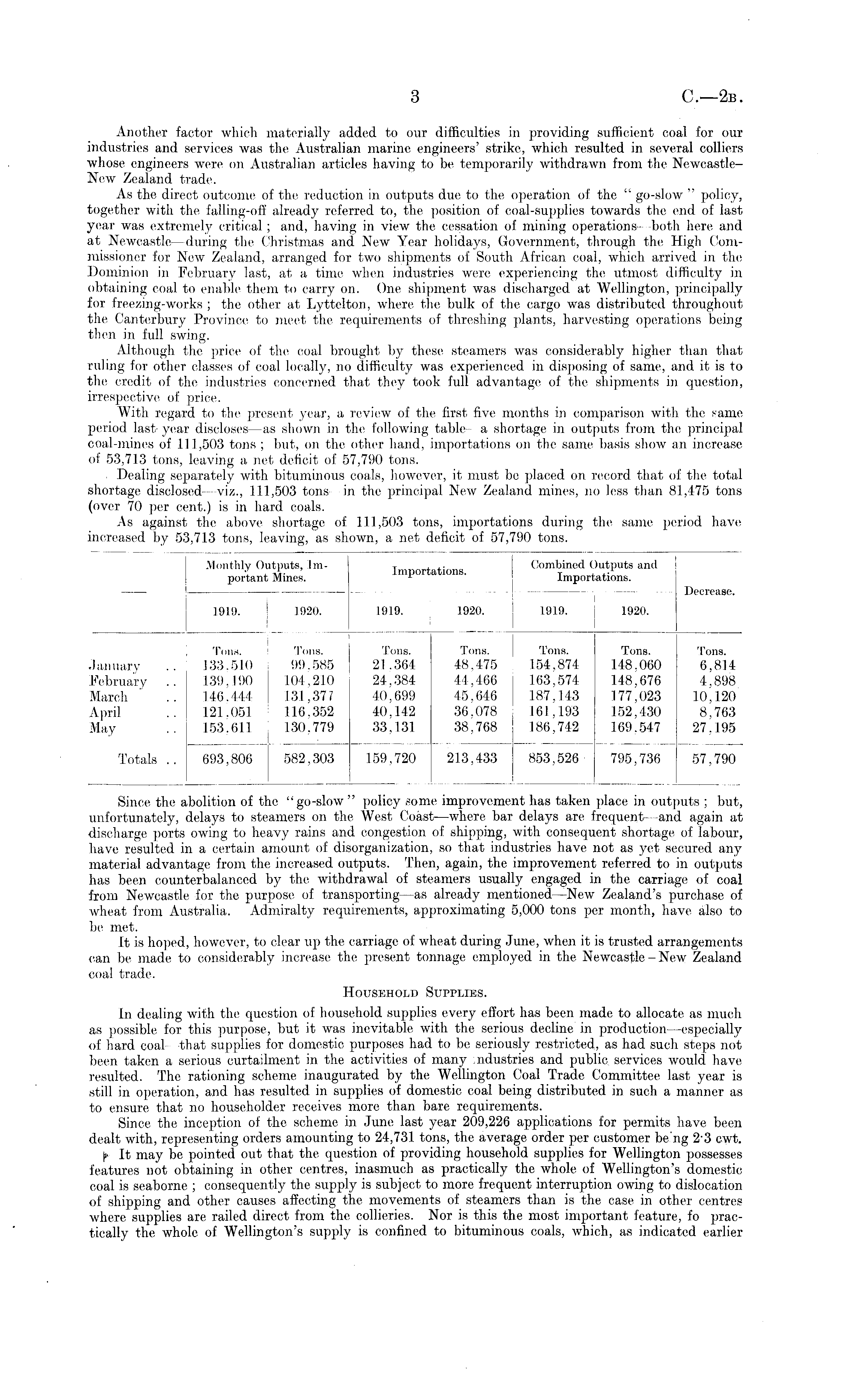 Monthly Outputs, Important Mines. Importations. Combined ( Import mtymts and ations. Decrease. 1910. 1920. 1919. 1920. 1919. 1920. January February March April May i Tons. Tons. 133.510 99.585 139.190 104,210 146.444 131.377 121.051 116,352 153.611 130.779 693,806 582,303 i Tons. Tons. 21.364 48.475 24,384 44,466 40.699 45,646 40,112 36.078 33.131 38.768 Tons. 154,874 163,574 187.143 161,193 186,742 Tons. 148,060 148,676 177,023 152,430 169.547 Tons. 6.814 4,898 10,120 8,763 27,195 Totals .. 159.720 213,433 213,433 853,526 853,526 795,736 57,790