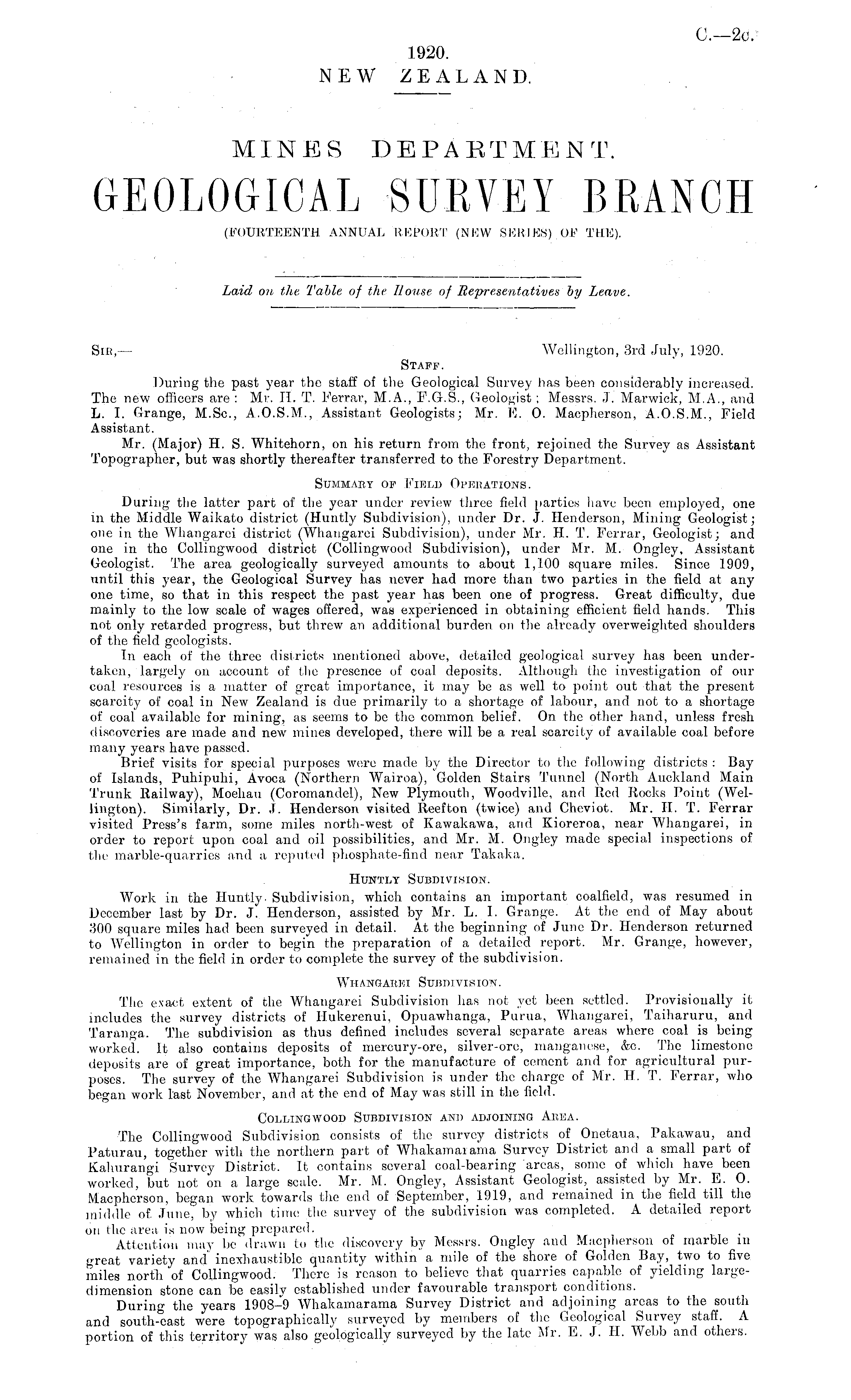 Sir,— Wellington, 3rd July, 1920. Staff. During the past year the staff of the Geological Survey has been considerably increased. The new officers are : Mr. H. T. Ferrar, M.A., F.G.S., Geologist ; Messrs. J. Marwick, M.A., and L. I. Grange, M.Sc, A.0.5.M., Assistant Geologists; Mr. E. 0. Macpherson, A.0.5.M., Field Assistant. Mr. (Major) H. S. Whitehorn, on his return from the front, rejoined the Survey as Assistant Topographer, but was shortly thereafter transferred to the Forestry Department. Summary of Field Opedations. During the latter part of the year under review three field parties have been employed, one in the Middle Waikato district (Huntly Subdivision), under Dr. J. Henderson, Mining Geologist; one in the Whangarei district (Whangarei Subdivision), under Mr. H. T. Ferrar, Geologist; and one in the Collingwood district (Collingwood Subdivision), under Mr. M. Ongley, Assistant Geologist. The area geologically surveyed amounts to about 1,100 square miles. Since 1909, until this year, the Geological Survey has never had more than two parties in the field at any one time, so that in this respect the past year has been one of progress. Great difficulty, due mainly to the low scale of wages offered, was experienced in obtaining efficient field hands. This not only retarded progress, but threw an additional burden on the already overweighted shoulders of the field geologists. In each of the three districts mentioned above, detailed geological survey has been undertaken, largely on account of the presence of coal deposits. Although the investigation of our coal resources is a matter of great importance, it may be as well to point out that the present scarcity of coal in New Zealand is due primarily to a shortage of labour, and not to a shortage of coal available for mining, as seems to be the common belief. On the other hand, unless fresh discoveries are made and new mines developed, there will be a real scarcity of available coal before many years have passed. Brief visits for special purposes were made by the Director to the following districts : Bay of Islands, Puhipuhi, Avoca (Northern Wairoa), Golden Stairs Tunnel (North Auckland Main Trunk Railway), Moehau (Coromandel), New Plymouth, Woodville, and Red Rocks Point (Wellington). Similarly, Dr. J. Henderson visited Reefton (twice) and Cheviot. Mr. H. T. Ferrar visited Press's farm, some miles north-west of Kawakawa, and Kioreroa, near Whangarei, in order to report upon coal and oil possibilities, and Mr. M. Ongley made special inspections of the marble-quarries and a reputed phosphate-find near Takaka. Huntly Subdivision. Work in the Huntly. Subdivision, which contains an important coalfield, was resumed in December last by Dr. J. Henderson, assisted by Mr. L. I. Grange. At the end of May about 300 square miles had been surveyed in detail. At the beginning of June Dr. Henderson returned to Wellington in order to begin the preparation of a detailed report. Mr. Grange, however, remained in the field in order to complete the survey of the subdivision. Whangarei Subdivision. The exact extent of the Whangarei Subdivision has not yet been settled. Provisionally it includes the survey districts of Hukerenui, Opuawhanga, Purua, Whangarei, Taiharuru, and Taranga. The subdivision as thus defined includes several separate areas where coal is being worked. It also contains deposits of mercury-ore, silver-ore, manganese, &c. The limestone deposits are of great importance, both for the manufacture of cement and for agricultural purposes. The survey of the Whangarei Subdivision is under the charge of Mr. H. T. Ferrar, who began work last November, and at the end of May was still in the field. Collingwood Subdivision and adjoining Area. The Collingwood Subdivision consists of the survey districts of Onetaua, Pakawau, and Paturau, together with the northern part of Whakamaiama Survey District and a small part of Kahurangi Survey District. It contains several coal-bearing "areas, some of which have been worked, but not on a large scale. Mr. M. Ongley, Assistant Geologist, assisted by Mr. E. O. Macpherson, began work towards the end of September, 1919, and remained in the field till the middle of. June, by which time the survey of the subdivision was completed. A detailed report on the area is now being prepared. , Attention may be drawn to the discovery by Messrs. Ongley and Macpherson of marble in great variety and' inexhaustible quantity within a mile of the shore of Golden Bay, two to five miles north of Collingwood. There is reason to believe that quarries capable of yielding largedimension stone can be easily established under favourable transport conditions. During the years 1908-9 Whakamarama Survey District and adjoining areas to the south and south-east were topographically surveyed by members of the Geological Survey staff. A portion of this territory was also geologically surveyed by the late Mr. E. J. H. Webb and others.