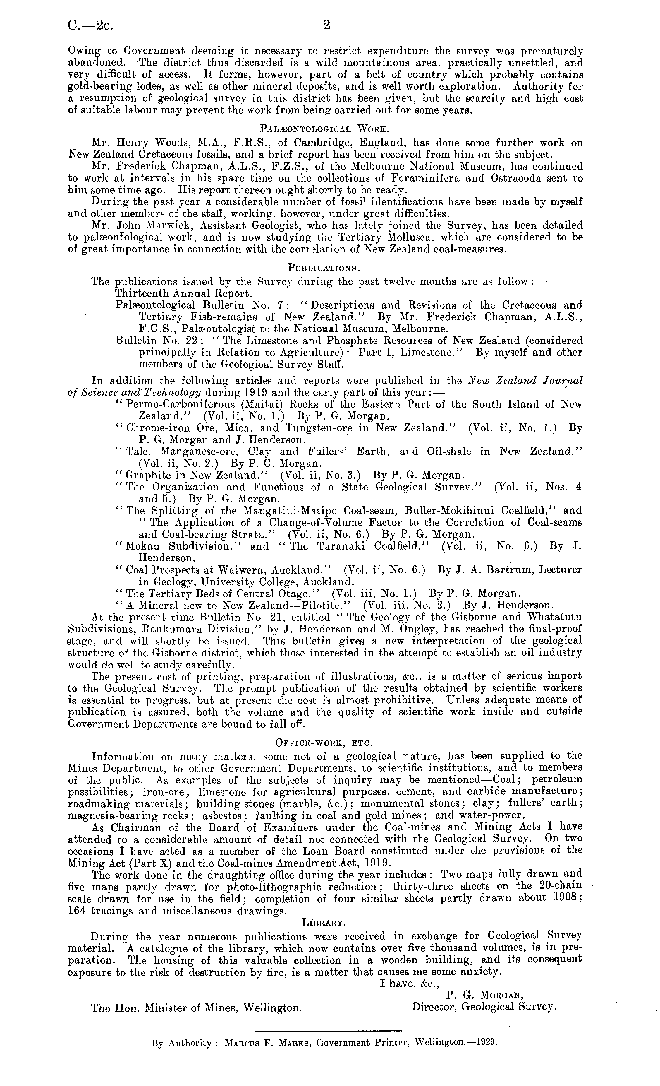 Owing to Government deeming it necessary to restrict expenditure the survey was prematurely abandoned. The district thus discarded is a wild mountainous area, practically unsettled, and very difficult of access. It forms, however, part of a belt of country which probably contains gold-bearing lodes, as well as other mineral deposits, and is well worth exploration. Authority for a resumption of geological survey in this district has been given, but the scarcity and high cost of suitable labour may prevent the work from being carried out for some years. Pal_eontological Work. Mr. Henry Woods, M.A., F.R.S., of Cambridge, England, has done some further work on New Zealand Cretaceous fossils, and a brief report has been received from him on the subject. Mr. Frederick Chapman, A.L.S., F.Z.S., of the Melbourne National Museum, has continued to work at intervals in his spare time on the collections of Foraminifera and Ostracoda sent to him some time ago. His report thereon ought shortly to be ready. During the past year a considerable number of fossil identifications have been made by myself and other members of the staff, working, however, under great difficulties. Mr. John Marwick, Assistant Geologist, who has lately joined the Survey, has been detailed to palseonfological work, and is now studying the Tertiary Mollusca, which are considered to be of great importance in connection with the correlation of New Zealand coal-measures. Publications. The publications issued by the Survey during the past twelve months are as follow : — Thirteenth Annual Report. Paleeontological Bulletin No. 7: "Descriptions and Revisions of the Cretaceous and Tertiary Fish-remains of New Zealand." By Mr. Frederick Chapman, A.L.S., F.G.S., Pala-ontologist to the National Museum, Melbourne. Bulletin No. 22 : " The Limestone and Phosphate Resources of New Zealand (considered principally in Relation to Agriculture) : Part I, Limestone." By myself and other members of the Geological Survey Staff. In addition the following articles and reports were published in the New Zealand Journal of Science and Technology during 1919 and the early part of this year : — " Permo-Carboniferous (Maitai) Rocks of the Eastern Part of the South Island of New Zealand." (Vol. ii, No. 1.) By P. G. Morgan. "Chrome-iron Ore, Mica, and Tungsten-ore in New Zealand." (Vol. ii, No. 1.) By P. G. Morgan and J. Henderson. " Talc, Manganese-ore, Clay and Fullers' Earth, and Oil-shale in New Zealand." (Vol. ii, No. 2.) By P. G. Morgan. " Graphite in New Zealand." (Vol. ii, No. 3.) By P. G. Morgan. " The Organization and Functions of a State Geological Survey." (Vol. ii, Nos. 4 and 5.) By P, G. Morgan. " The Splitting of the Mangatini-Matipo Coal-seam, Buller-Mokihinui Coalfield," and " The Application of a Change-of-Volume Factor to the Correlation of Coal-seams and Coal-bearing Strata." (Vol. ii, No. 6.) By P. G. Morgan. " Mokau Subdivision," and "The Taranaki Coalfield." (Vol. ii, No. 6.) By J. Henderson. " Coal Prospects at Waiwera, Auckland." (Vol. ii, No. 6.) By J. A. Bartrum, Lecturer in Geology, University College, Auckland. " The Tertiary Beds of Central Otago." (Vol. iii, No. 1.) By P. G. Morgan. "A Mineral new to New Zealand—Pilotite." (Vol. iii, No. 2.) By J. Henderson. At the present time Bulletin No. 21, entitled " The Geology of the Gisborne and Whatatutu Subdivisions, Raukumara Division," by J. Henderson and M. Ongley, has reached the final-proof stage, and will shortly be issued. This bulletin gives a new interpretation of the geological structure of the Gisborne district, which those interested in the attempt to establish an oil industry would do well to study carefully. The present cost of printing, preparation of illustrations, &c, is a matter of serious import to the Geological Survey. The prompt publication of the results obtained by scientific workers is essential to progress, but at present the cost is almost prohibitive. Unless adequate means of publication is assured, both the volume and the quality of scientific work inside and outside Government Departments are bound to fall off. Office-work, etc. Information on many matters, some not of a geological nature, has been supplied to the Mines Department, to other Government Departments, to scientific institutions, and to members of the public. As examples of the subjects of inquiry may be mentioned —Coal; petroleum possibilities; iron-ore; limestone for agricultural purposes, cement, and carbide manufacture; roadmaking materials; building-stones (marble, &c); monumental stones; clay; fullers' earth; magnesia-bearing rocks; asbestos; faulting in coal and gold mines; and water-power. As Chairman of the Board of Examiners under the Coal-mines and Mining Acts I have attended to a considerable amount of detail not connected with the Geological Survey. On two occasions I have acted as a member of the Loan Board constituted under the provisions of the Mining Act (Part X) and the Coal-mines Amendment Act, 1919. The work done in the draughting office during the year includes : Two maps fully drawn and five maps partly drawn for photo-lithographic reduction; thirty-three sheets on the 20-chain scale drawn for use in the field; completion of four similar sheets partly drawn about 1908; 164 tracings and miscellaneous drawings. Library. During the year numerous publications were received in exchange for Geological Survey material. A catalogue of the library, which now contains over five thousand volumes, is in preparation. The housing of this valuable collection in a wooden building, and its consequent exposure to the risk of destruction by fire, is a matter that causes me some anxiety. I have, ko., P. G. Morgan, The Hon. Minister of Mines, Wellington. Director, Geological Survey.