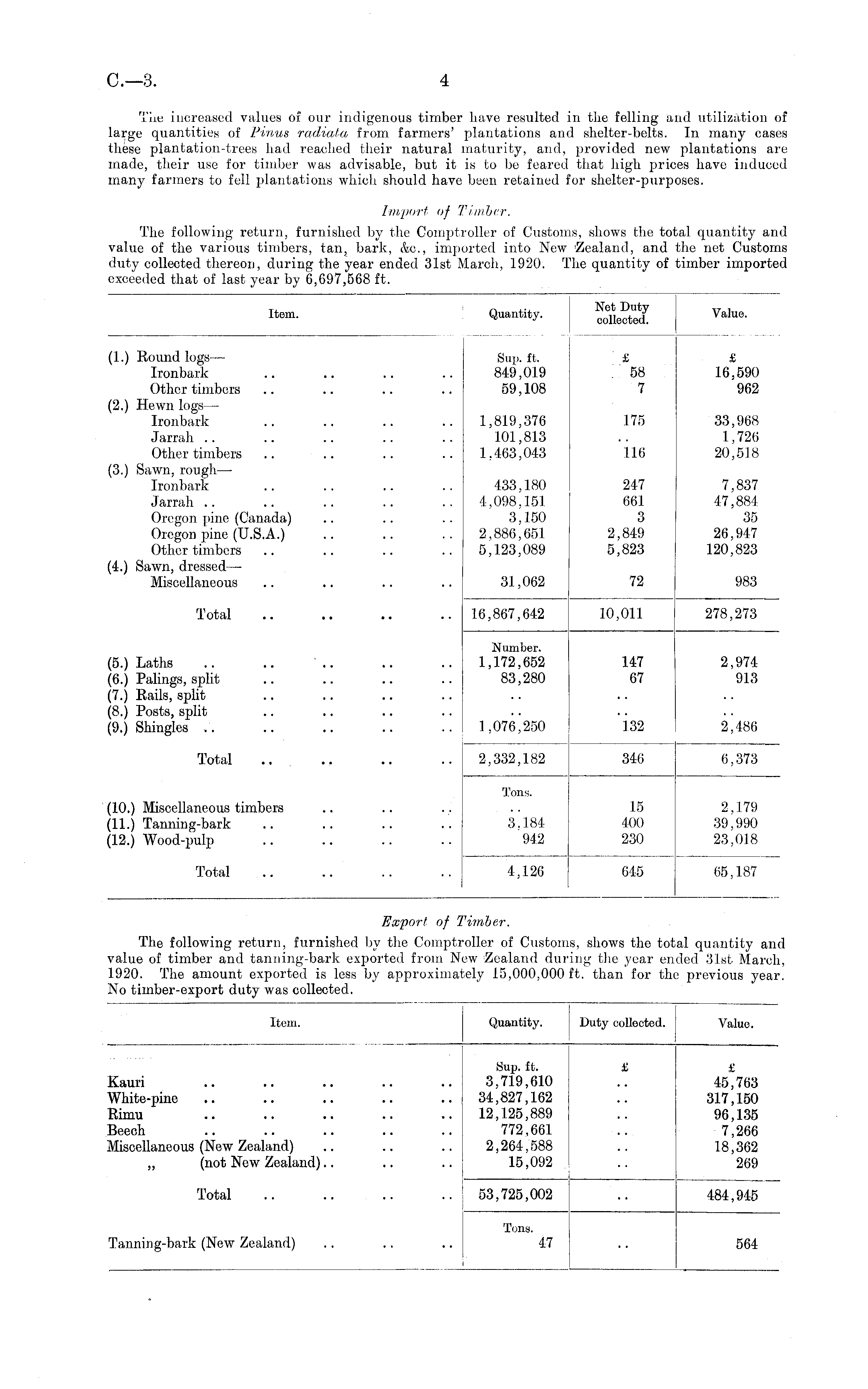The increased values of our indigenous timber have resulted in the felling and utilization of large quantities of Pinus radiata from farmers' plantations and shelter-belts. In many cases these plantation-trees had reached their natural maturity, and, provided new plantations are made, their use for timber was advisable, but it is to be feared that high prices have induced many farmers to fell plantations which should have been retained for shelter-purposes. Import of Timber. The following return, furnished by the Comptroller of Customs, shows the total quantity and value of the various timbers, tan, bark, &0., imported into New 'Zealand, and the net Customs duty collected thereon, during the year ended 31st March, 1920. The quantity of timber imported exceeded that of last year by 6,697,568 ft.