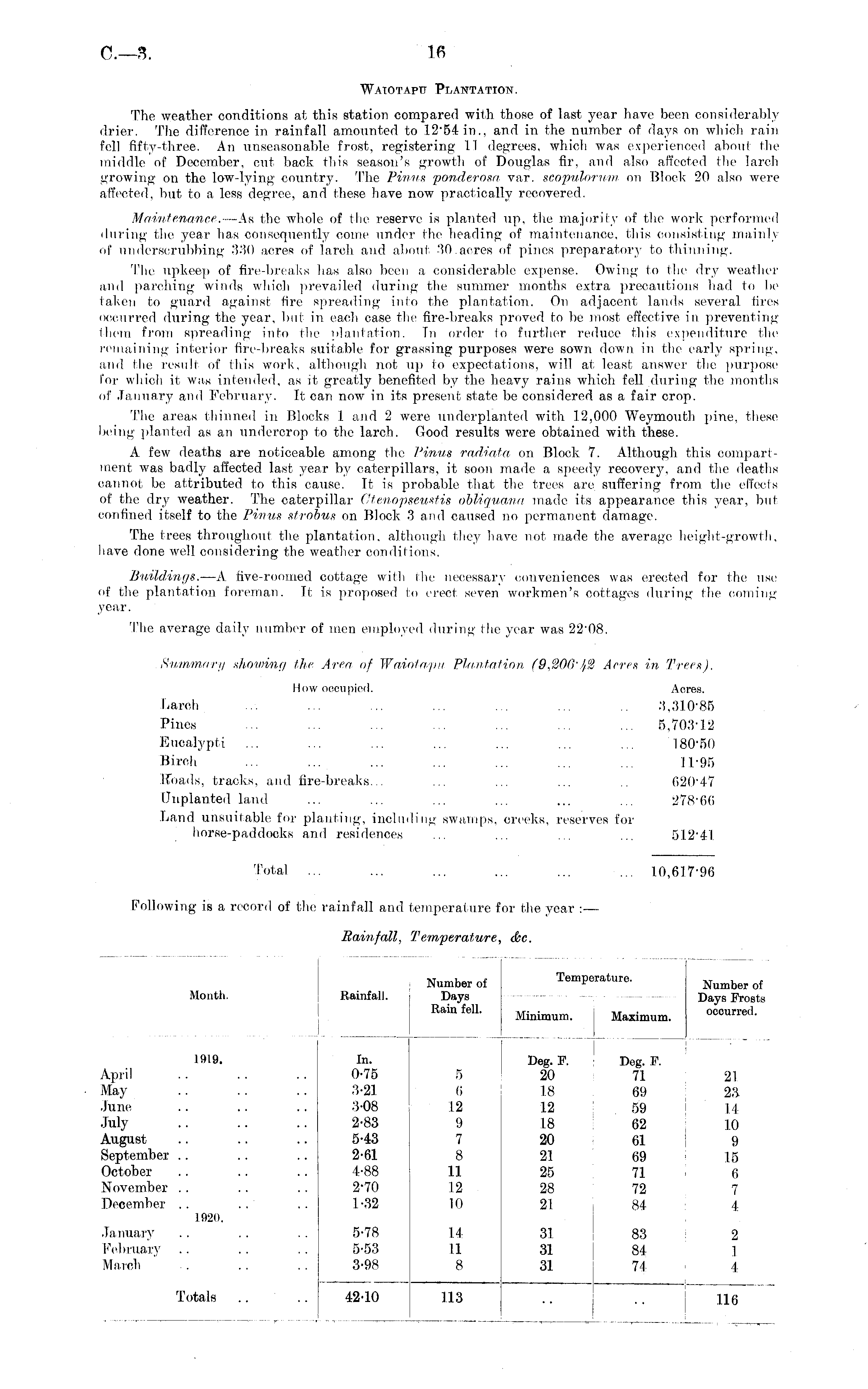 Month. 1919. April May June July August September . . October November . . December .. Rainfall. In. 0-75 3-21 3-08 2-83 5-43 2-61 4-88 2-70 1-32 Number of Temperature. Number rf Days Days Frosts Rain fell. Minimum. Maximum. occurred. Deg. F. Deg. F. 5 20 71 21 6 18 69 23 12 12 59 1.4 9 18 62 10 7 20 61 9 8 21 69 15 11 25 71 6 12 28 72 7 10 21 84 4 i 1920. January February March 5-78 5-53 3-98 14 31 83 2 11 31 84 1 8 31 74 4 Totals 42-10 113 116