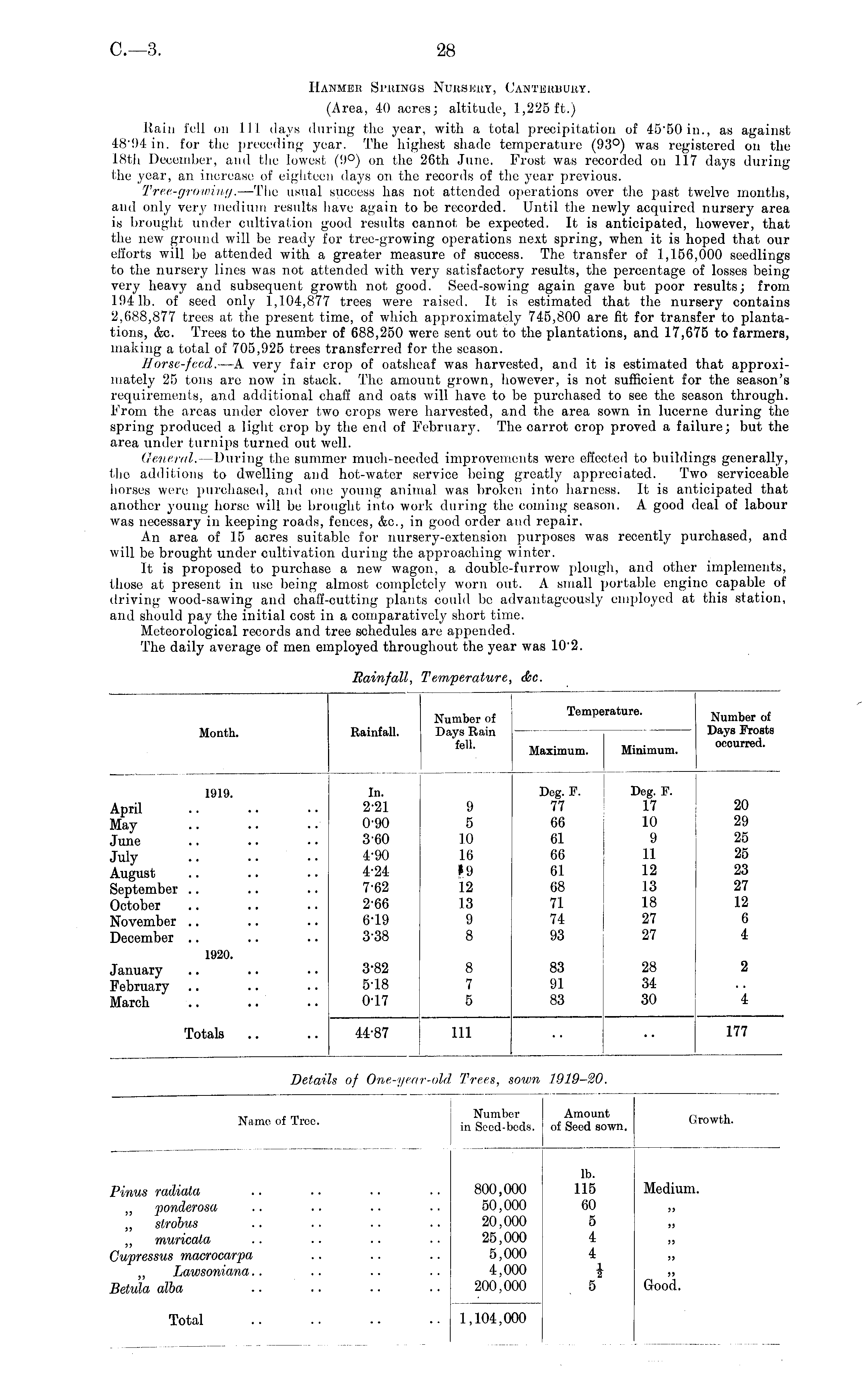 Hanmer Springs Nursery, Cantor-bury. (Area, 40 acres; altitude, 1,225 ft.) Rain fell on 111 days during the year, with a total precipitation of 45'50in., as against 4894 in. for the preceding year. The highest shade temperature (93°) was registered on the 18th December, and the lowest (9°) on the 26th June. Frost, was recorded on 117 days during the year, an increase of eighteen days on the records of the year previous. Tree-growing. —The usual success has not attended operations over the past twelve months, and only very medium results have again to be recorded. Until the newly acquired nursery area is brought under cultivation good results cannot be expected. It is anticipated, however, that the new ground will be ready for tree-growing operations next spring, when it is hoped that our efforts will be attended with a greater measure of success. The transfer of 1,156,000 seedlings to the nursery lines was not attended with very satisfactory results, the percentage of losses being very heavy and subsequent growth not good. Seed-sowing again gave but poor results; from 1941b. of seed only 1,104,877 trees were raised. It is estimated that the nursery contains 2,688,877 trees at the present time, of which approximately 745,800 are fit for transfer to plantations, &c. Trees to the number of 688,250 were sent out to the plantations, and 17,675 to farmers, making a total of 705,925 trees transferred for the season. Horse-feed. —A very fair crop of oatsheaf was harvested, and it is estimated that approximately 25 tons are now in stack. The amount grown, however, is not sufficient for the season's requirements, and additional chaff and oats will have to be purchased to see the season through. From the areas under clover two crops were harvested, and the area sown in lucerne during the spring produced a light crop by the end of Februarjr. The carrot crop proved a failure; but the area under turnips turned out well. General. —During the summer much-needed improvements were effected to buildings generally, the additions to dwelling and hot-water service being greatly appreciated. Two serviceable horses were purchased, and one young animal was broken into harness. It is anticipated that another young horse will be brought, into work during the coining season. A good deal of labour was necessary in keeping roads, fences, &c, in good order and repair. An area of 15 acres suitable for nursery-extension purposes was recently purchased, and will be brought under cultivation during the approaching winter. It is proposed to purchase a new wagon, a double-furrow plough, and other implements, those at present in use being almost completely worn out. A small portable engine capable of driving wood-sawing and chatf-cutting plants could be advantageously employed at this station, and should pay the initial cost in a comparatively short time. Meteorological records and tree schedules are appended. The daily average of men employed throughout the year was 102.