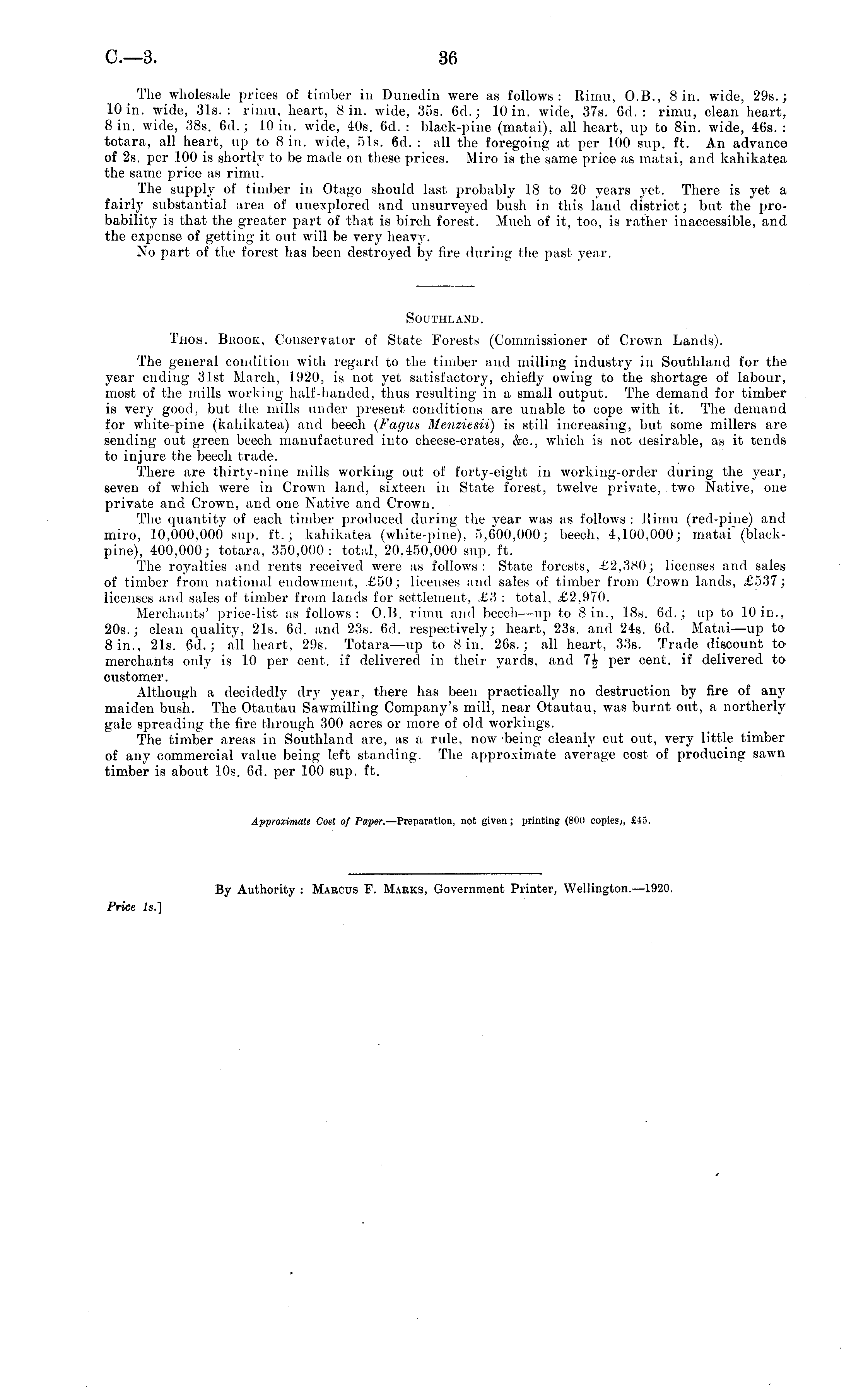 The wholesale prices of timber in Duuedin were as follows: Rimu, 0.8., Sin. wide, 295.; 10 in. wide, 315.: rimu, heart, 8 in. wide, 355. 6d.; 10 in. wide, 375. 6d. : rimu, clean heart, 8 in. wide, 38s. 6d.; 10 in, wide, 40s. 6d. : black-pine (matai), all heart, up to Bin. wide, 465. : totara, all heart, up to 8 in. wide, 51s. 6d. : all the foregoing at per 100 sup. ft. An advance of 2s. per 100 is shortly to be made on these prices. Miro is the same price as matai, and kahikatea the same price as rimu. The supply of timber in Otago should last probably 18 to 20 years yet. There is yet a fairly substantial area of unexplored and unsurveyed bush in this land district; but the probability is that the greater part of that is birch forest. Much of it, too, is rather inaccessible, and the expense of getting it out. will be very heavy. No part of the forest has been destroyed by fire during the past year. Southland. Thos. Buook, Conservator of State Forests (Commissioner of Crown Lands). The general condition with regard to the timber and milling industry in Southland for the year ending 31st March, 1920, is not yet satisfactory, chiefly owing to the shortage of labour, most of the mills working half-handed, thus resulting in a small output. The demand for timber is very good, but the mills under present conditions are unable to cope with it. The demand for white-pine (kahikatea) and beech {Fagus Menziesii) is still increasing, but some millers are sending out green beech manufactured into cheese-crates, &c, which is not desirable, as it tends to injure the beech trade. There are thirty-nine mills working out of forty-eight in working-order during the year, seven of which were in Crown land, sixteen in State forest, twelve private, two Native, one private and Crown, and one Native and Crown. The quantity of each timber produced during the year was as follows : Rimu (red-pine) and miro, 10,000,000 sup. ft.; kahikatea (white-pine), 5,600,000; beech, 4,100,000; matai" (blackpine), 400,000; totara, 350,000: total, 20,450,000 sup. ft. The royalties and rents received were as follows: State forests, £2,380; licenses and sales of timber from national endowment, £50; licenses and sales of timber from Crown lands, £537; licenses and sales of timber from lands for settlement, £3 : total, £2,970. Merchants' price-list as follows: 0.8. rimu and beech —up to 8 in., 18s. 6d.; up to 10 in.,. 205.; clean quality, 21s. 6d. and 235. 6d. respectively; heart, 235. and 245. 6d. Matai —up to 8 in., 21s. 6d.; all heart, 295. Totara—up to 8 in. 265.; all heart, 335. Trade discount to merchants only is 10 per cent, if delivered in their yards, and 7| per cent, if delivered to customer. Although a decidedly dry year, there has been practically no destruction by fire of any maiden bush. The Otautau Sawmilling Company's mill, near Otautau, was burnt out, a northerly gale spreading the fire through 300 acres or more of old workings. The timber areas in Southland are, as a rule, now being cleanly cut out, very little timber of any commercial value being left standing. The approximate average cost of producing sawn timber is about 10s. 6d. per 100 sup. ft.