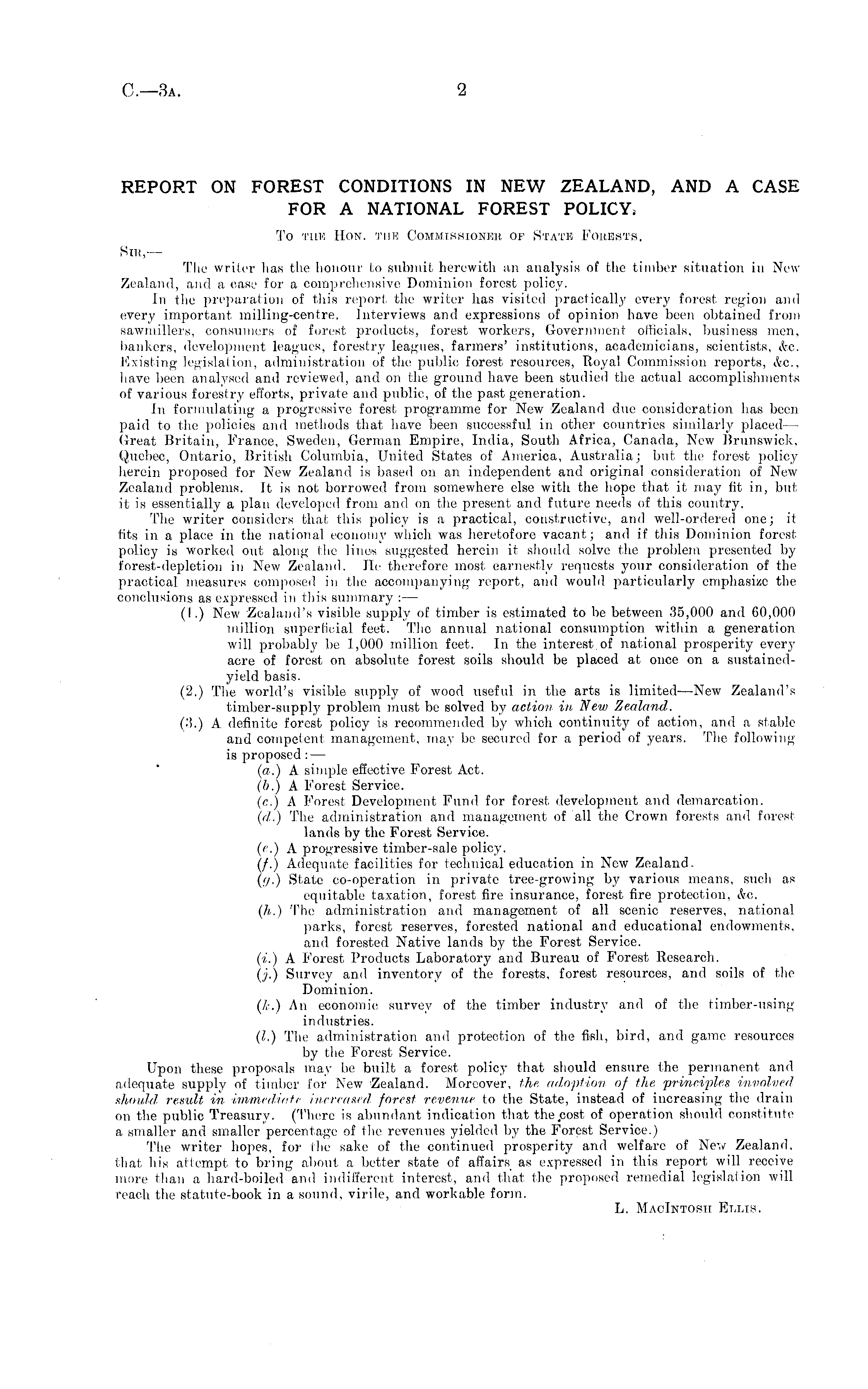REPORT ON FOREST CONDITIONS IN NEW ZEALAND, AND A CASE FOR A NATIONAL FOREST POLICY. To Tiii'; Hon. the Commissioner of Statu Forests. Sir — The writer has the honour to submit herewith an analysis of the timber situation in New Zealand, and a case for a comprehensive Dominion forest policy. In the preparation of this report the writer has visited practically every forest region and every important milling-centre. Interviews and expressions of opinion have been obtained from sawmillers, consumers of forest products, forest workers, Government officials, business men. bankers, development leagues, forestry leagues, farmers' institutions, academicians, scientists, &c. Existing legislation, administration of the public forest resources, Royal Commission reports, &c, have been analysed and reviewed, and on the ground have been studied the actual accomplishments of various forestry efforts, private and public, of the past generation. hi formulating a progressive forest programme for New Zealand due consideration, has been paid to the policies and methods that have been successful in other countries similarly placed— Great Britain, France, Sweden, German Empire, India, South Africa, Canada, New Brunswick, Quebec, Ontario, British Columbia, United States of America, Australia; but the forest policy herein proposed for New Zealand is based on an independent and original consideration of New Zealand problems. It is not borrowed from somewhere else with the hope that it may fit in, but it is essentially a plan developed from and on the present and future needs of this country. The writer considers that this policy is a practical, constructive, and well-ordered one; it tits in a place in the national economy which was heretofore vacant; and if this Dominion forest policy is worked out along the lines suggested herein it should solve the problem presented by forest-depletion in New Zealand. He therefore most earnestly requests your consideration of the practical measures composed in the accompanying report, and would particularly emphasize the conclusions as expressed in this summary : — (I.) New 'Zealand's visible supply of timber is estimated to be between 35,000 and 60,000 million superficial feet. The annual national consumption within a generation will probably be 1,000 million feet. In the interest of national prosperity every acre of forest on absolute forest soils should be placed at once on a sustainedyield basis. (2.) The world's visible supply of wood useful in the arts is limited —New Zealand's timber-supply problem must be solved by action in New Zealand. (•'>.) A definite forest policy is recommended by which continuity of action, and a stable and competent management, may be secured for a period of years. The following is proposed : — (a.) A simple effective Forest Act. (b.) A Forest Service. (c.) A Forest Development Fund for forest development and demarcation. (d.) The administration and management of all the Crown forests and forest lands by the Forest Service. (c.) A progressive timber-sale policy. (/.) Adequate facilities for technical education in New Zealand - Iff.) State co-operation in private tree-growing by various means, such as equitable taxation, forest fire insurance, forest fire protection, Arc. (h.) The administration and management of all scenic reserves, national parks, forest reserves, forested national and educational endowments, and forested Native lands by the Forest Service. (*.) A Forest Products Laboratory and Bureau of Forest Research. (j.) Survey and inventory of the forests, forest resources, and soils of the Dominion. (7c.) An economic survey of the timber industry and of the timber-using industries. (/.) The administration and protection of the fish, bird, and game resources by the Forest Service. Upon these proposals may be built a forest policy that should ensure the permanent and adequate supply of timber for New 'Zealand. Moreover, the adopt ion of the principles involved should result in immediate increased- forest revenue to the State, instead of increasing the drain on the public Treasury. (There is abundant indication that the .cost of operation should constitute a smaller and smaller percentage of the revenues yielded by the Forest Service.) The writer hopes, for the sake of the continued prosperity and welfare of New Zealand. that his attempt to bring about a better state of affairs as expressed in tin's report will receive more than a hard-boiled and indifferent interest, and that the proposed remedial legislation will reach the statute-book in a sound, virile, and workable form. L. Maolntosh Et.lts.