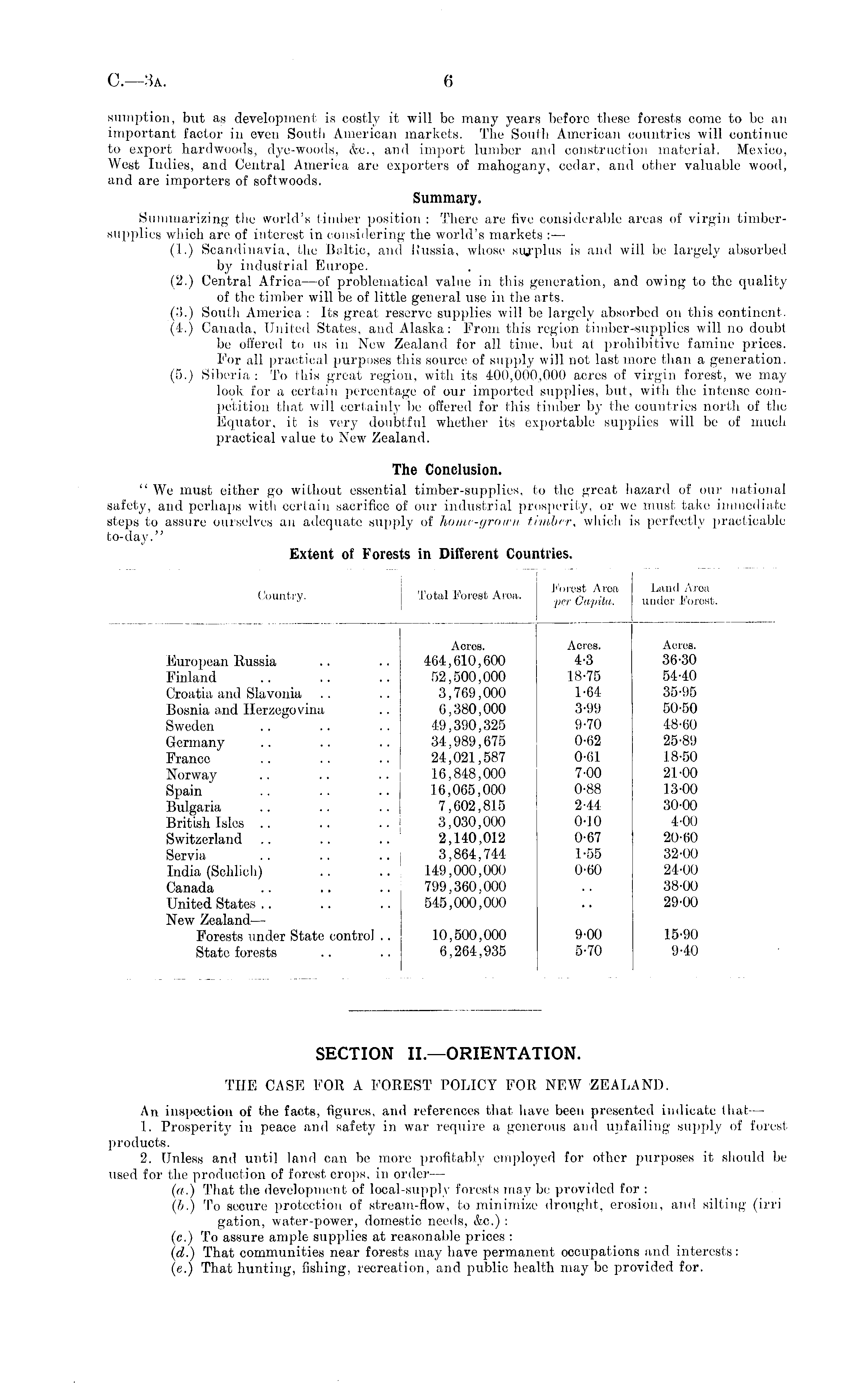 SECTION lI.—ORIENTATION. THE CASE FOR A FOREST POLICY FOR NEW ZEALAND. An inspection of the facts, figures, and references that have been presented indicate that— 1. Prosperity in peace and safetj' in war require a generous and unfailing supply of forest products. 2. Unless and until land can be more profitably employed for other purposes it should be used for the production of forest crops, in order — (as.) That the development of local-supply forests may be provided for : (b.) To secure protection of stream-flow, to minimize drought, erosion, and silting (irri gation, water-power, domestic needs, &c.) : (c.) To assure ample supplies at reasonable prices : (d.) That communities near forests may have permanent occupations and interests: (c.) That hunting, fishing, recreation, and public health may be provided for.