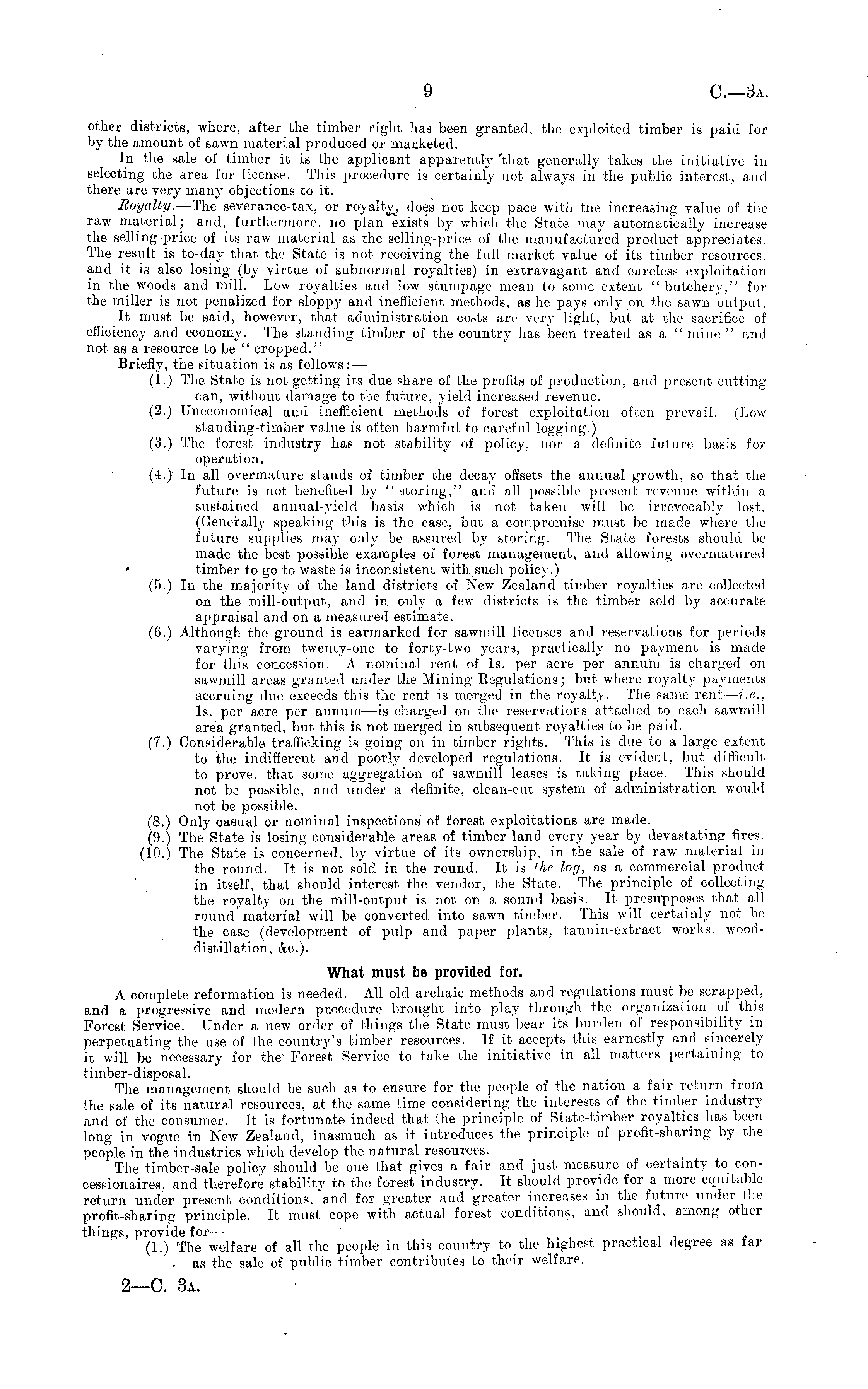 other districts, where, after the timber right has been granted, the exploited timber is paid for by the amount of sawn material produced or marketed. In the sale of timber it is the applicant apparently 'that generally takes the initiative in selecting the area for license. This procedure is certainly not always in the public interest, and there are very many objections to it. lloyalty. —The severance-tax, or does not keep pace with the increasing value of the raw material; and, furthermore, no plan exists by which the State may automatically increase the selling-price of its raw material as the selling-price of the manufactured product appreciates. The result is to-day that the State is not receiving the full market value of its timber resources, and it is also losing (by virtue of subnormal royalties) in extravagant and careless exploitation in the woods and mill. Low royalties and low stumpage mean to some extent " butchery," for the miller is not penalized for sloppy and inefficient methods, as he pays only on the sawn output. It must be said, however, that administration costs are very light, but at the sacrifice of efficiency and economy. The standing timber of the country has been treated as a "mine" and not as a resource to be " cropped." Briefly, the situation is as follows : — (1.) The State is not getting its due share of the profits of production, and present cutting can, without damage to the future, yield increased revenue. (2.) Uneconomical and inefficient methods of forest exploitation often prevail. (Low standing-timber value is often harmful to careful logging.) (3.) The forest industry has not stability of policy, nor a definite future basis for operation. (4.) In all overmature stands of timber the decay offsets the annual growth, so that the future is not benefited by " storing," and all possible present revenue within a sustained annual-yield basis which is not taken will be irrevocably lost. (Generally speaking this is the case, but a compromise must be made where the future supplies may only be assured by storing. The State forests should be made the best possible examples of forest management, and allowing overmatured • timber to go to waste is inconsistent with such policy.) (5.) In the majority of the land districts of New Zealand timber royalties arc collected on the mill-output, and in only a few districts is the timber sold by accurate appraisal and on a measured estimate. (6.) Although the ground is earmarked for sawmill licenses and reservations for periods varying from twenty-one to forty-two years, practically no payment is made for this concession. A nominal rent of Is. per acre per annum is charged on sawmill areas granted under the Mining Regulations; but where royalty payments accruing due exceeds this the rent is merged in the royalty. The same rent — i.e., Is. per acre per annum —is charged on the reservations attached to each sawmill area granted, but this is not merged in subsequent royalties to be paid. (7.) Considerable trafficking is going on in timber rights. This is due to a large extent to the indifferent and poorly developed regulations. It is evident, but difficult to prove, that some aggregation of sawmill leases is taking place. This should not be possible, and under a definite, clean-cut system of administration would not be possible. (8.) Only casual or nominal inspections of forest exploitations are made. (9.) The State is losing considerable areas of timber land every year by devastating fires. (10.) The State is concerned, by virtue of its ownership, in the sale of raw material in the round. It is not sold in the round. It is the log, as a commercial product in itself, that should interest the vendor, the State. The principle of collecting the royalty on the mill-output is not on a sound basis. It presupposes that all round material will be converted into sawn timber. This will certainly not be the case (development of pulp and paper plants, tannin-extract works, wooddistillation, ore). What must be provided for. A. complete reformation is needed. All old archaic methods and regulations must be scrapped, and a progressive and modern procedure brought into play through the organization of this Forest Service. Under a now order of things the State must bear its burden of responsibility in perpetuating the use of the country's timber resources. Tf it accepts this earnestly and sincerely it will be necessary for the Forest Service to take the initiative in all matters pertaining to timber-disposal. The management should be such as to ensure for the people of the nation a fair return from the sale of its natural resources, at the same time considering the interests of the timber industry and of the consumer. Tt is fortunate indeed that the principle of State-timber royalties has been long in vogue in New Zealand, inasmuch as it introduces the principle of profit-sharing by the people in the industries which develop the natural resources. The timber-sale policy should be one that gives a fair and just measure of certainty to concessionaires, and therefore stability to the forest industry. It should provide for a more equitable return under present conditions,'and for greater and greater increases in the future under the profit-sharing principle. It must cope with actual forest conditions, and should, among other things, provide for — (1.) The welfare of all the people in this country to the highest practical degree as tar . as the sale of public timber contributes to their welfare,