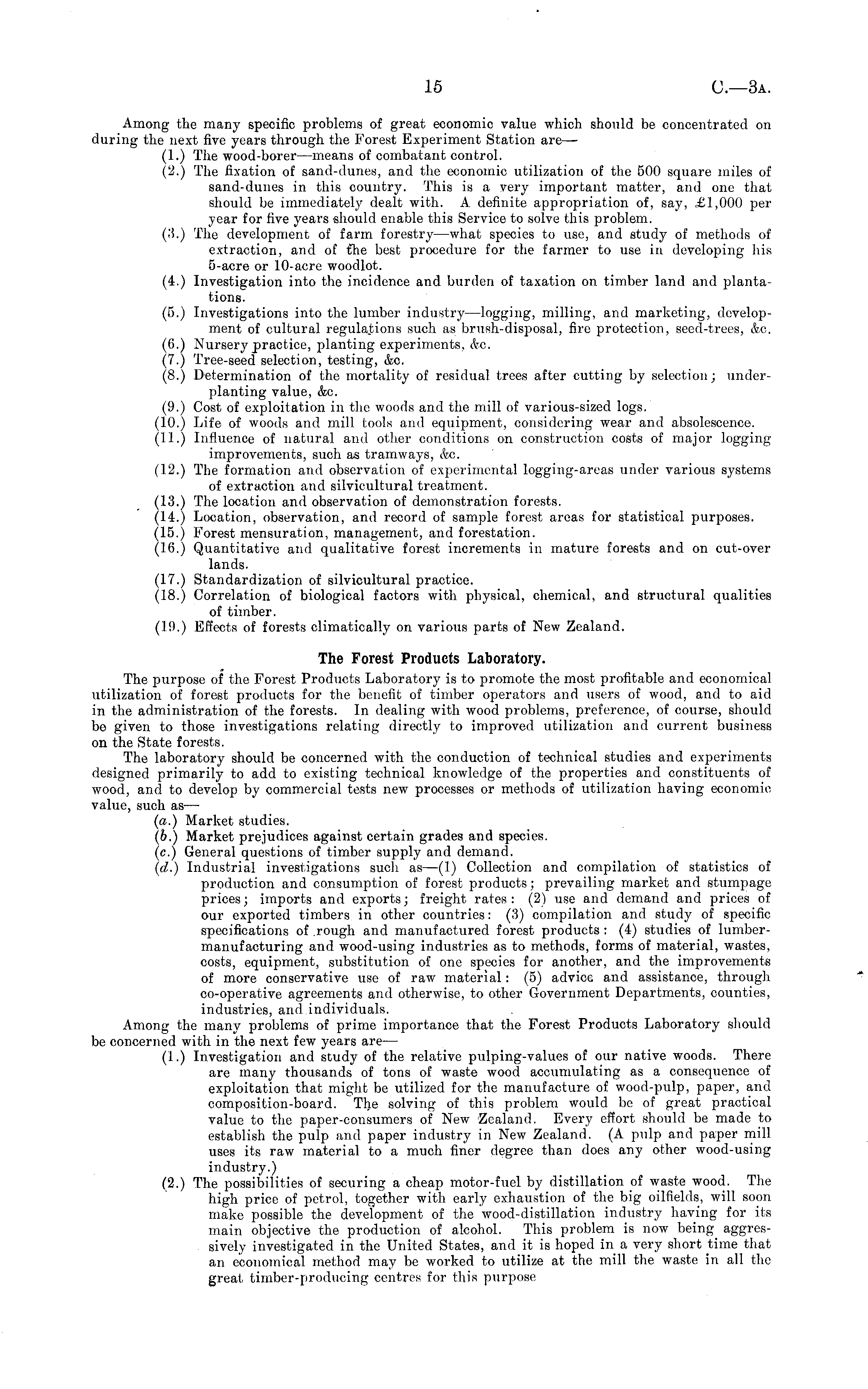 Among the many specific problems of great economic value which should be concentrated on during the next five years through the Forest Experiment Station are— (1.) The wood-borer —means of combatant control. (2.) The fixation of sand-dunes, and the economic utilization of the 500 square miles of sand-dunes in this country. This is a very important matter, and one that should be immediately dealt with. A definite appropriation of, say, £1,000 per year for five years should enable this Service to solve this problem. (3.) The development of farm forestry —what species to use, and study of methods of extraction, and of the best procedure for the farmer to use in developing his 5-acre or 10-acre woodlot. (4.) Investigation into the incidence and burden of taxation on timber land and plantations. (5.) Investigations into the lumber industry —logging, milling, and marketing, development of cultural regulations such as brush-disposal, fire protection, seed-trees, &c. (6.) Nursery practice, planting experiments, (fee. (7.) Tree-seed selection, testing, &c. (8.) Determination of the mortality of residual trees after cutting by selection; underplanting value, cfec. (9.) Cost of exploitation in the woods and the mill of various-sized logs. (10.) Life of woods and mill tools and equipment, considering wear and absolescenco. (11.) Influence of natural and other conditions on construction costs of major logging improvements, such as tramways, (fee. (12.) The formation and observation of experimental logging-areas under various systems of extraction and silvicultural treatment. (13.) The location and observation of demonstration forests. (14.) Location, observation, and record of sample forest areas for statistical purposes. (15.) Forest mensuration, management, and forestation. (16.) Quantitative and qualitative forest increments in mature forests and on cut-over lands. (17.) Standardization of silvicultural practice. (18.) Correlation of biological factors with physical, chemical, and structural qualities of timber. (19.) Effects of forests climatically on various parts of New Zealand. The Forest Products Laboratory. The purpose of the Forest Products Laboratory is to promote the most profitable and economical utilization of forest products for the benefit of timber operators and users of wood, and to aid in the administration of the forests. In dealing with wood problems, preference, of course, should be given to those investigations relating directly to improved utilization and current business on the State forests. The laboratory should bo concerned with the conduction of technical studies and experiments designed primarily to add to existing technical knowledge of the properties and constituents of wood, and to develop by commercial tests new processes or methods of utilization having economic value, such as — (a.) Market studies. (6.) Market prejudices against certain grades and species, (c.) General questions of timber supply and demand. (d.) Industrial investigations such as —(1) Collection and compilation of statistics of production and consumption of forest products; prevailing market and stumpage prices; imports and exports; freight rates : (2) use and demand and prices of our exported timbers in other countries: (3) compilation and study of specific specifications of .rough and manufactured forest products : (4) studies of lumbermanufacturing and wood-using industries as to methods, forms of material, wastes, costs, equipment, substitution of one species for another, and the improvements of more conservative use of raw material: (5) advice and assistance, through co-operative agreements and otherwise, to other Government Departments, counties, industries, and individuals. Among the many problems of prime importance that the Forest Products Laboratory should be concerned with in the next few years are — (I.) Investigation and study of the relative pulping-values of our native woods. There are many thousands of tons of waste wood accumulating as a consequence of exploitation that might be utilized for the manufacture of wood-pulp, paper, and composition-board. The solving of this problem would be of great practical value to the paper-consumers of New Zealand. Every effort should be made to establish the pulp and paper industry in New Zealand. (A pulp and paper mill uses its raw material to a much finer degree than does any other wood-using industry.) (2.) The possibilities of securing a cheap motor-fuel by distillation of waste wood. The high price of petrol, together with early exhaustion of the big oilfields, will soon make possible the development of the wood-distillation industry having for its main objective the production of alcohol. This problem is now being aggressively investigated in the United States, and it is hoped in a very short time that an economical method may be worked to utilize at the mill the waste in all the great timber-producing centres for this purpose