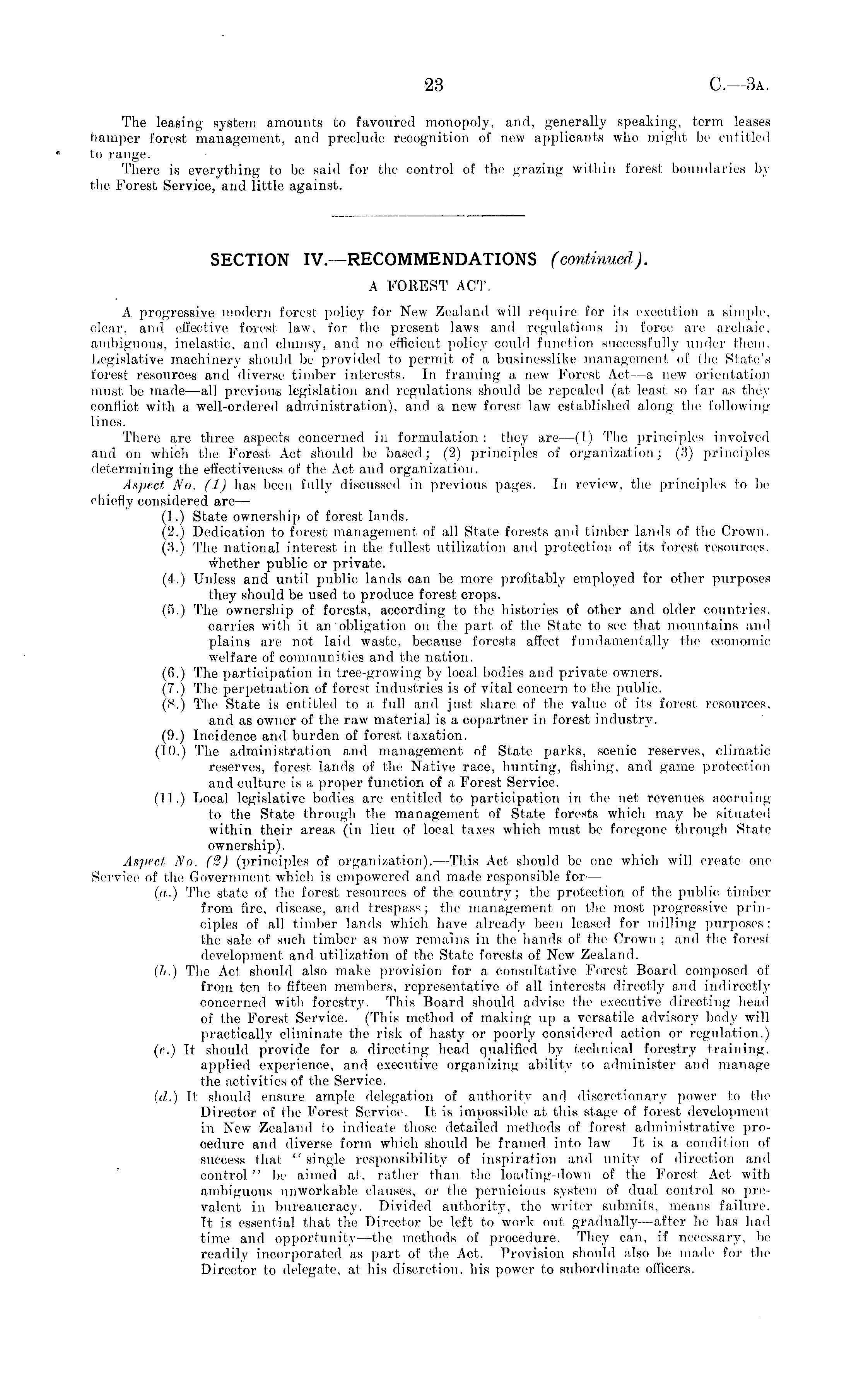 SECTION IV.—RECOMMENDATIONS (continued). A FOREST ACT. A progressive modern forest policy for New Zealand will require for its execution a simple, clear, and effective forest law, for the present laws and regulations in force are archaic, ambiguous, inelastic, and clumsy, and no efficient policy could function successfully under thorn. Legislative machinery should be provided to permit of a businesslike management of the State's forest resources and diverse timber interests. In framing a new Forest Act—a new orientation must bo made —all previous legislation and regulations should be repealed (at least so far as they conflict with a well-ordered administration), and a new forest law established along the following lines. There are three aspects concerned in formulation: they are —(I) The principles involved and on which the Forest Act should be based; (2) principles of organization; (3) principles determining the effectiveness of the Act and organization. Aspect No. (1) has been fully discussed in previous pages. In review, the principles to be chiefly considered are — (1.) State ownership of forest lands. (2.) Dedication to forest management of all State forests and limber lands of the Crown. (3.) The national interest in the fullest utilization and protection of its forest resources, whether public or private. (4.) Unless and until public lands can be more profitably employed for other purposes they should be used to produce forest crops. (5.) The ownership of forests, according to the histories of other and older countries, carries with it an obligation on the part of the Slate to see that mountains and plains are not laid waste, because forests affect fundamentally the economic welfare of communities and the nation. (6.) The participation in tree-growing by local bodies and private owners. (7.) The perpetuation of forest industries is of vital concern to the public. (8.) The State is entitled to a full and just share of the value of its forest resources, and as owner of the raw material is a copartner in forest industry. (9.) Incidence and burden of forest taxation. (10.) The administration and management of State parks, scenic reserves, climatic reserves, forest lands of the Native race, hunting, fishing, and game protection and culture is a proper function of a Forest Service. (11.) Local legislative bodies are entitled to participation in the net revenues accruing to the State through the management of State forests which may be situated within their areas (in lieu of local taxes which must be foregone through State ownership). Aspect No. (2) (principles of organization). —This Act should be one which will create one Service of the Government which is empowered and made responsible for — (a.) The state of the forest resources of the country; the protection of the public timber from fire, disease, and trespass; the management on the most progressive principles of all timber lands which have already been leased for milling purposes ; the sale of such timber as now remains in the hands of the Crown ; and the forest development and utilization of the State forests of New Zealand. (6.) The Act should also make provision for a consultative forest Board composed of from ten to fifteen members, representative of all interests directly and indirectly concerned with forestry. This Board should advise the executive directing head of the Forest Service. (This method of making up a versatile advisory body will practically eliminate the risk of hasty or poorly considered action or regulation.) (c.) It should provide for a directing head qualified by technical forestry training, applied experience, and executive organizing ability to administer and manage the activities of the Service. (d.) It should ensure ample delegation of authority and discretionary power to the Director of the Forest Service. It is impossible at this stage of forest development in New 'Zealand to indicate those detailed methods of Pores! administrative procedure and diverse form which should be framed into law Tt is a condition of success that " single responsibility of inspiration and unity of direction and control " be aimed at, rather than the loading-down of the Forest Act with ambiguous unworkable clauses, or the pernicious system of dual control so prevalent in bureaucracy. Divided authority, the writer submits, means failure. Tt is essential that the Director be left to work out gradually—after he has had time and opportunity —the methods of procedure. They can, if necessary, be readily incorporated as part of the Act. Provision should also be made for the Director to delegate, at his discretion, his power to subordinate officers.