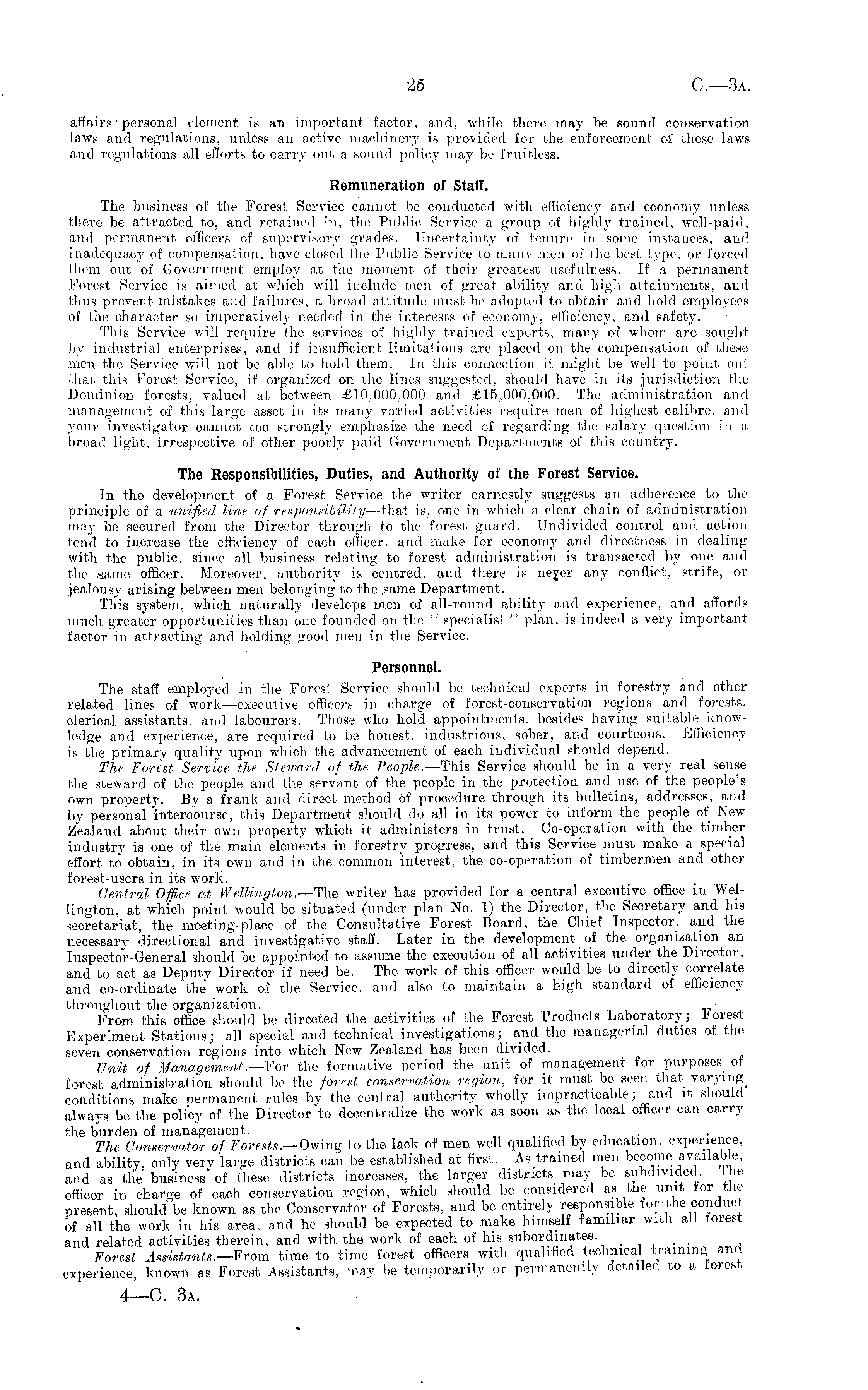 affairs' personal clement is an important factor, and, while there may be sound conservation laws and regulations, unless an active machinery is provided for the enforcement of these laws and regulations all efforts to carry out a sound policy may be fruitless. Remuneration of Staff. The business of the Forest Service cannot be conducted with efficiency and economy unless there be attracted to, and retained in, the Public Service a group of highly trained, well-paid, and permanent officers of supervisory grades. Uncertainty of tenure in some instances, and inadequacy of compensation, have closed the Public Service to many men of the best type, or forced them out of Government employ at the moment of their greatest usefulness. If a permanent Forest Service is aimed at which, will include men of great ability and high attainments, and 1 litis prevent mistakes and failures, a broad attitude must be adopted to obtain and hold employees of the character so imperatively needed in the interests of economy, efficiency, and safety. This Service will require the services of highly trained experts, many of whom are sought by industrial enterprises, and if insufficient limitations are placed on the compensation of these men the Service will not be able to hold them. In this connection it might be well to point out that this Forest Service, if organized on the lines suggested, should have in its jurisdiction the Dominion forests, valued at between £10,000,000 and ,£15,000,000. The administration and management of this large asset in its many varied activities require men of highest calibre, and your investigator cannot too strongly emphasize the need of regarding t\w. salary question in a, broad light, irrespective of other poorly paid Government Departments of this country. The Responsibilities, Duties, and Authority of the Forest Service. In the development of a Forest Service the writer earnestly suggests an adherence to the principle of a unified line of responsibility —that is, one in which a clear chain of administration may be secured from the Director through to the forest: guard. Undivided control and action tend to increase the efficiency of each officer, and make for economy and directness in dealing with the, public, since all business relating to forest administration is transacted by one and the same officer. Moreover, authority is centred, and there is never any conflict, strife, or jealousy arising between men belonging to the .same Department. This system, wdiich naturally develops men of all-round ability and experience, and affords much, greater opportunities than one founded on the " specialist " plan, is indeed a very important factor in attracting and holding good men in the Service. Personnel. The staff employed in the Forest Service should be technical experts in forestry and other related lines of work —executive officers in charge of forest-conservation regions and forests, clerical assistants, and labourers. Those who hold appointments, besides having suitable knowledge and experience, are required to be honest, industrious, sober, and courteous. Efficiency is the primary quality upon which the advancement of each individual should depend. The, Forest Service- the Steward of the People. —This Service should be in a very real sense the steward of the people and the servant of the people in the protection and use of the people's own property. By a frank and direct method of procedure through its bulletins, addresses, and by personal intercourse, this Department should do all in its power to inform the people of New Zealand about their own property which it administers in trust. Co-operation with the timber industry is one of the main elements in forestry progress, and this Service must make a special effort to obtain, in its own and in the common interest, the co-operation of tiinbermen and other forest-users in its work. Central Office at Wellington. —The writer has provided for a central executive office in Wellington, at which point would be situated (under plan No. 1) the Director, the Secretary and his secretariat, the meeting-place of the Consultative Forest Board, the Chief Inspector, and the necessary directional and investigative staff. Later in the development of the organization an Inspector-General should be appointed to assume the execution of all activities under the Director, and to act as Deputy Director if need be. The work of this officer would be to directly correlate and co-ordinate the work of the Service, and also to maintain a high standard of efficiency throughout the organization. From this office should be directed the activities of the Forest Products Laboratory; borest Experiment Stations; all special and technical investigations; _ and the managerial duties of the seven conservation regions into which New Zealand has been divided. Unit of Management.— -For the formative period the unit of management for purposes of forest administration should be the forest conservation region, for it must be seen that varying conditions make permanent rules by the central authority wholly impracticable; and it should always be the policy of the Director to decentralize the work as soon as the local officer can carry the burden of management. ~-,.• The Conservator of Forests.— Owing to the lack of men well qualified by education, experience, and ability, only very large districts can be established at first, As trained men become available, and as the business' of these districts increases, the larger districts may be subdivided. Ibe officer in charge of each conservation region, which should be considered as the unit tor the present, should be known as the Conservator of Forests, and be entirely responsible for the conduct of all the work in his area, and he should be expected to make himself familiar with all forest and related activities therein, and with the work of each of his subordinates ...... , Forest Assistants.— -From time to time fore
