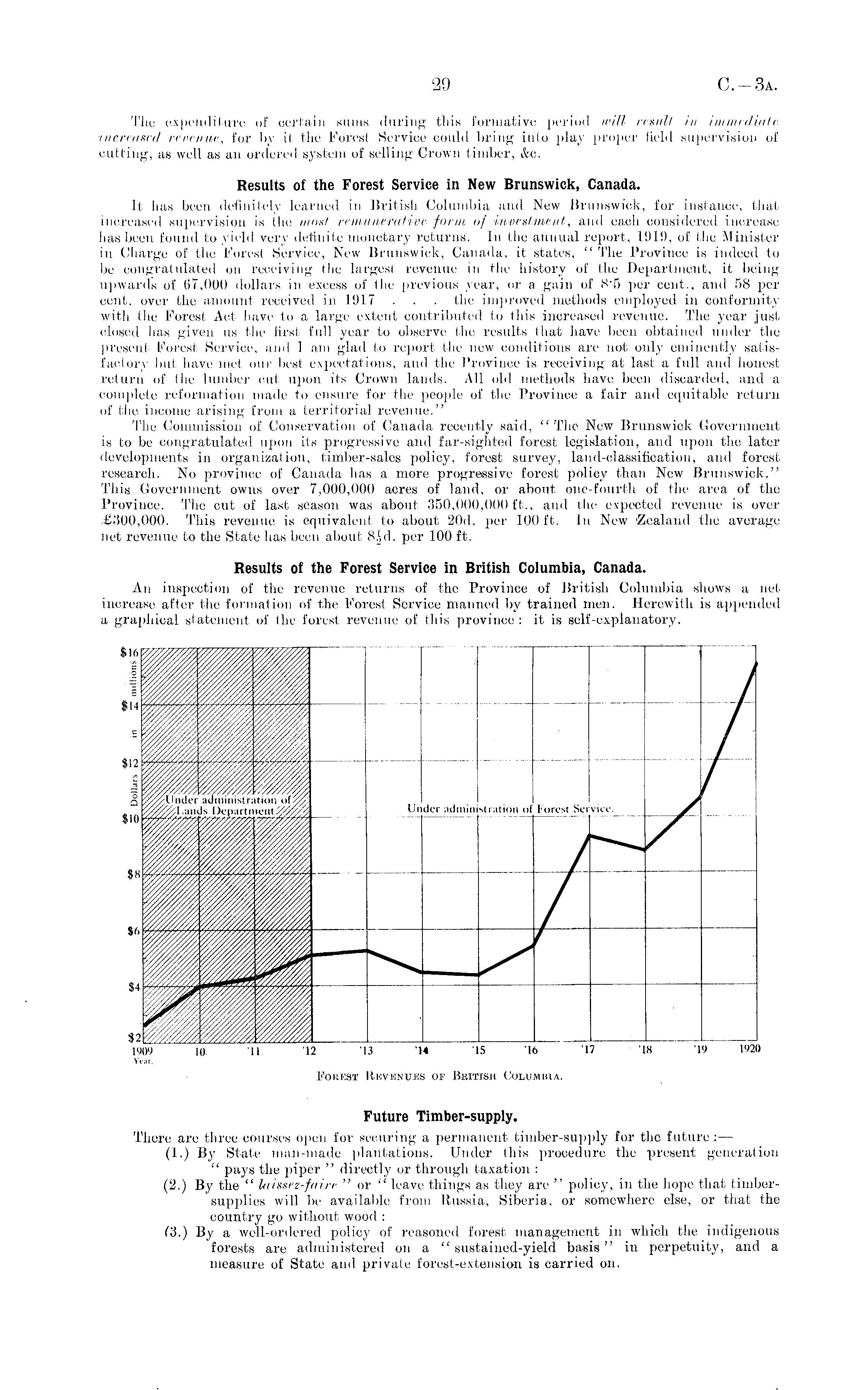 The expenditure of certain sums during this formative period will result in immediate increased revenue, for by it the Foresf Service could bring into play proper field supervision of cutting, as well as an ordered system of selling Crown timber, &o. Results of the Forest Service in New Brunswick, Canada. It has been definitely learned in British Columbia and New Brunswick, for instance, thai increased supervision is the most remunerative form of investment, and each considered increase has been found to yield very definite monetary returns. In the annual report, 1919, of the Minister in Charge of the Forest Service, New Brunswick, Canada, it states, " The Province is indeed to be congratulated on receiving the largest revenue in the history of the Department, it being upwards of 67,000 dollars in excess of the previous year, or a gain of B's per cent., and 58 per cent, over the amount received in 1917 . . . the improved methods employed in conformity with the Forest Act have to a large extent contributed to this increased revenue. The year just (dosed has given us the first full year to observe the results that have been obtained under the present Forest Service, and 1 am glad to report the new conditions are not only eminently satisfactory but. have met our best expectal ions, and the Province is receiving at last a full and honest return of the lumber out upon its Crown lands. All old methods have been discarded, and a complete reformation made to ensure for the people of the Province a fair and equitable return of the income arising from a territorial revenue." The Commission of Conservation of Canada recently said, "The New Brunswick Government is to be congratulated upon its progressive and far-sighted forest legislation, and upon the later developments in organization, timber-sales policy, forest survey, land-classification, and forest research. No province of Canada has a more progressive forest policy than New Brunswick." This Government owns over 7,000,000 acres of land, or about one-fourth of the area of the Province. The cut of last season was about 350,000,000 ft., and the expected revenue is over .£,100,000. This revenue is equivalent to about 20d. per 100 ft. In New 'Zealand the average net revenue to the State hits been about BJd. per 100 ft. Results of the Forest Service in British Columbia, Canada. An inspection of the revenue returns of the Province of British Columbia shows a net increase after the formation of the Forest Service manned by trained men. Herewith is appended a graphical statement of the forest revenue of this province: it is self-explanatory.