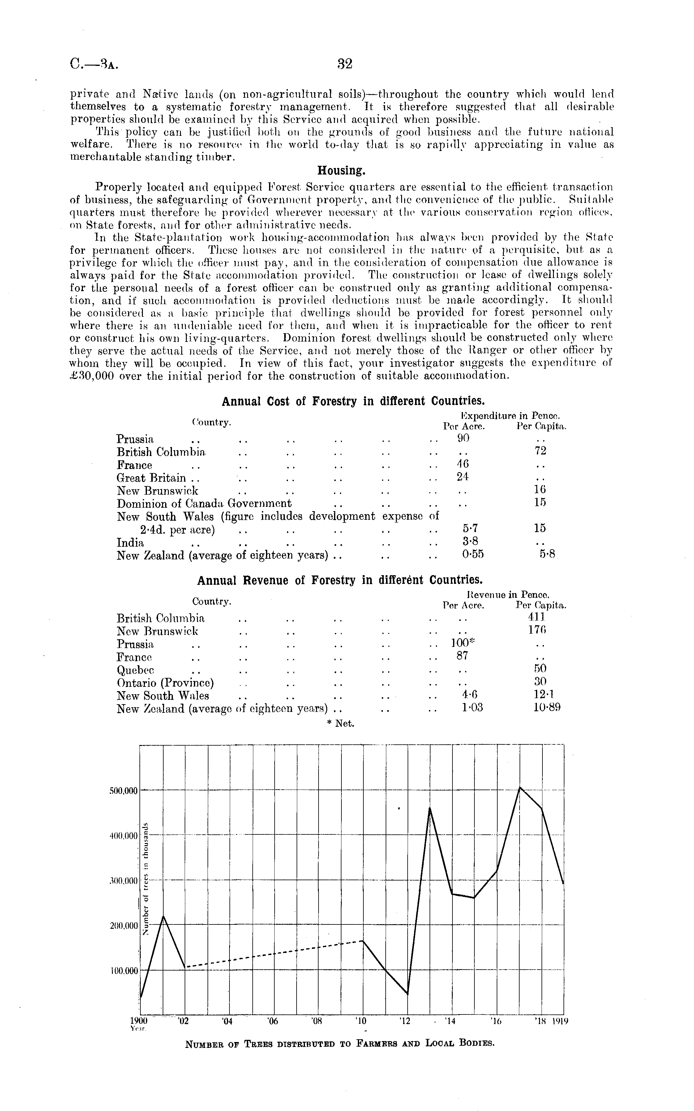 private and Native lands (on non-agricultural soils) —throughout the country which would lend themselves to a systematic forestry management. It is therefore suggested that all desirable properties should be examined by this Service and acquired when possible. This policy can be justified both on the grounds of good business and the future national welfare. There is no resource in the world to-day that is so rapidly appreciating in value as merchantable standing timber. Housing. Properly located and equipped Forest Service quarters are essential to the efficient transaction of business, the safeguarding of Government property, and the convenience of the public. Suitable cpiarters must therefore be provided wherever necessary at the various conservation region offices, on State forests, and for other administrative needs. In the State-plantation work housing-accommodation has always been provided by the State for permanent officers. These houses are not considered in the nature of a perquisite, but as a privilege for which the officer must pay, and in the consideration of compensation due allowance is always paid for the Slate accommodation provided. The construction or lease of dwellings solely for the personal needs of a forest officer can be construed only as granting additional compensation, and if such accommodation is provided deductions must be made accordingly. It should be considered as n basic principle thai dwellings should be provided for forest personnel only where there is an undeniable need for them, and when it is impracticable for the officer to rent or construct his own living-quarters. Dominion forest dwellings should be constructed only where they serve the actual needs of the Service, and not merely those of the Ranger or other officer by whom they will be occupied. In view of this fact, your investigator suggests the expenditure of £30,000 over the initial period for the construction of suitable accommodation. Annual Cost of Forestry in different Countries. Expenditure in Pence. ' °" ntr y- p or Acre. Per Capita. Prussia .. .. .. .. .. 90 British Columbia. .. .. .. . . .... 72 France .. .. .. .. .. 46 Great Britain .. .. .. .. .. 24 New Brunswick .. . . . . .. .... 16 Dominion of Canada Government .. .. .... 15 New South Wales (figure includes development expense of 2-4 d. per acre) .. .. .. .. .. 5-7 15 India .. .. .. .. .. .. 3-8 New Zealand (average of eighteen years) .. .. .. 0-55 5-8 Annual Revenue of Forestry in different Countries. Revenue in Pence. Country. ~,„. Acre Por Capita. British Columbia .. .. .. .. .... 411 New Brunswick .. .. .. .. ■■ .. 176 Prussia .. .. .. .. .. .. 100* France .. .. .. .. •. .. 87 Quebec . . .. . . .. .. .... 50 Ontario (Province) . . .. .. .. .... 30 New South Wales .. .. .. 4-6 12-1 New Zealand (average of eighteen years) .. .. .. 1-03 10-89