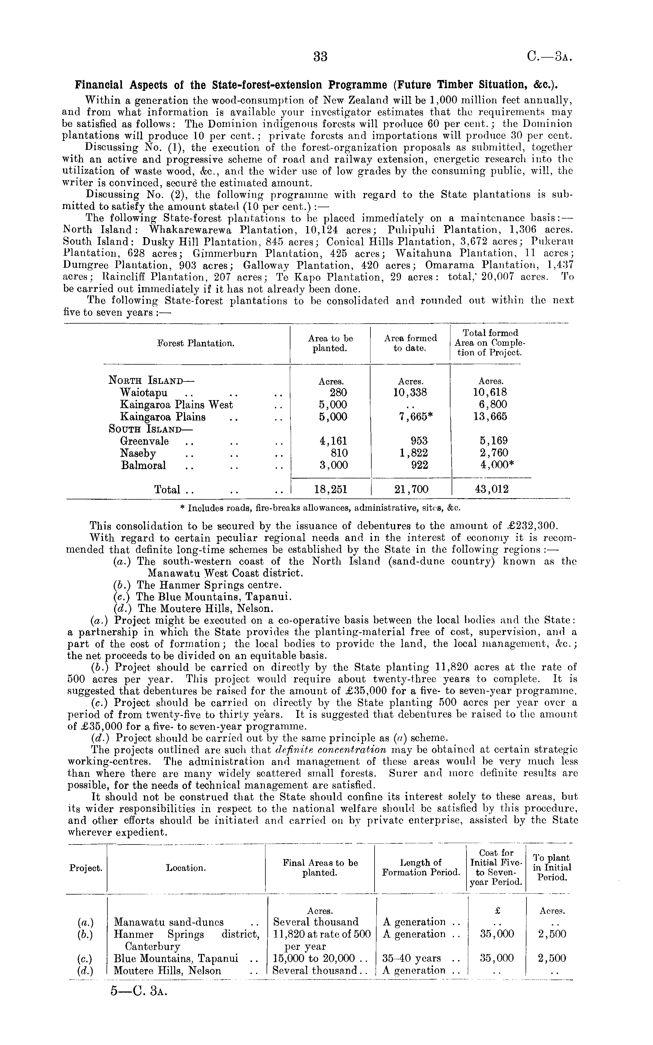 This consolidation to be secured by the issuance of debentures to the amount of £232,300. With regard to certain peculiar regional needs and in the interest of economy it is recommended that definite long-time schemes be established by the State in the following regions :— (a.) The south-western coast of the North Island (sand-dune country) known as the Manawatu West Coast district. (b.) The Hanmer Springs centre, (c.) The Blue Mountains, Tapanui. (d.) The Moutere Hills, Nelson. (a.) Project might be executed on a co-operative basis between the local bodies and the State: a partnership in which the State provides the planting-material free of cost, supervision, and a part of the cost of formation; the local bodies to provide the land, the local management, (fee; the net proceeds to be divided on an equitable basis. (6.) Project should be carried on directly by the State planting 11,820 acres at the rate of 500 acres per year. This project would require about twenty-three years to complete. It is suggested that debentures be raised for the amount of £35,000 for a five- to seven-year programme. (c.) Project should be carried on directly by the State planting 500 acres per year over a period of from twenty-five to thirty years. It is suggested that debentures be raised to the amount of £35,000 for a five- to seven-year programme. (d.) Project should be carried out by the same principle as (a) scheme. The projects outlined are such that definite, concentration may be obtained at certain strategic working-centres. The administration and management of these areas would be very much less than where there are many widely scattered small forests. Surer and more definite results are possible, for the needs of technical management are satisfied. It should not be construed that the State should confine its interest solely to these areas, but its wider responsibilities in respect to the national welfare should be satisfied by this procedure, and other efforts should be initiated and carried on by private enterprise, assisted by the State wherever expedient.
